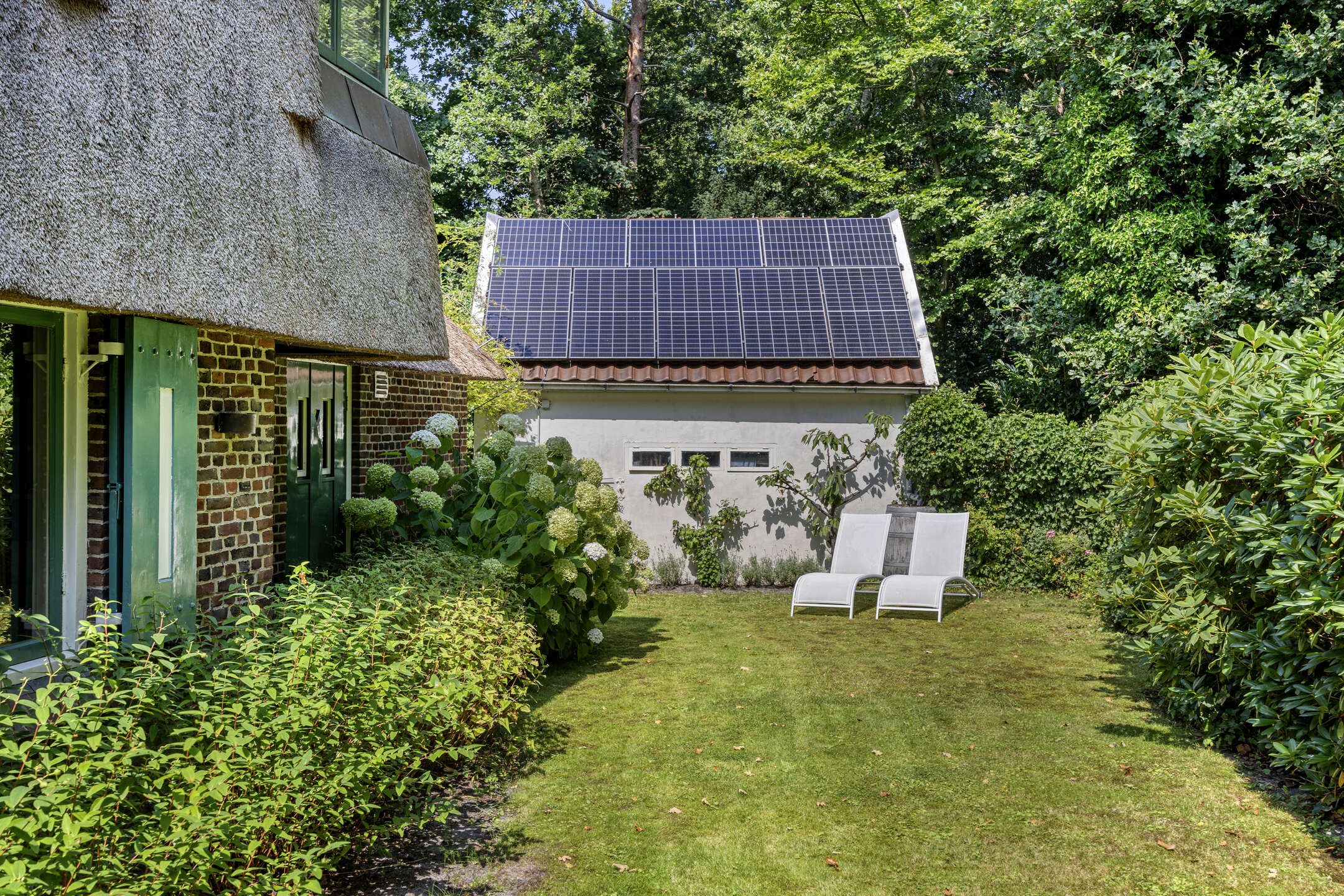De tuin van de villa is een prachtig groen geheel. Op het ruime perceel van 1.310 m² vindt u prachtige borders, volwassen bomen en meerdere zonnige én beschutte terrassen waar u op elk moment van de dag een fijn plekje vindt. De royale oprit biedt plek voor meerdere auto’s en voor de elektrische rijder is er een laadpaal met eigen tussenmeter, handig voor privé én zakelijk gebruik. Een bronpomp zorgt ervoor dat u de tuin eenvoudig met grondwater kunt besproeien. Daarnaast beschikt de woning over een ruime garage/schuur met 8 zonnepanelen op het dak!
