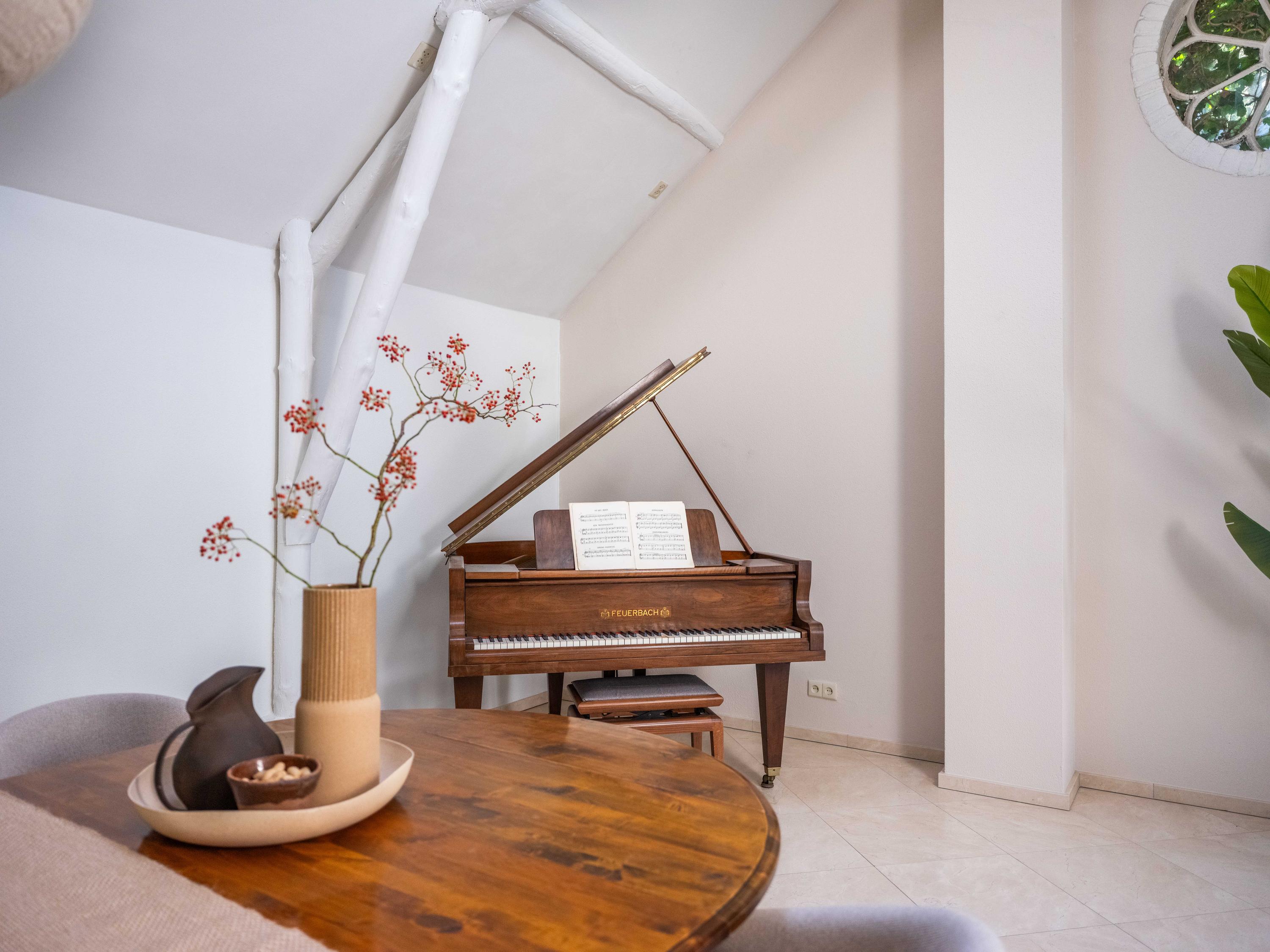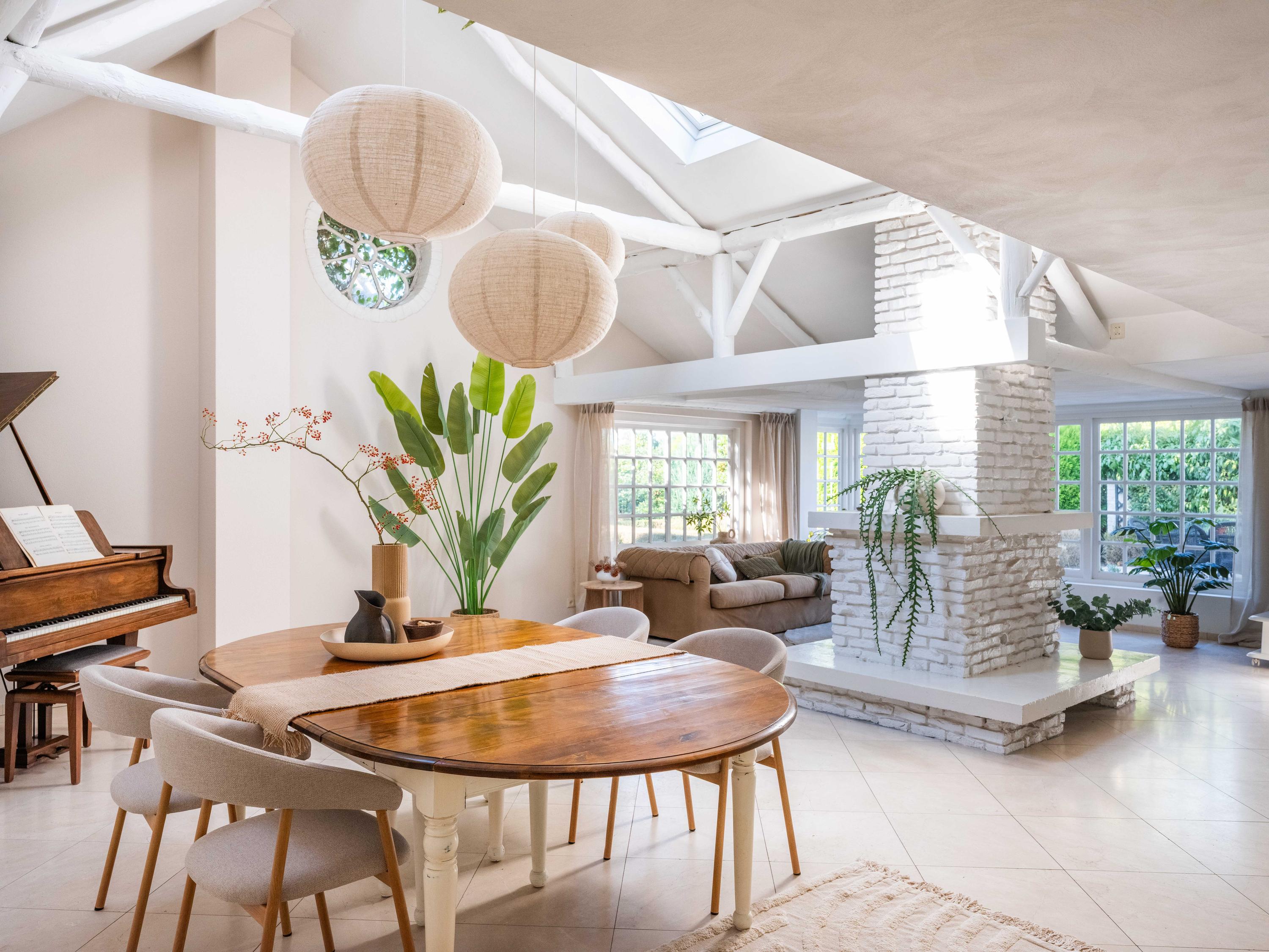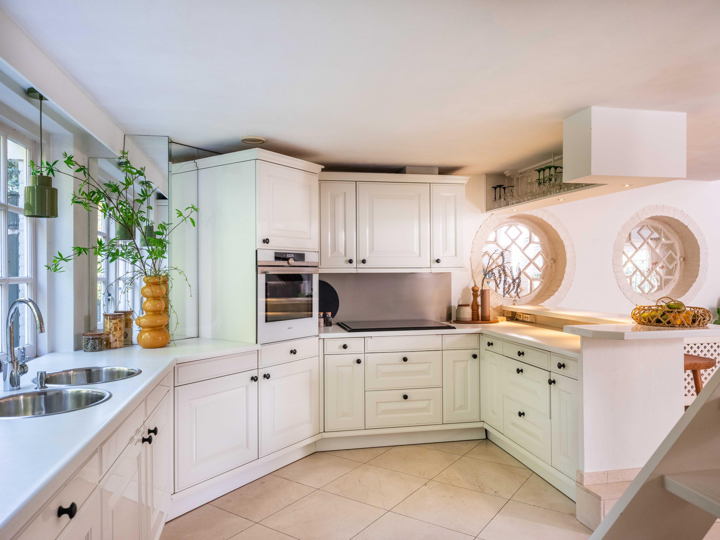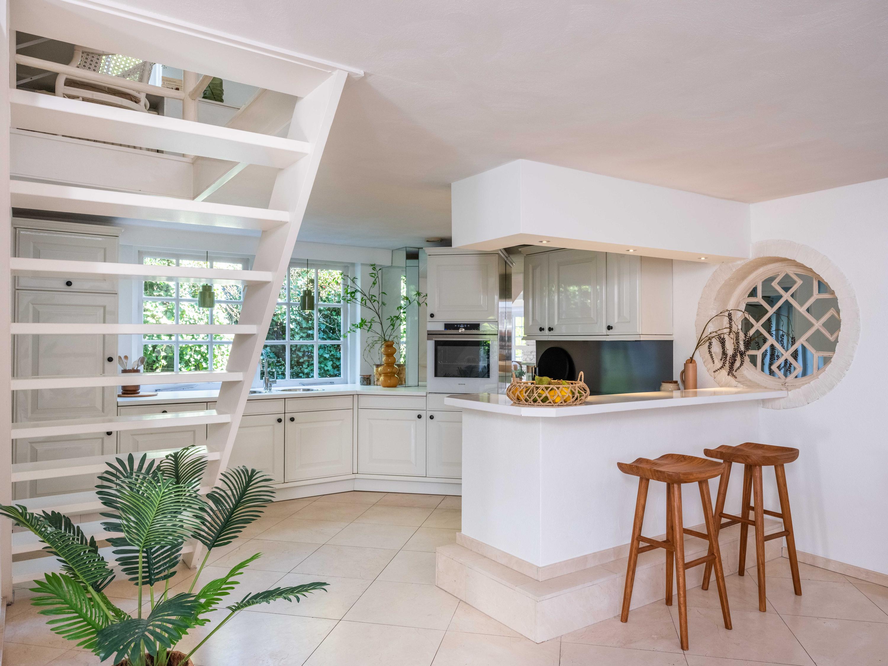 De royale living heeft centraal in de ruimte een gezellige gashaard (voorheen open haard). De ruimte is sfeervol met veel authentieke details: de houten balken in het zicht, een hoog plafond tot aan de nok en ronde glas-in-lood ramen. Links achterin vinden we de open keuken met inbouwapparatuur. Vanuit de keuken komen we in de bijkeuken met de aansluiting voor de wasmachine en wasdroger, de CV-opstelling en een deur naar buiten.