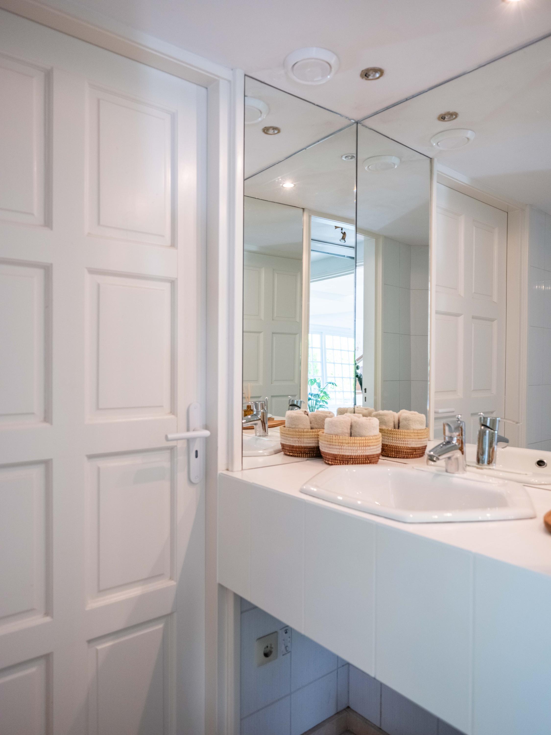 Op de eerste verdieping lopen we over de vide naar de slaapkamer. Deze kamer heeft vaste kasten en biedt toegang tot een ruim dakterras. Vanaf het terras weer een geweldig uitzicht. De badkamer op deze verdieping is verrassend ruim en modern (2018). Deze badkamer is voorzien van een ligbad, inloopdouche, dubbele wastafel en toilet.