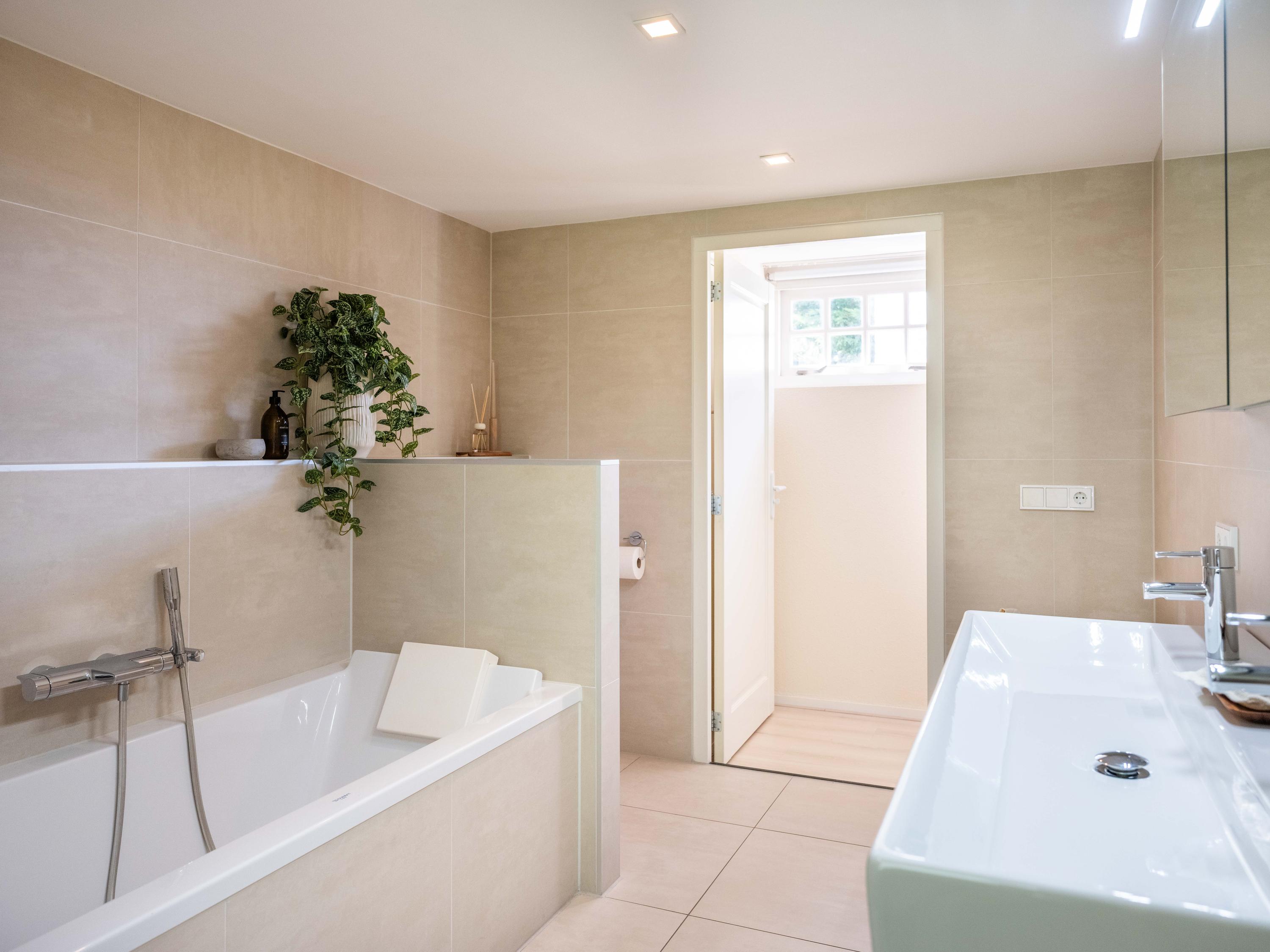 De diepe voortuin en tevens hoofdtuin, brengt ons naar de entree van de woning. Bij binnenkomst betreden we de hal met direct links een slaapkamer met eigen badkamer (gelijkvloers wonen is hier dus mogelijk). De badkamer is uitgerust met een inloopdouche, wastafel, toilet en urinoir. Terug in de hal vinden we achter een muurtje een ruimte die gebruikt kan worden als werk- of speelruimte of met een kleine aanpassing gewijzigd kan worden als slaapkamer. Aansluitend aan deze ruimte zijn het toilet en een extra douchecabine gesitueerd.