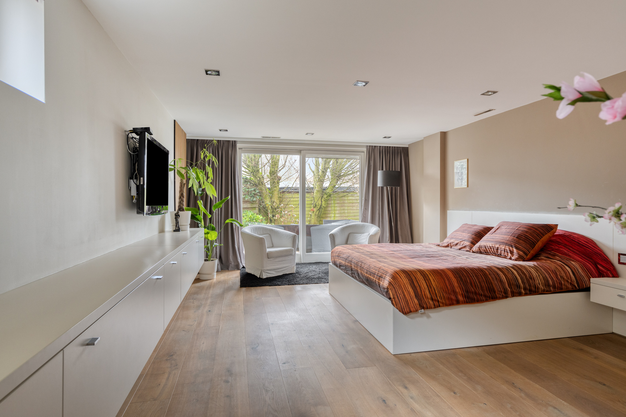 De royale ouderslaapkamer heeft directe toegang tot de achtertuin en de tweede badkamer, uitgerust met een dubbele douche en dubbele wastafel. Aansluitend bevindt zich een ruime walk-in closet.