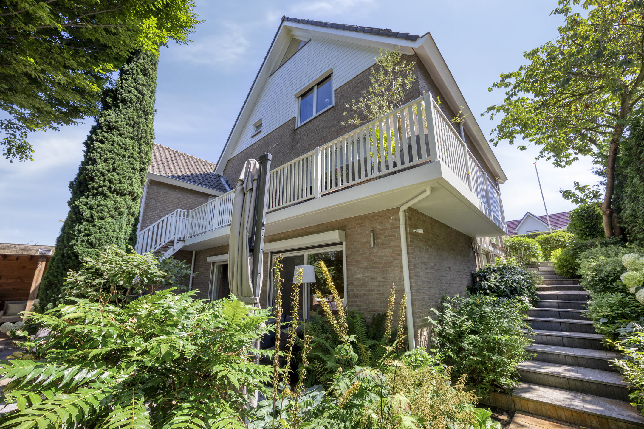 Vanuit de keuken stap je zo het brede, tuingerichte balkon op, dat zich uitstrekt over de volledige breedte van de woning.
