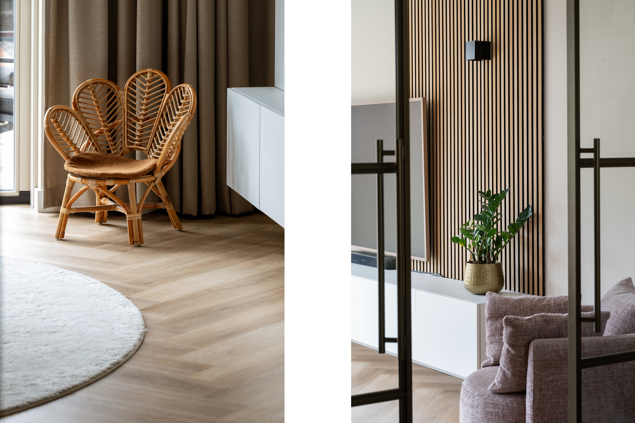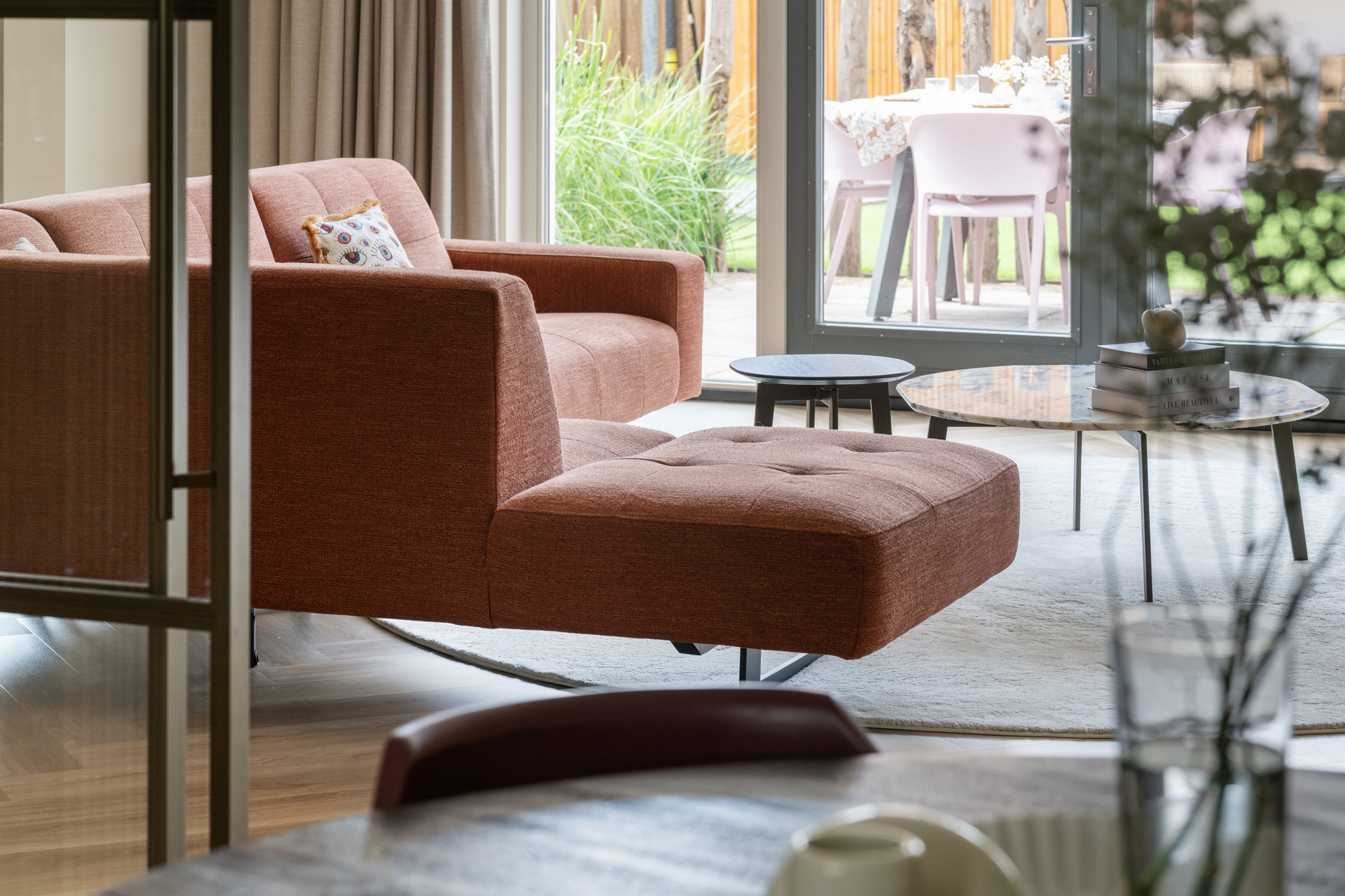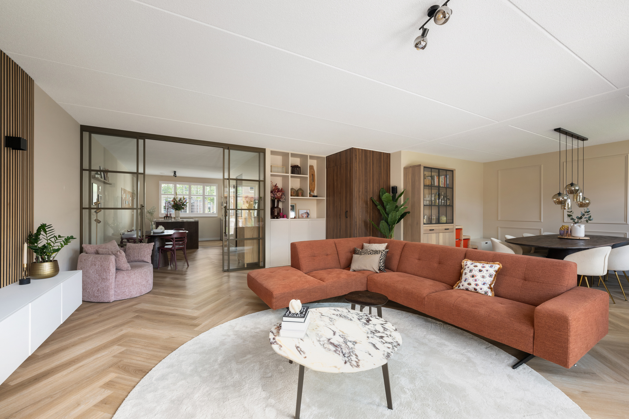 Wat deze leefruimte extra bijzonder maakt, zijn de elegante koperkleurige stalen schuifdeuren die de woonkamer en keuken op subtiele en stijlvolle wijze van elkaar scheiden. Ze zorgen voor een speelse indeling, zonder het gevoel van ruimte en licht te verliezen.