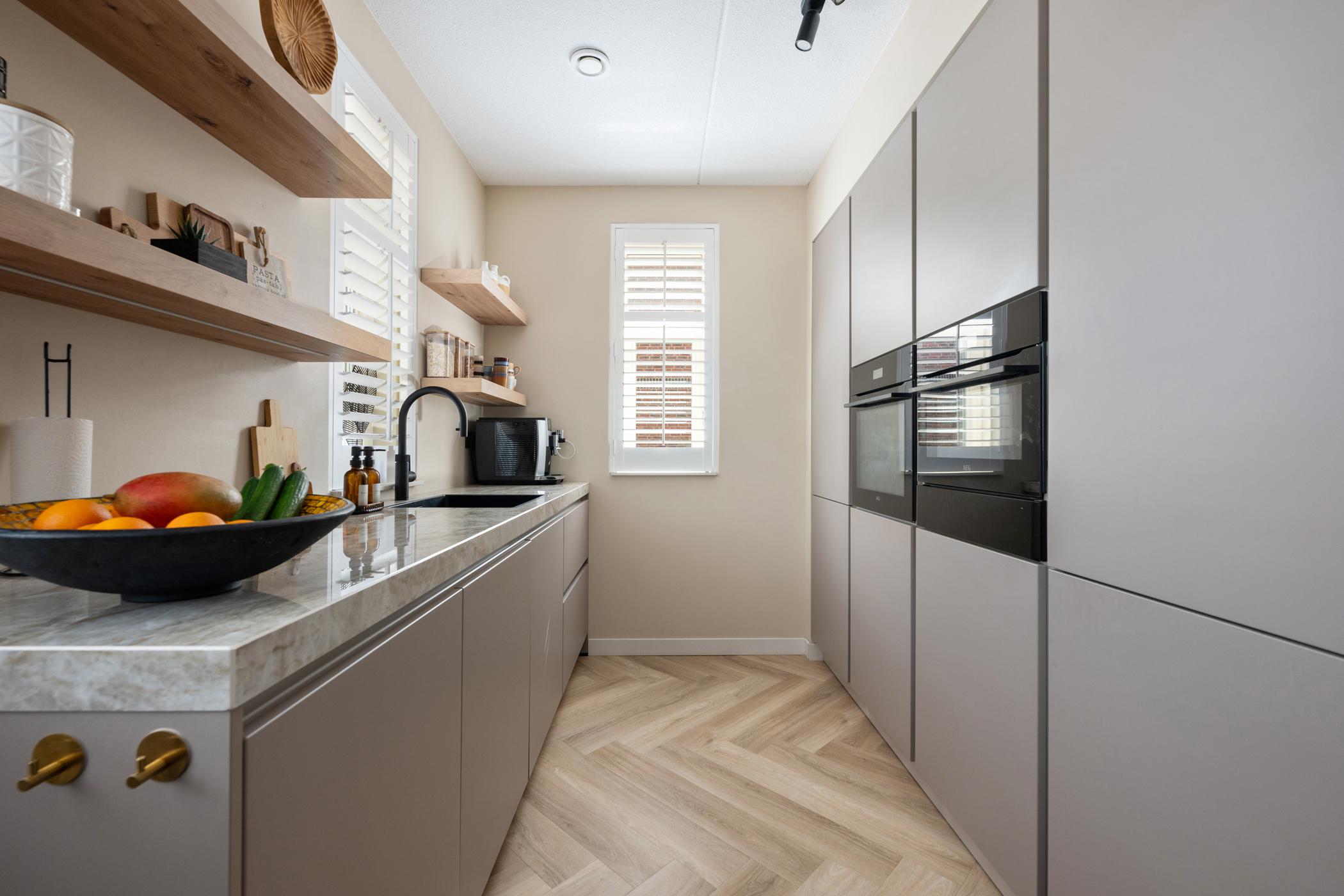 De sfeervolle woonkamer is opvallend licht en ruim opgezet, met het zitgedeelte aan de achterzijde van de woning. Aan de voorzijde vind je de royale leefkeuken met een stijlvol kookeiland, afgewerkt met een luxueus marmeren werkblad. De keuken is volledig uitgerust met hoogwaardige inbouwapparatuur, waaronder een inductiekookplaat met geïntegreerde afzuiging, oven, combi-magnetron, warmhoudlade, Quooker, koel-vriescombinatie en een vaatwasser.