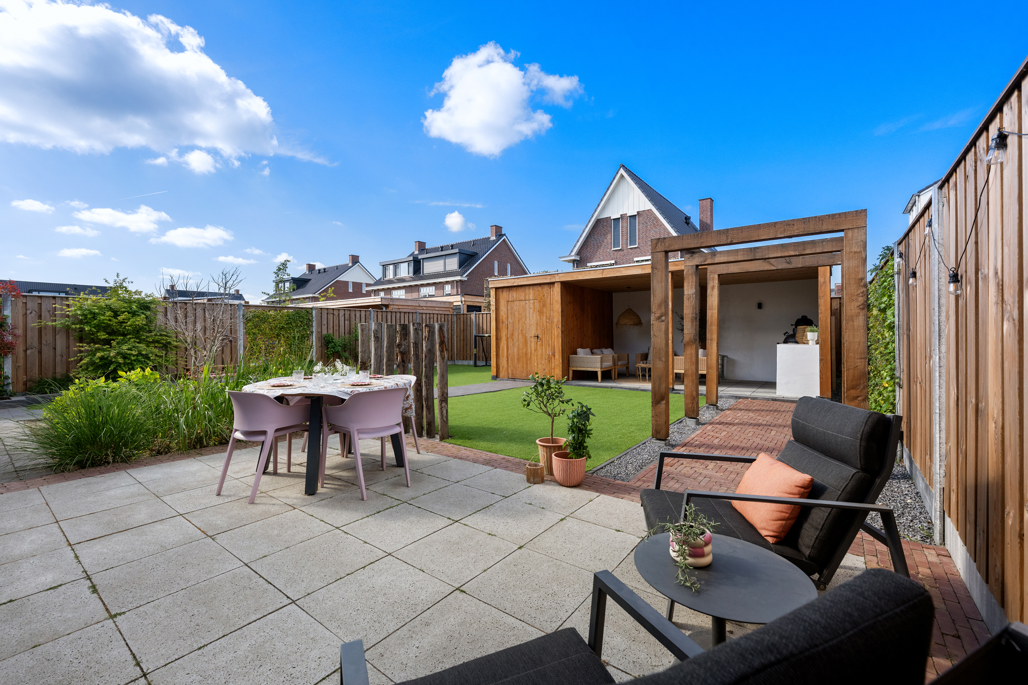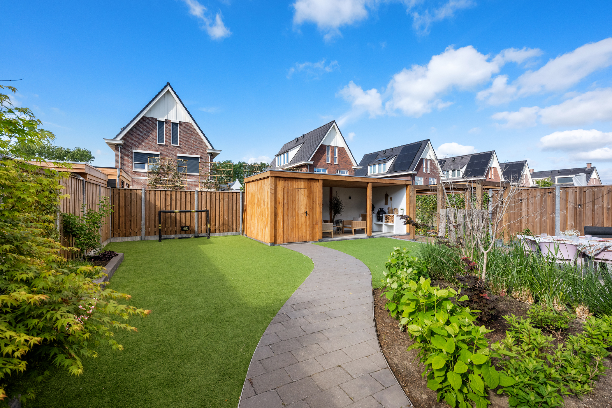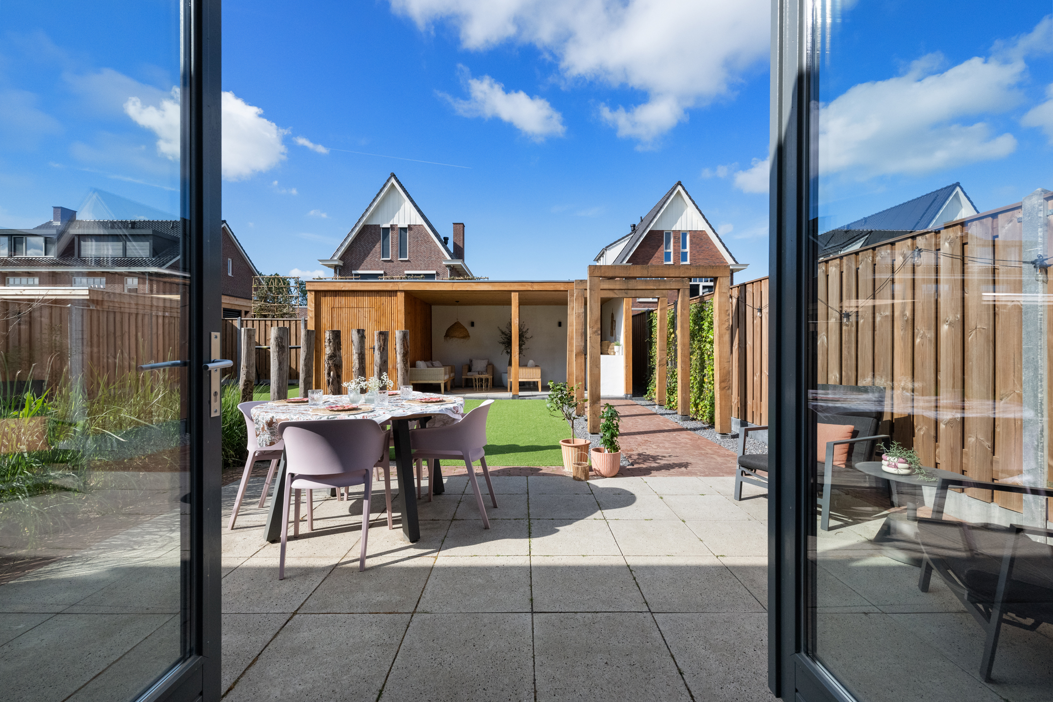 Via openslaande deuren stap je de fraai aangelegde achtertuin in, een oase van rust en privacy. Dankzij de gunstige ligging kun je hier op elk moment van de dag genieten van zowel zon als schaduw. De tuin is voorzien van een professioneel aangelegd drainagesysteem, waardoor ook na een regenbui alles netjes en droog blijft.