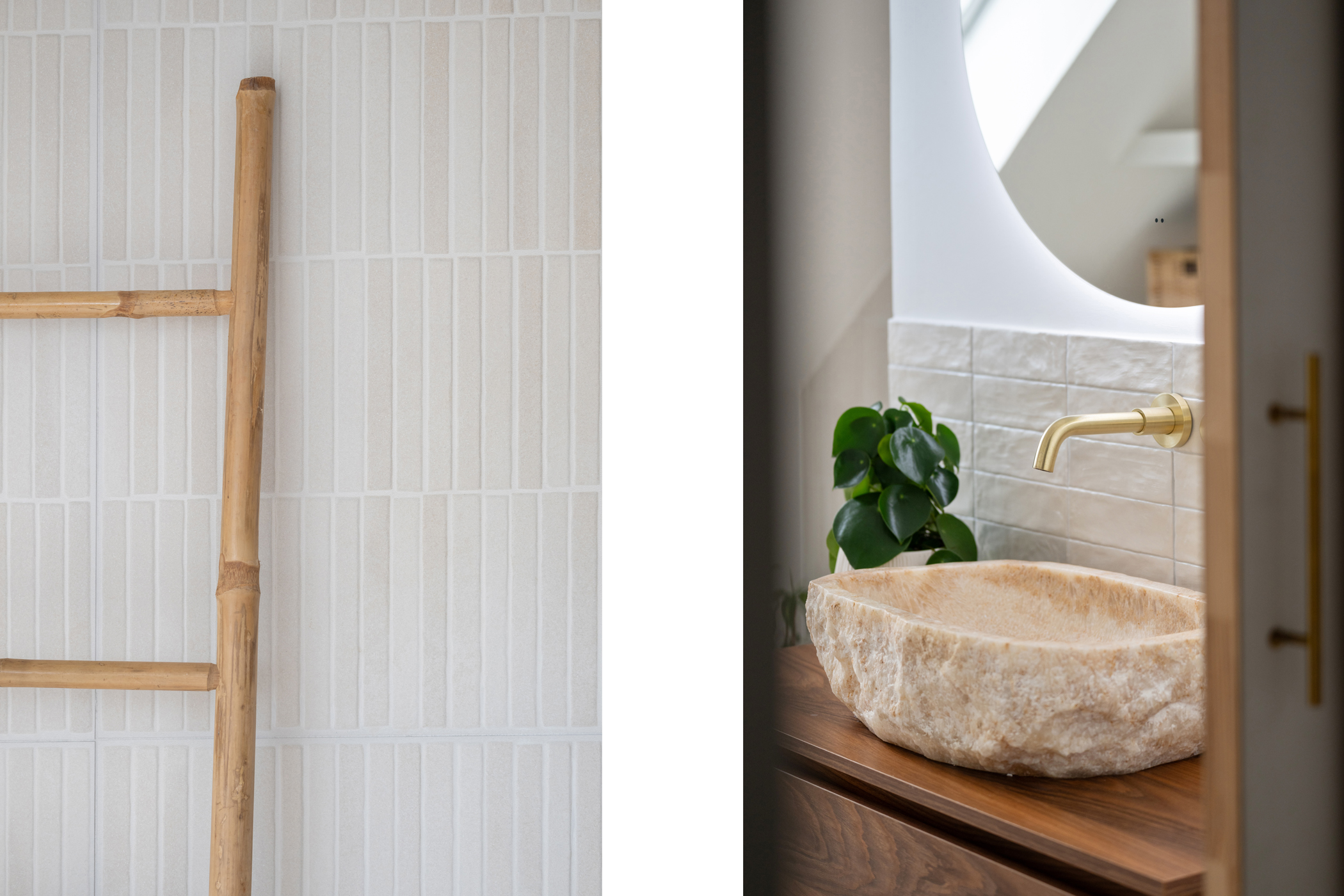 De moderne badkamer is een fijne, ontspannende plek met een luxe ligbad, een ruime inloopdouche en een dubbele wastafel. Alles is tot in detail afgewerkt, zodat je hier elke dag in alle rust kunt opstarten of afsluiten.