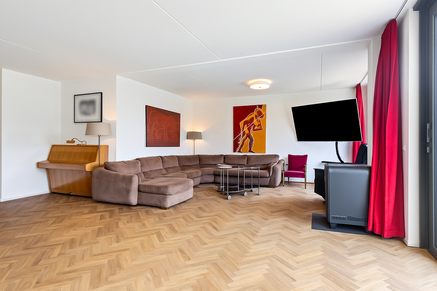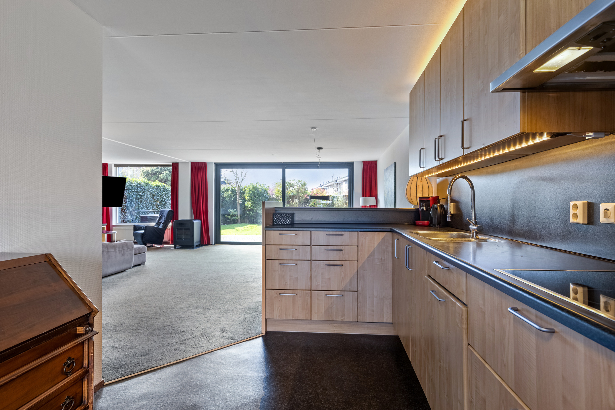 De ruime woonkamer is gelegen aan de achterzijde. De grote ramen zorgen voor veel lichtinval en de schuifpui geeft toegang tot achtertuin. De L-vormige woonkamer heeft een gezellige zithoek en voldoende ruimte om met een groot gezelschap aan een lange tafel plaats te nemen.
