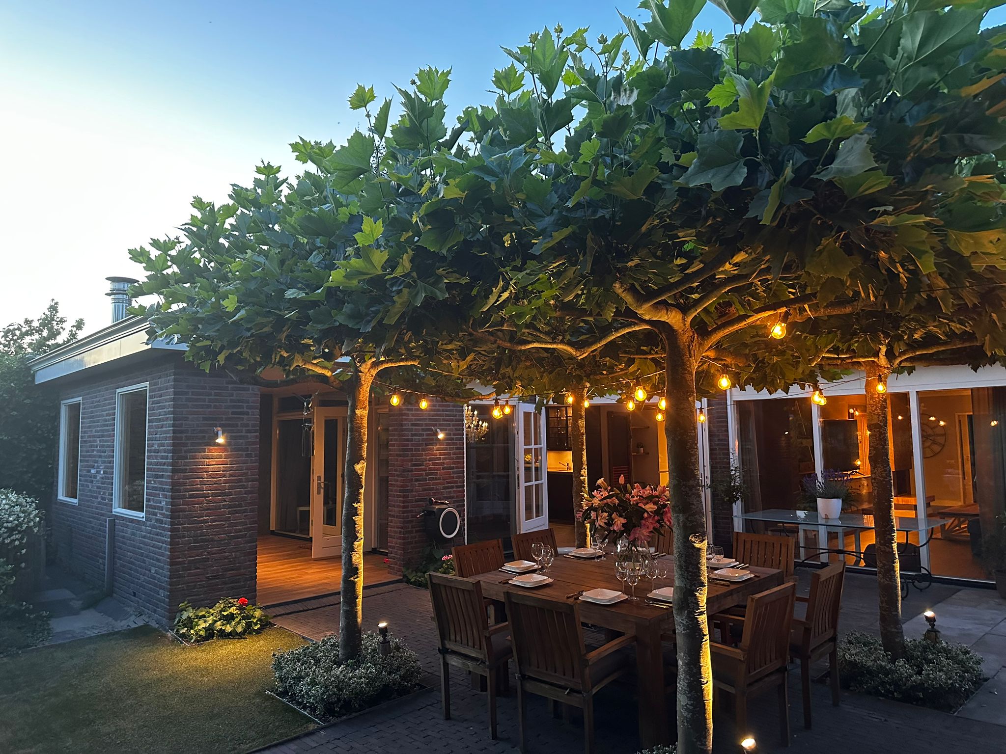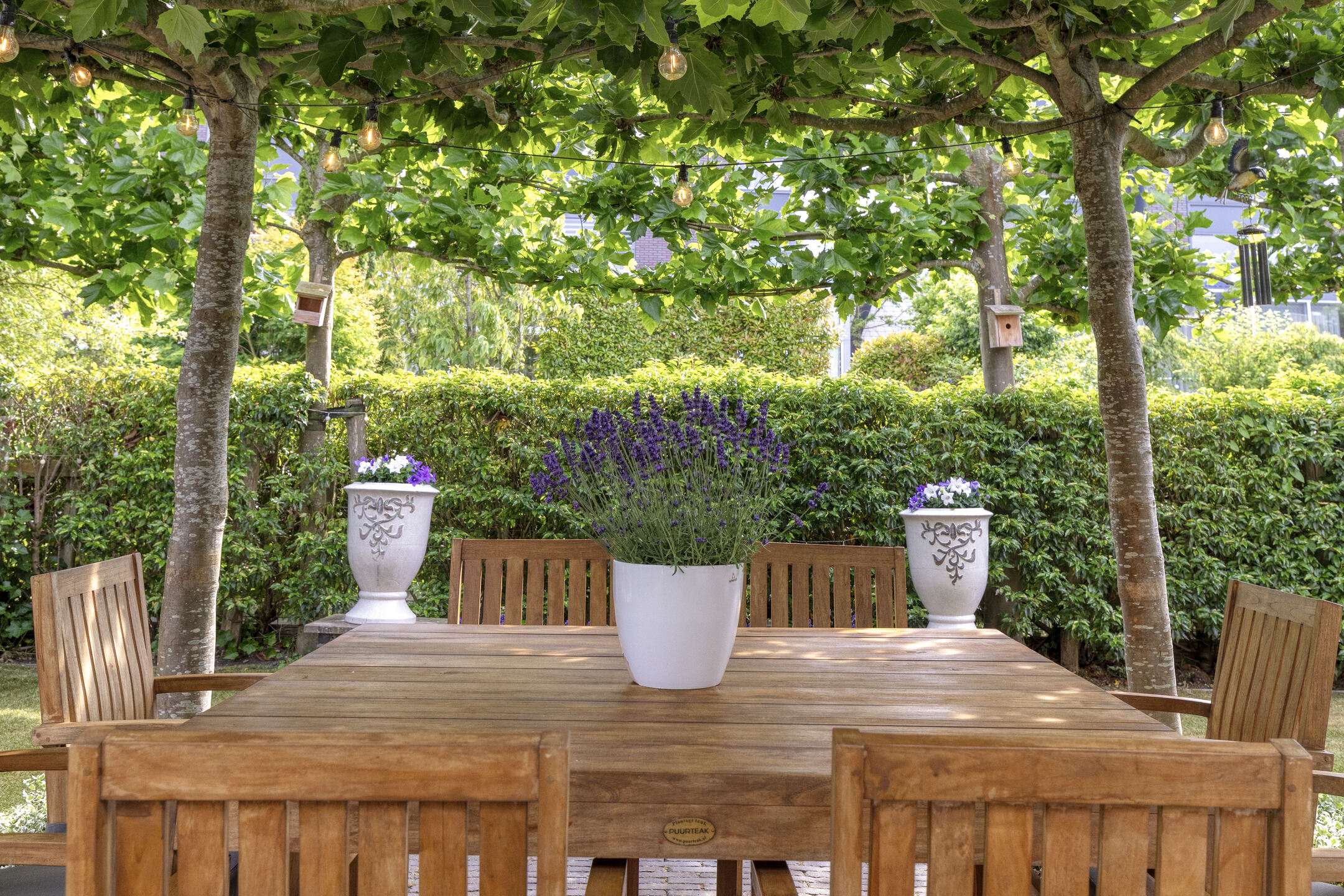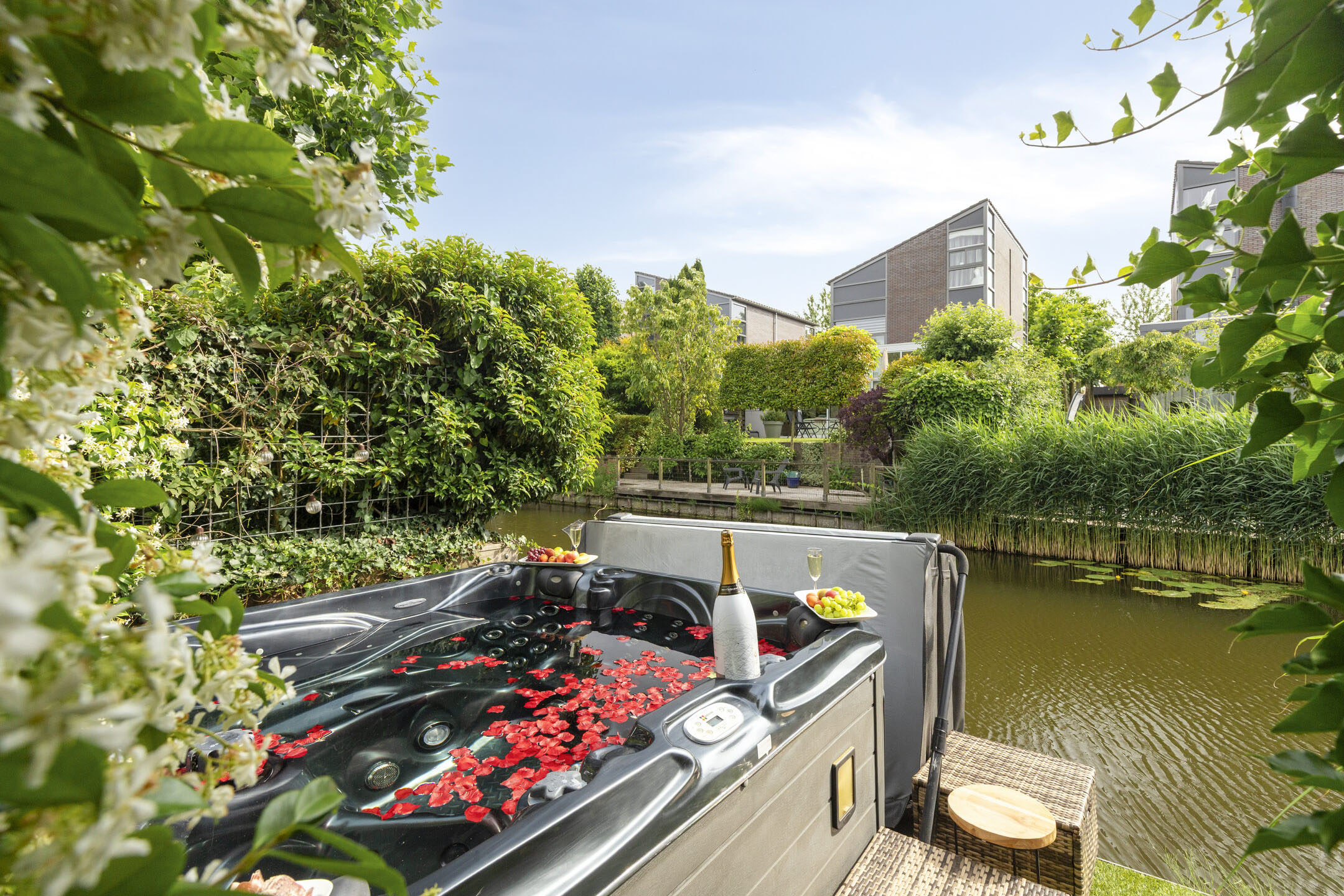 De achtertuin is voorzien van een breed terras met centraal een heerlijke zitplek onder de natuurlijke parasols in de vorm van een viertal dakplatanen. Aan de waterkant is een houten vlonder terras met Jacuzzi.
