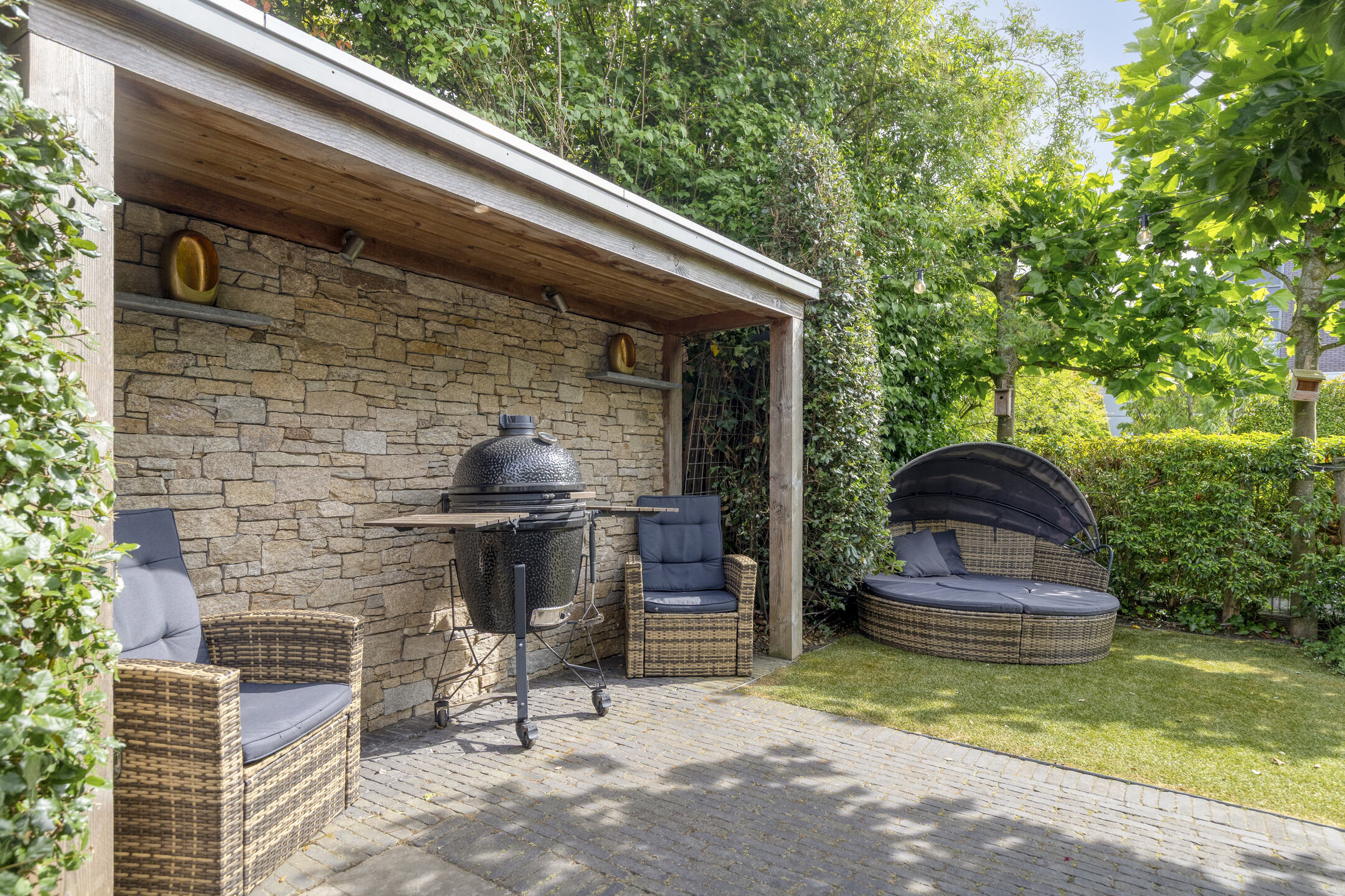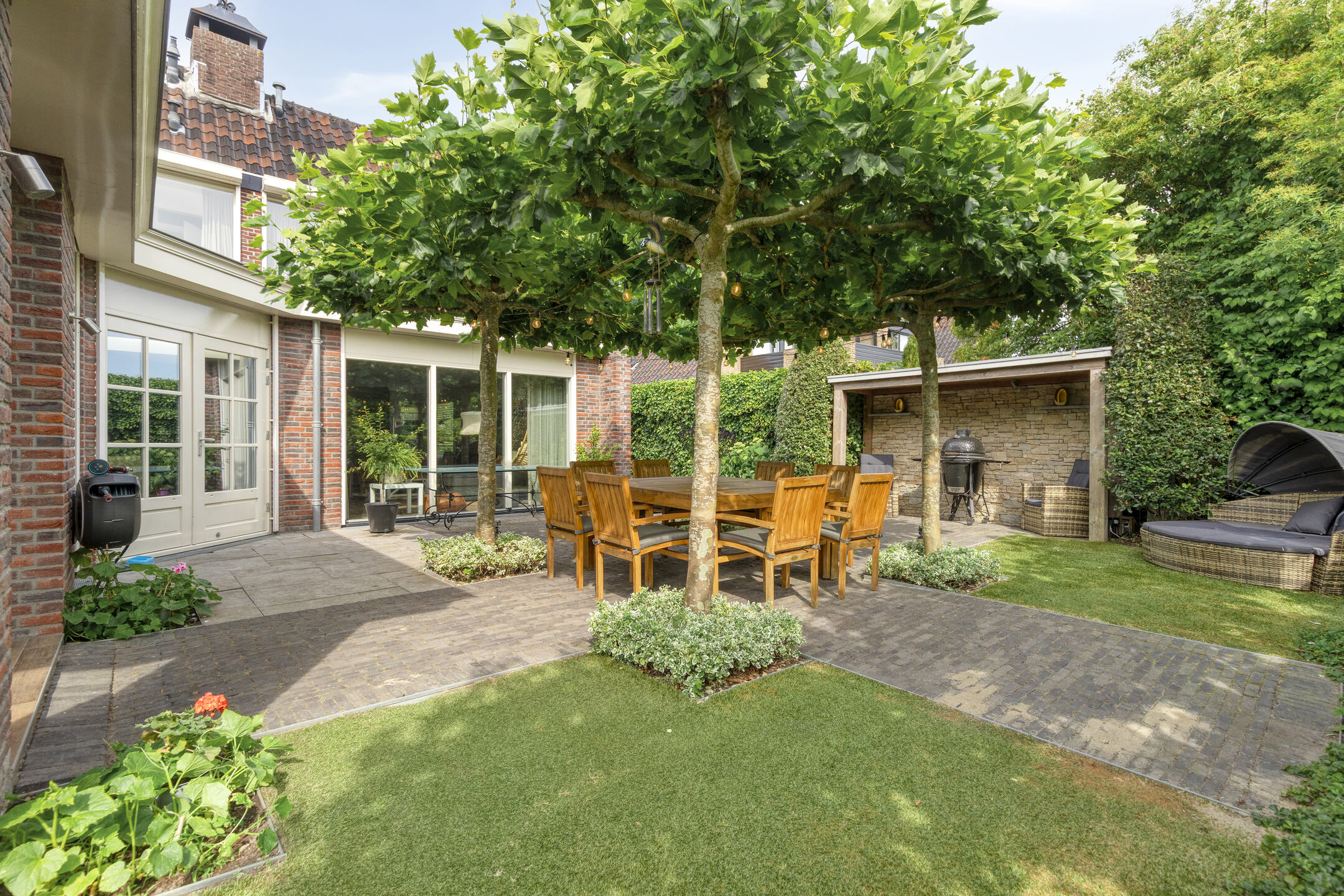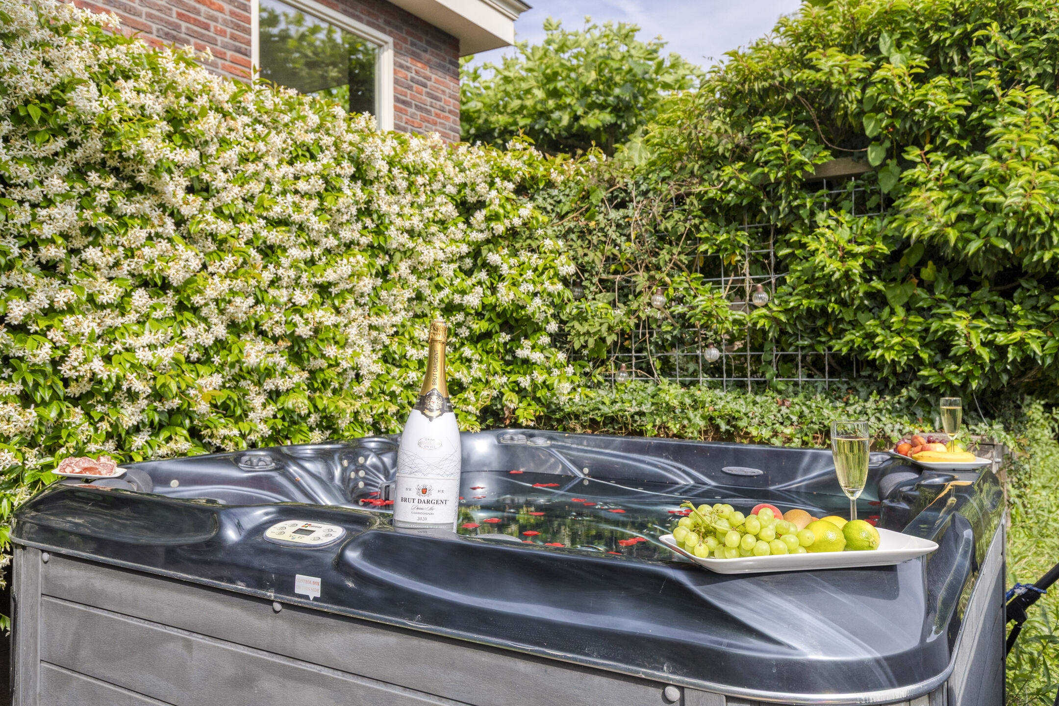 De achtertuin is voorzien van een breed terras met centraal een heerlijke zitplek onder de natuurlijke parasols in de vorm van een viertal dakplatanen. Aan de waterkant is een houten vlonder terras met Jacuzzi.