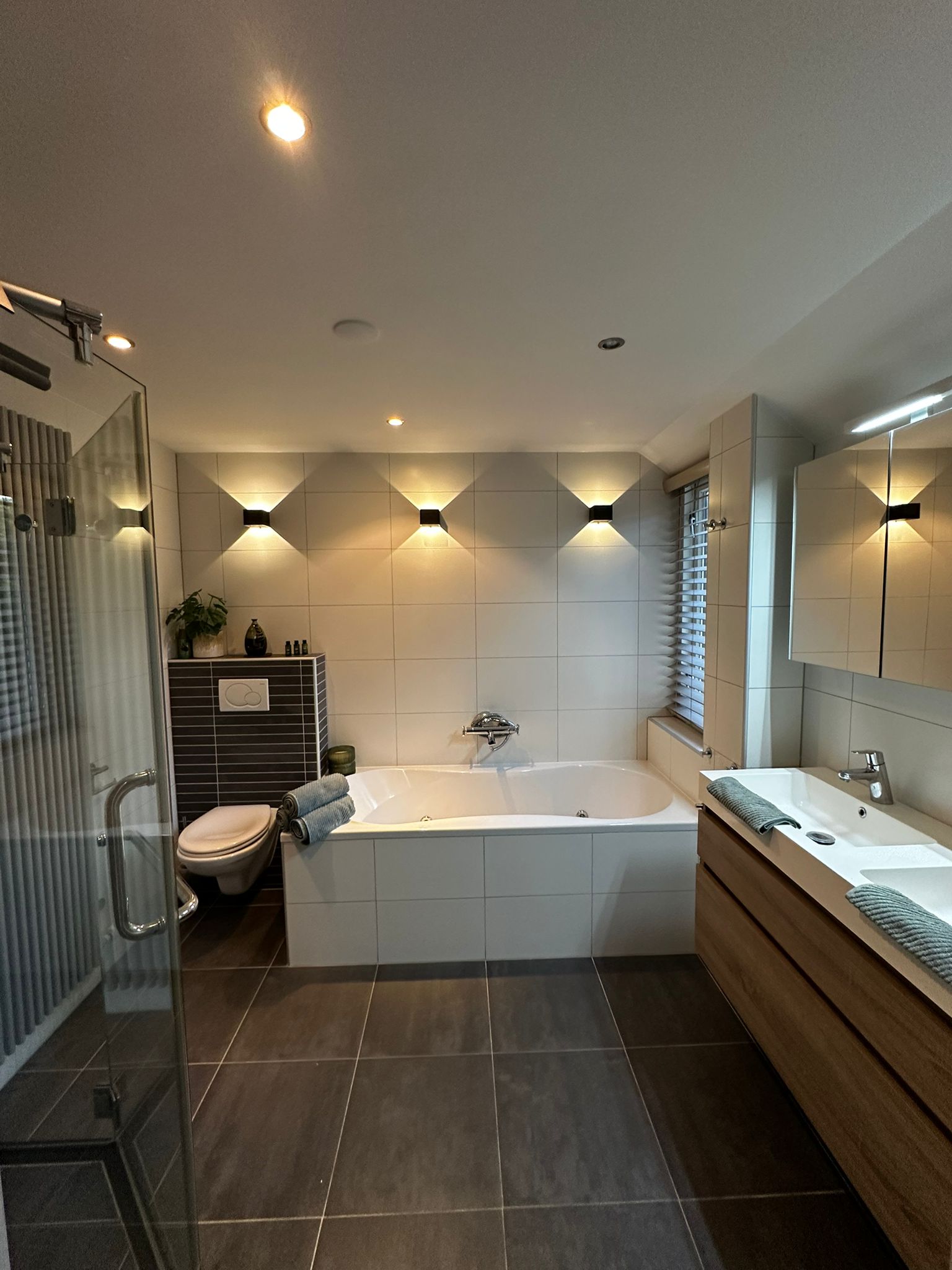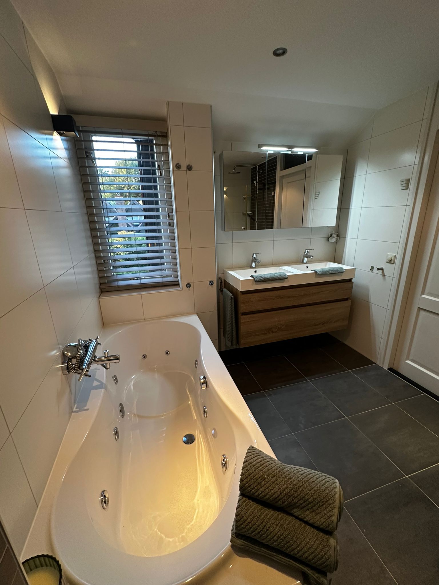 De badkamer is voorzien van een ligbad, toilet, douche en dubbele wastafel.