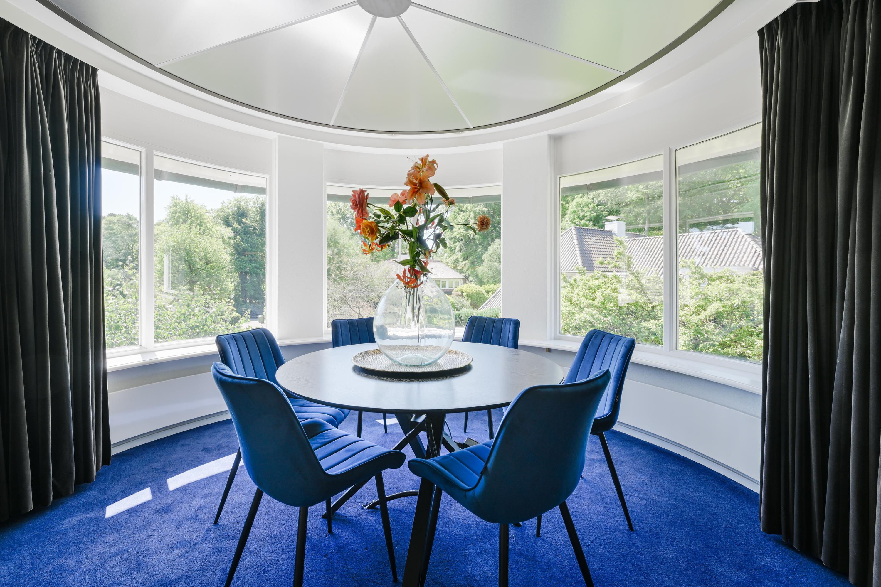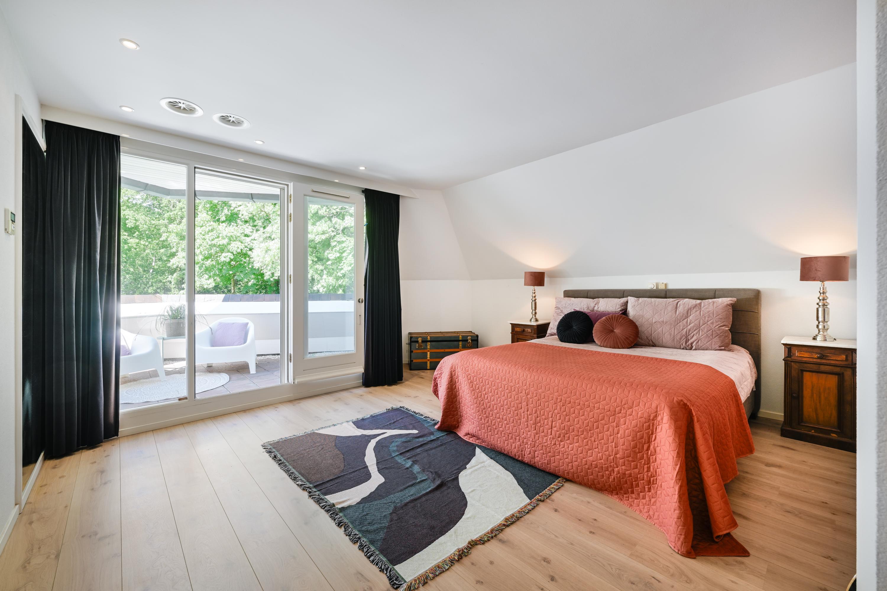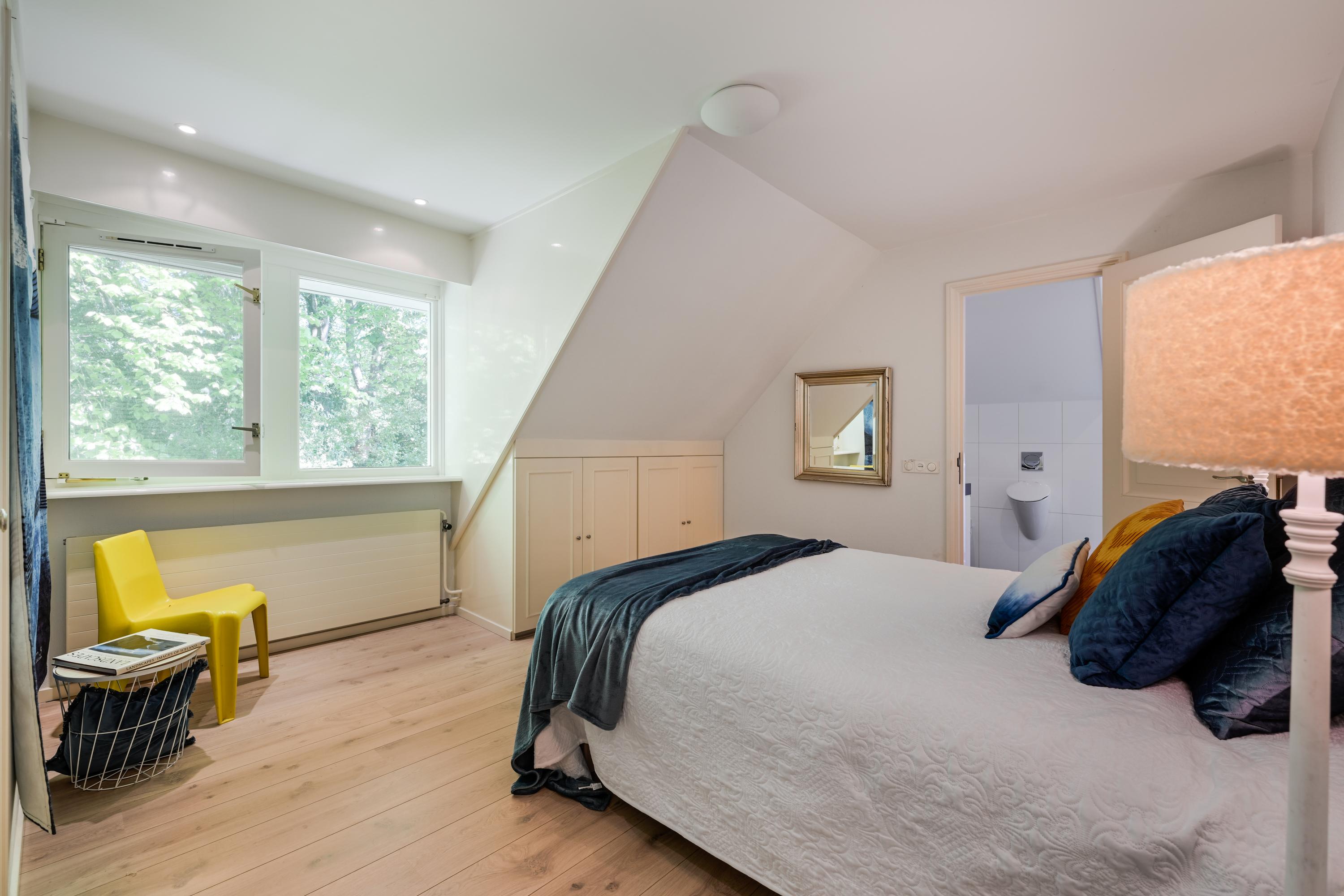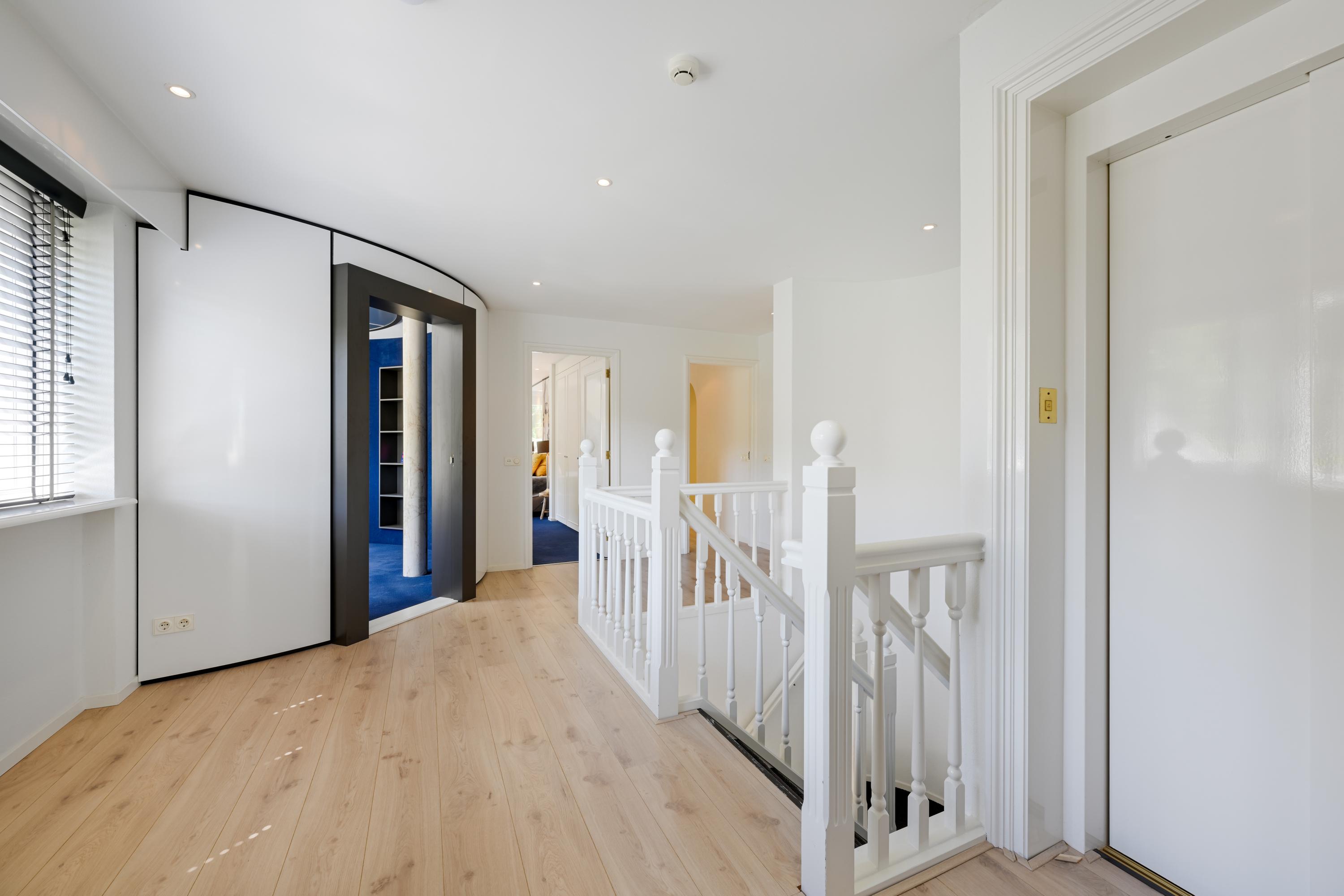Hal met bordestrap en lift, werkkamer met ronde erker met prachtig uitzicht, ruime slaapkamer met toegang tot balkon, tweede grote (ouder-)slaapkamer met beschut balkon met fraai uitzicht over de tuin, gang naar kleedkamer en eigen badkamer met ligbad, douche, dubbele wastafel in meubel, urinoir en toilet, vloerverwarming. Derde slaapkamer en vierde slaapkamer beide met dakkapel en beide met toegang naar badkamer met bad, douche, toilet, urinoir, wastafelmeubel en vloerverwarming.
