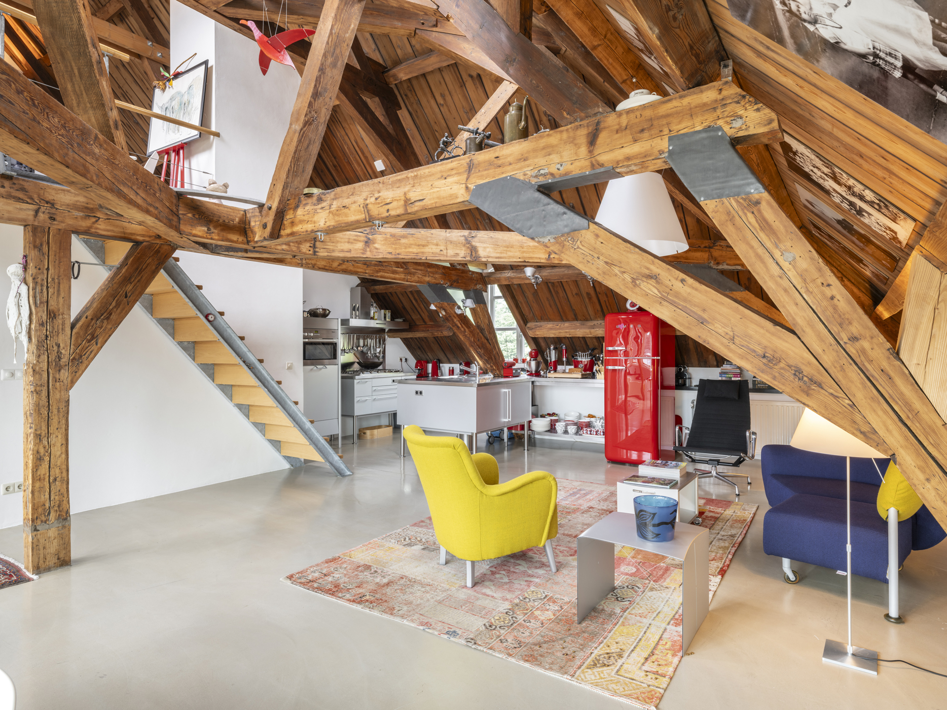 • Het appartement beschikt over een unieke en monumentale kapconstructie met maximale hoogte van ca. 6 meter;
