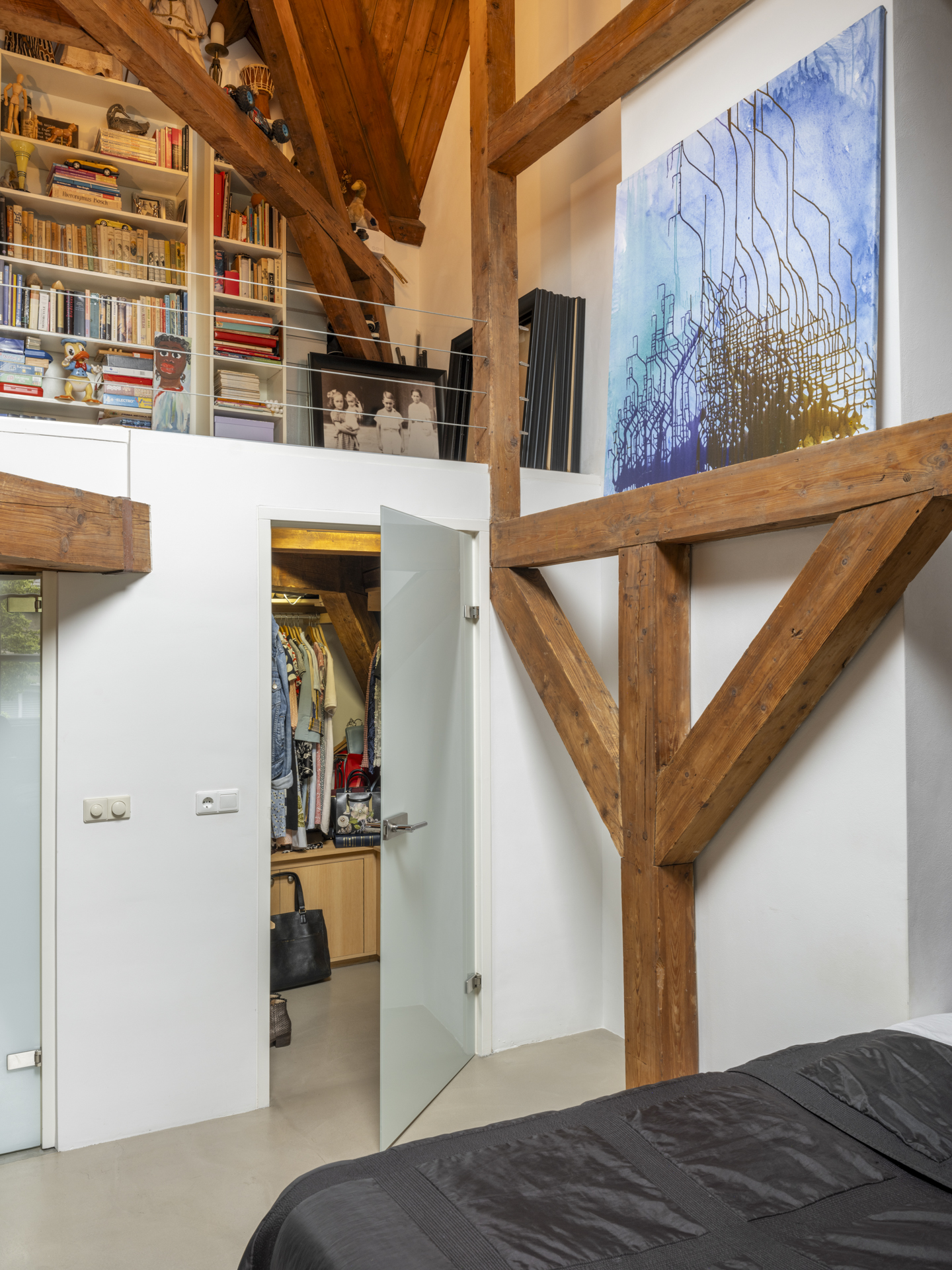 De slaap- en badkamer treft u aan de andere zijde van de eerdergenoemde hal. Het riante slaapgedeelte (totaal ca. 55 m²) is gelegen aan de kant van het Kasteelplein. Ook in de slaapkamer heeft u volledig zicht op de intact gehouden monumentale kap. In deze kamer zijn twee zeer ruime inloopkasten aanwezig.