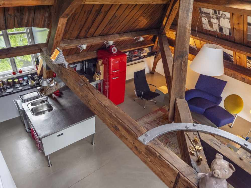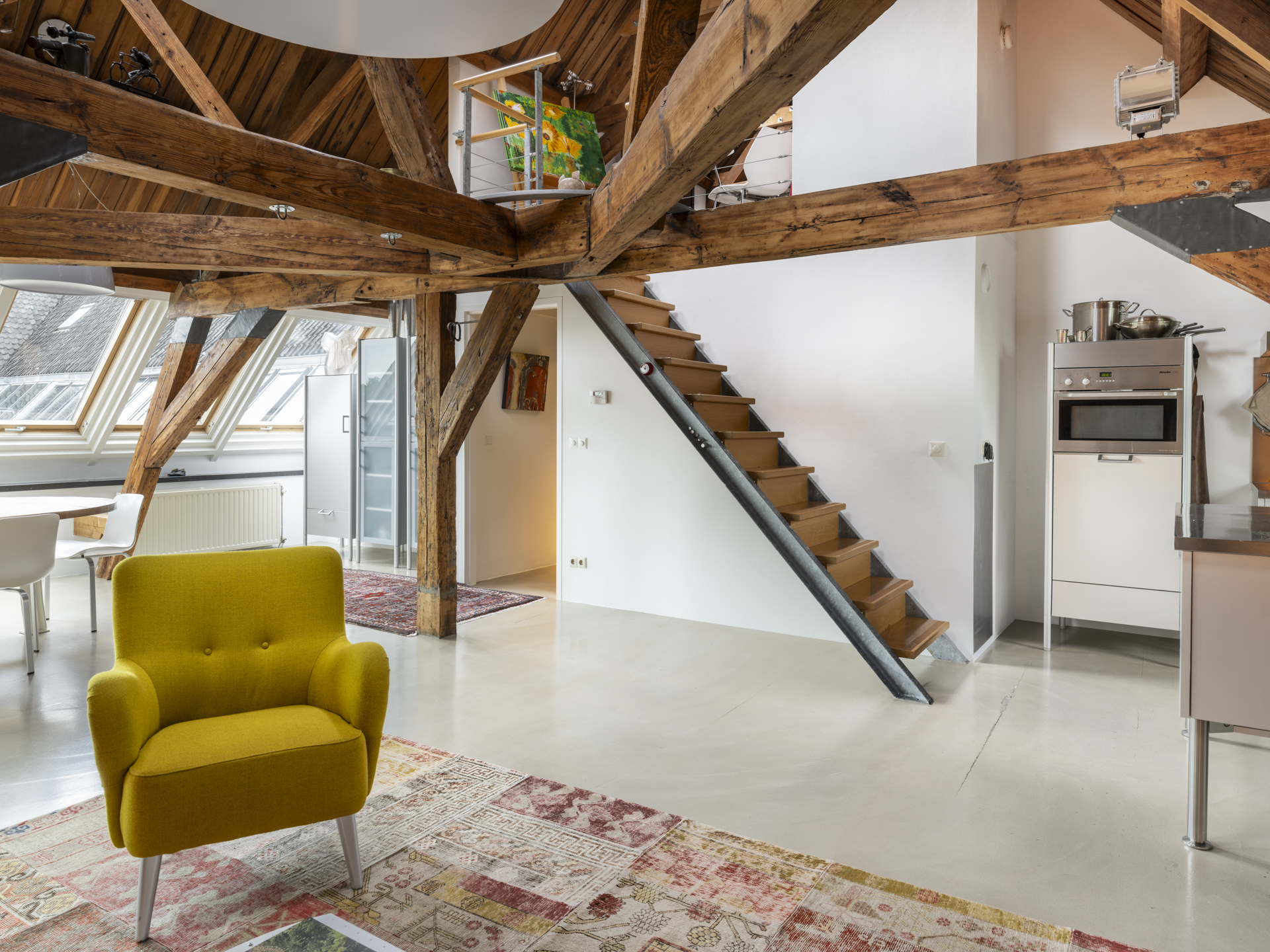 Het appartement onderscheidt zich door zijn bijzondere ligging onder de imposante monumentale kap. Hierdoor ontstaat een karaktervolle en sfeervolle woonruimte, waarbij de indrukwekkende kapconstructie in het gehele appartement zichtbaar is gebleven. De open indeling en de hoge plafonds zorgen bovendien voor een ongeëvenaard gevoel van ruimte en licht.