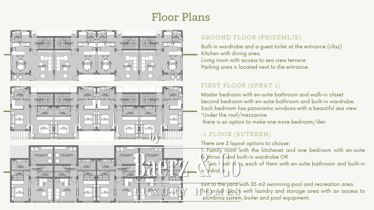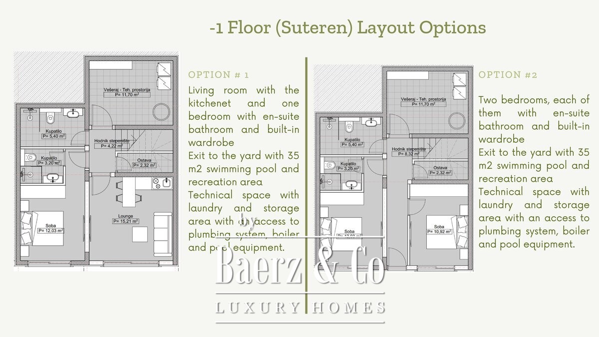 -1 FLOOR - There are 2 layout options to choose: 1. Family room with the kitchenette and one bedroom with en-suite bathroom and built-in wardrobe OR 2. Two bedrooms, each of them with en-suite bathroom and built-in wardrobe Exit to the yard with 35 m2 swimming pool and recreation area; Technical space with laundry and storage area with an access to plumbing system, boiler and pool equipment.