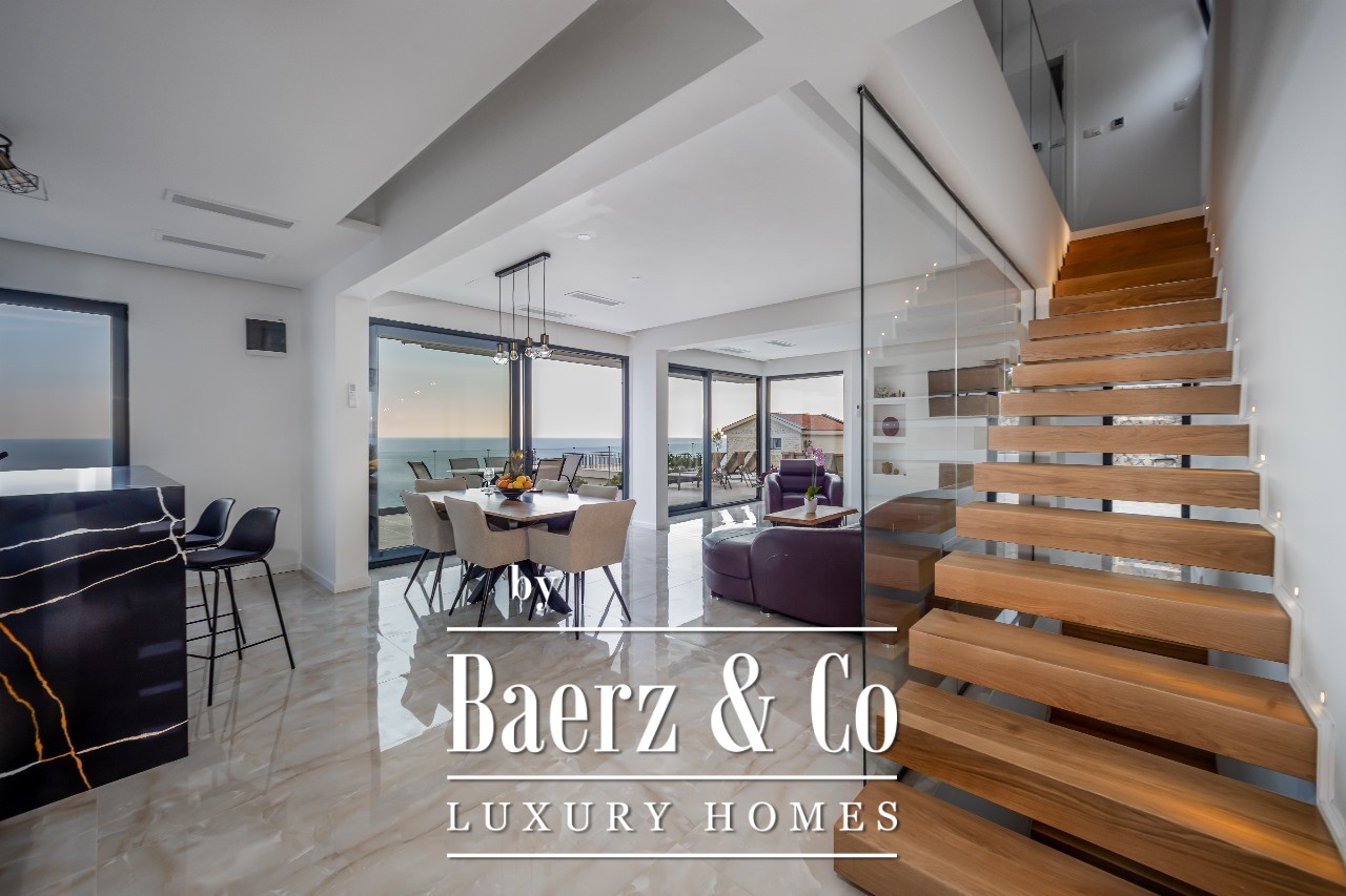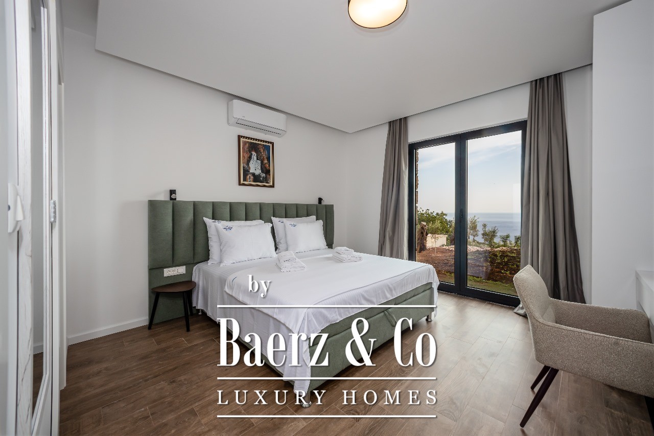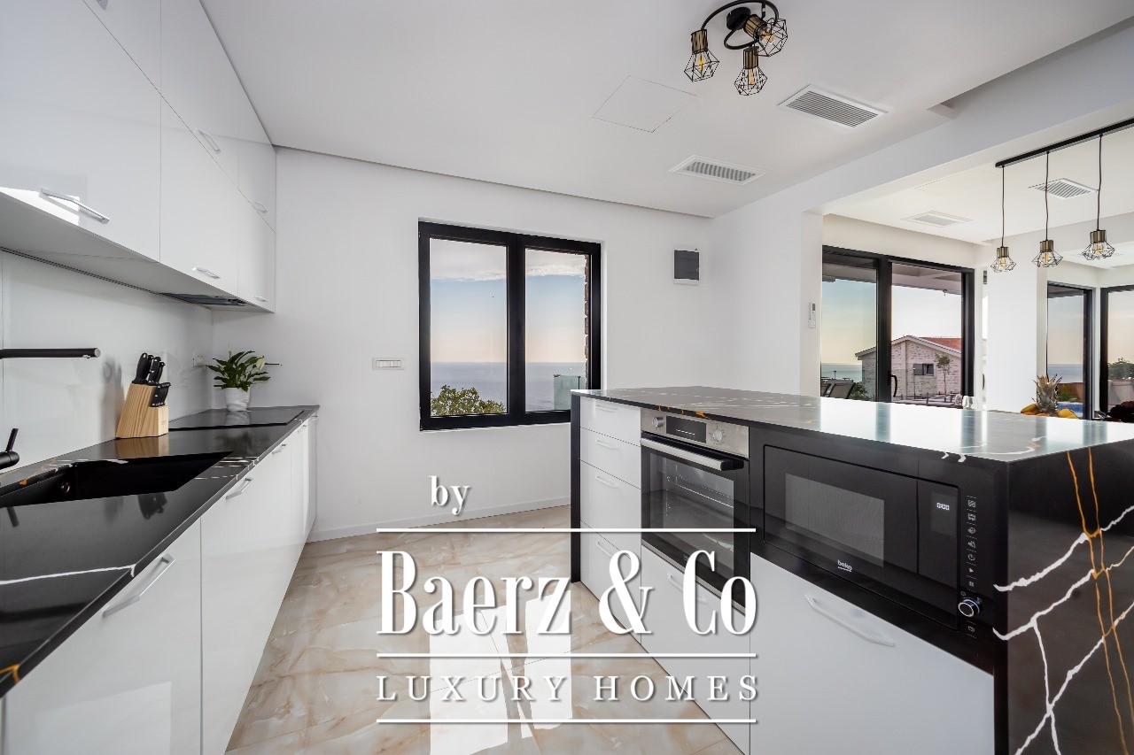 Structure of the villa: hallway, living room with kitchen and dining table, 4 bedrooms, 4 bathrooms and a terrace with a pool. It has a sea view and the view of mountains that surround it. The villa is fully furnished and ready for moving in.