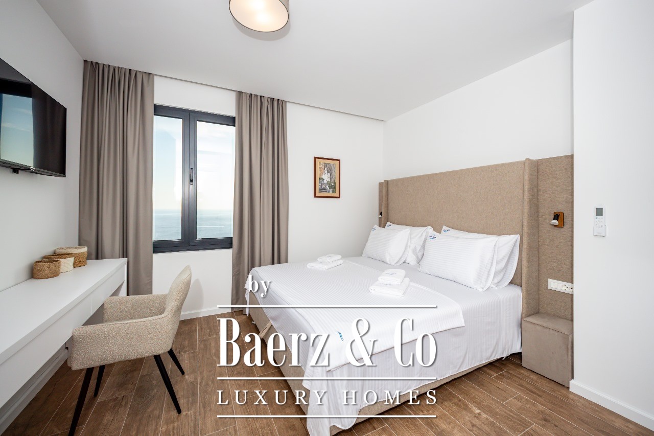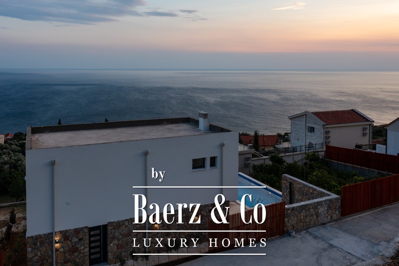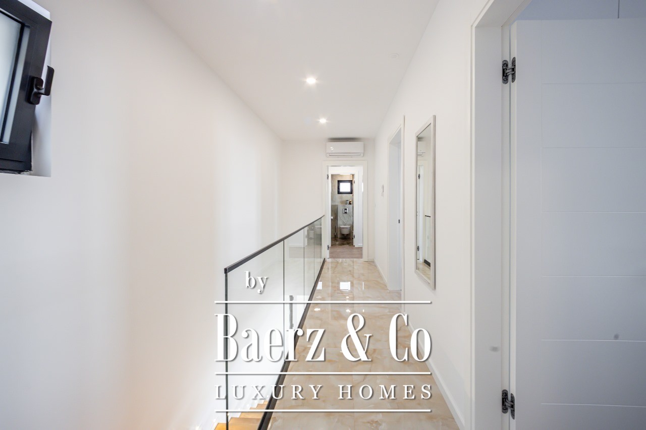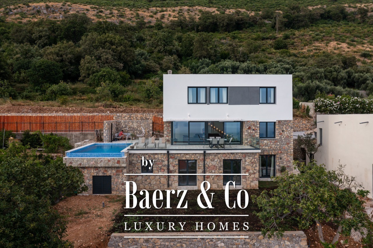 Structure of the villa: hallway, living room with kitchen and dining table, 4 bedrooms, 4 bathrooms and a terrace with a pool. It has a sea view and the view of mountains that surround it. The villa is fully furnished and ready for moving in.
