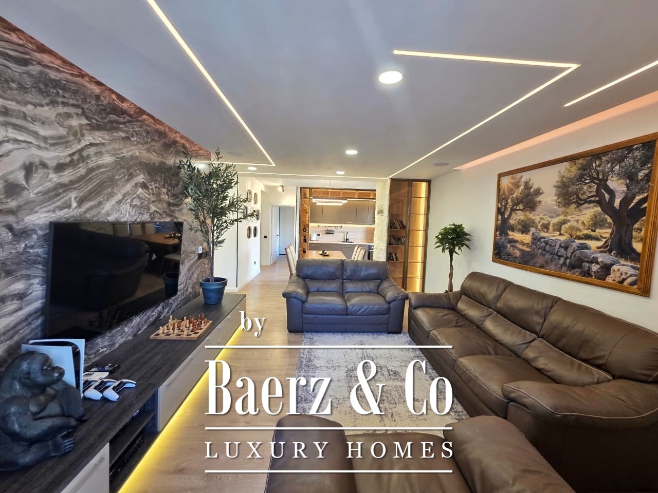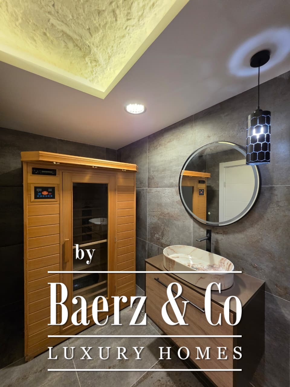 De indeling omvat een hal, een open woonkamer met keuken en eetgedeelte, drie slaapkamers en twee badkamers. Een privé-sauna biedt een gewijde plek om te ontspannen, terwijl vier terrassen het woongenot naar buiten uitbreiden. Beide badkamers beschikken over vloerverwarming, waarvan de aansturing samen met het hoofdverwarmingssysteem en de boilers via een mobiele app verloopt voor modern comfort. Elektrische gordijnen en airconditioning in elke kamer zorgen elk seizoen voor een aangenaam binnenklimaat.