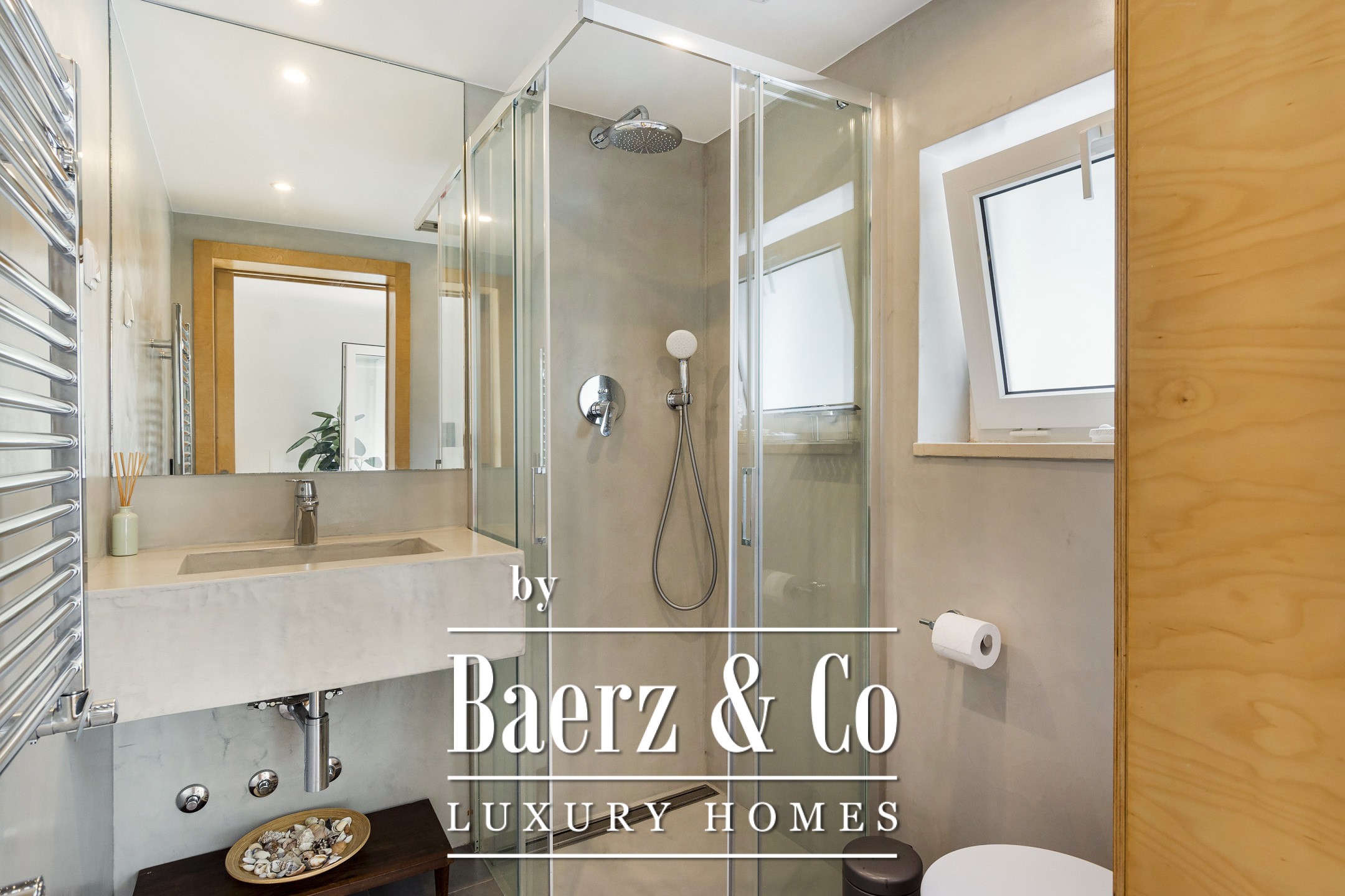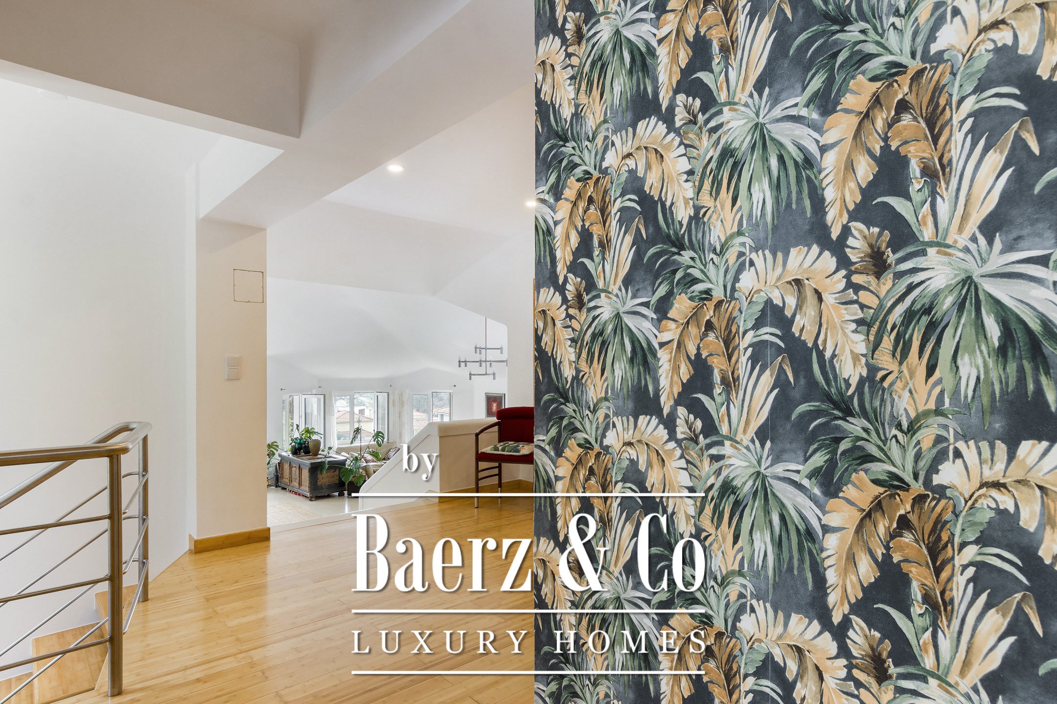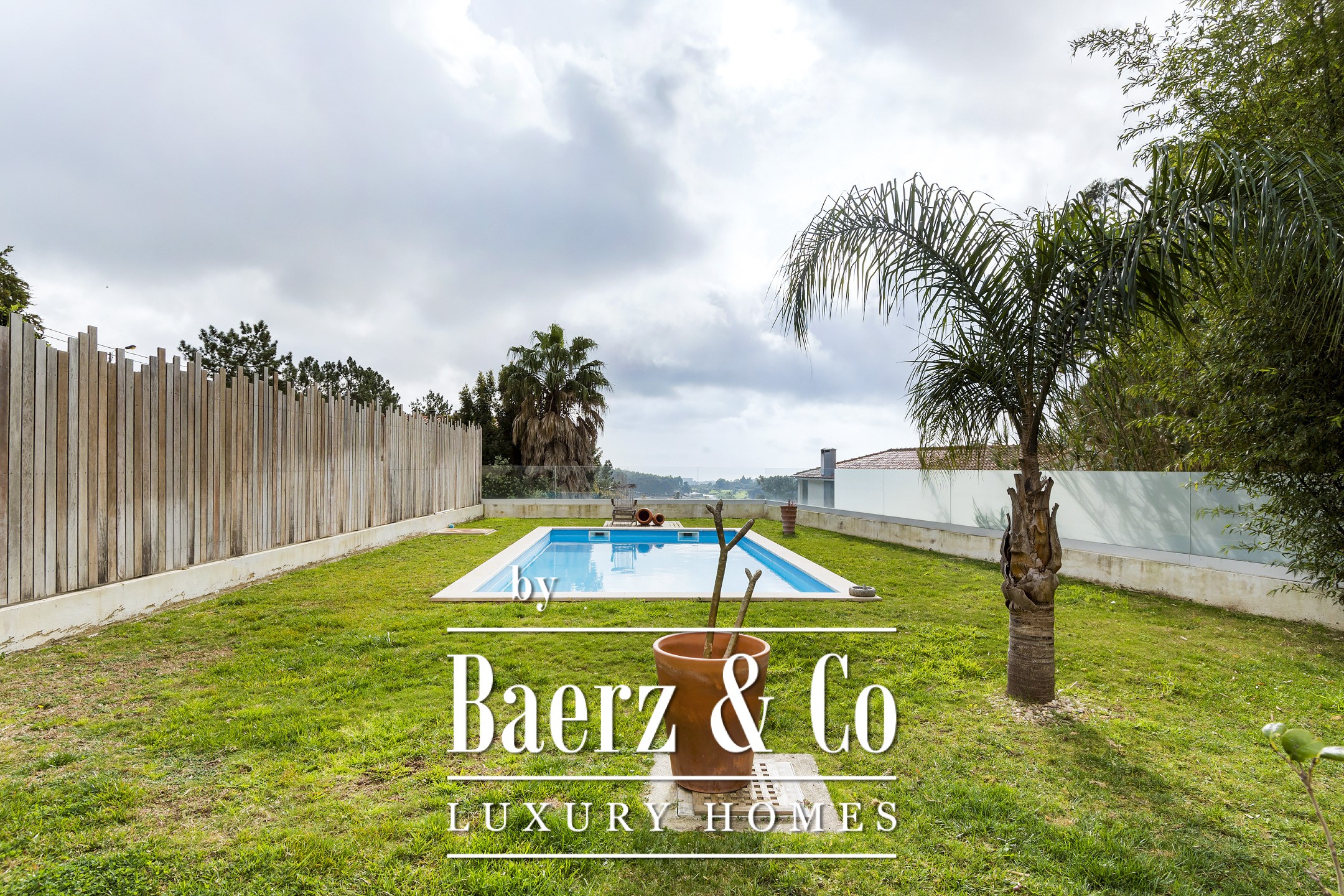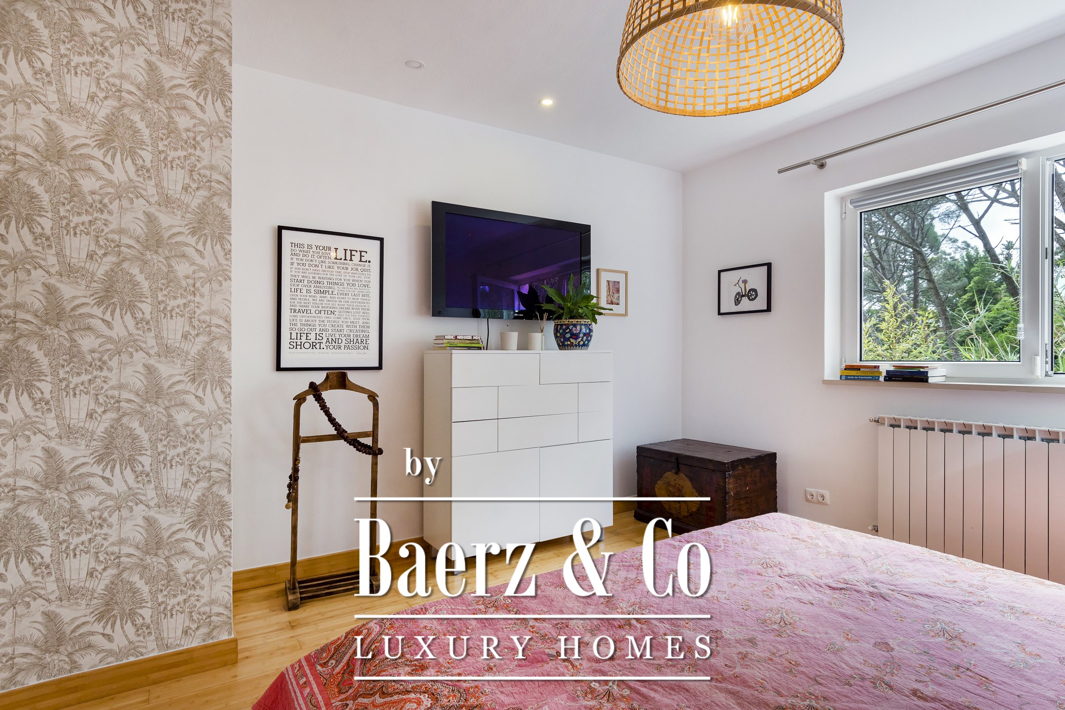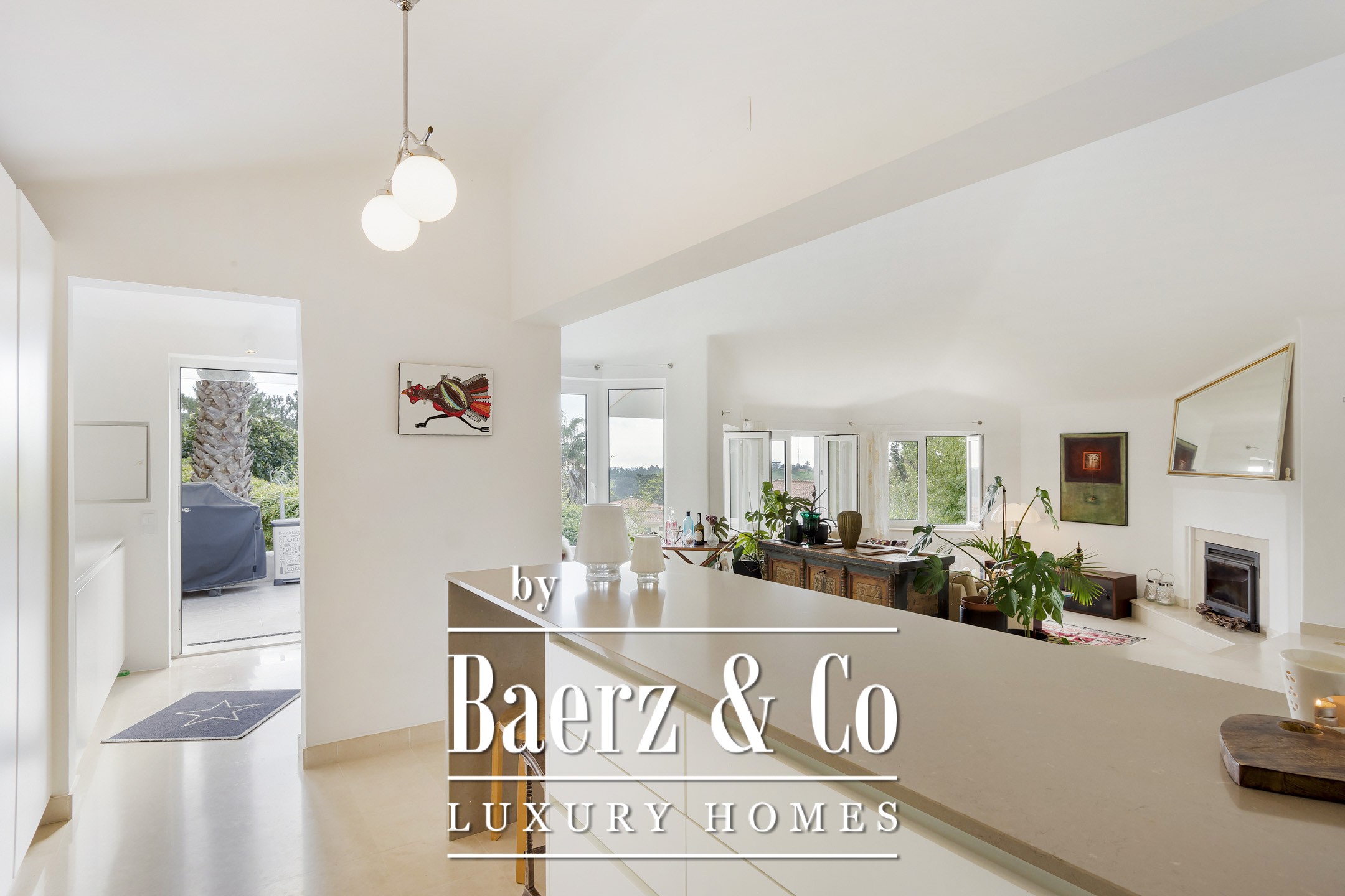 Refurbished 5 bedroom sea view villa, with 305 m2 of gross private area, set in a plot of land with 1,206 m2, in Malveira da Serra, Cascais. Split levels and a very charming architecture, bamboo floors, kitchen and remodelled bathrooms offer a lot of comfort, beauty and sophistication. Gardens, decks, patios and swimming pool with sea view, create a cosy environment and integrated with the nature of the place surrounded by greenery. Natural light is present throughout the length of the house.The house is distributed as follows:Floor 0:Large entrance hall with cupboards. Open plan kitchen (integrated) with high quality finishes and Kuppersbush appliances. Living room divided
