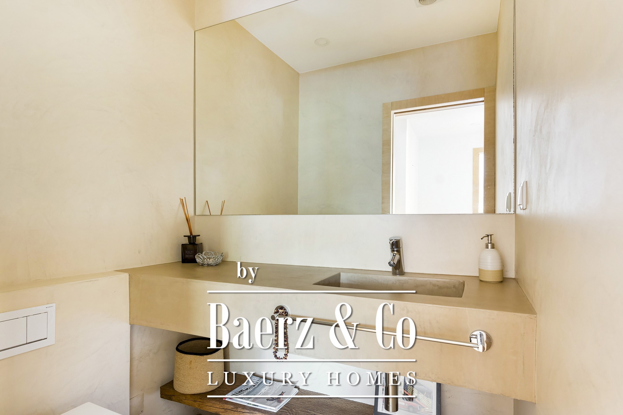 into two rooms with large windows and fireplace. Bamboo deck with outdoor fireplace.The rooms are located on two levels.Floor 1: On the upper level there are 3 bedrooms with plenty of natural light and a bathroom, as well as a toilet.Floor -1: On the lower level there are 2 suites, one of them with a large closet, with a balcony open to the deck and pool and bathroom with sea view.* Underfloor heating in the bathrooms* Central heating in parts and heat pump connected to radiators.* Swimming pool with basement and possibility of heating already established* 4 external terraces, one terrace connected to the kitchen with sea view.* Separate laundry room *Privacy