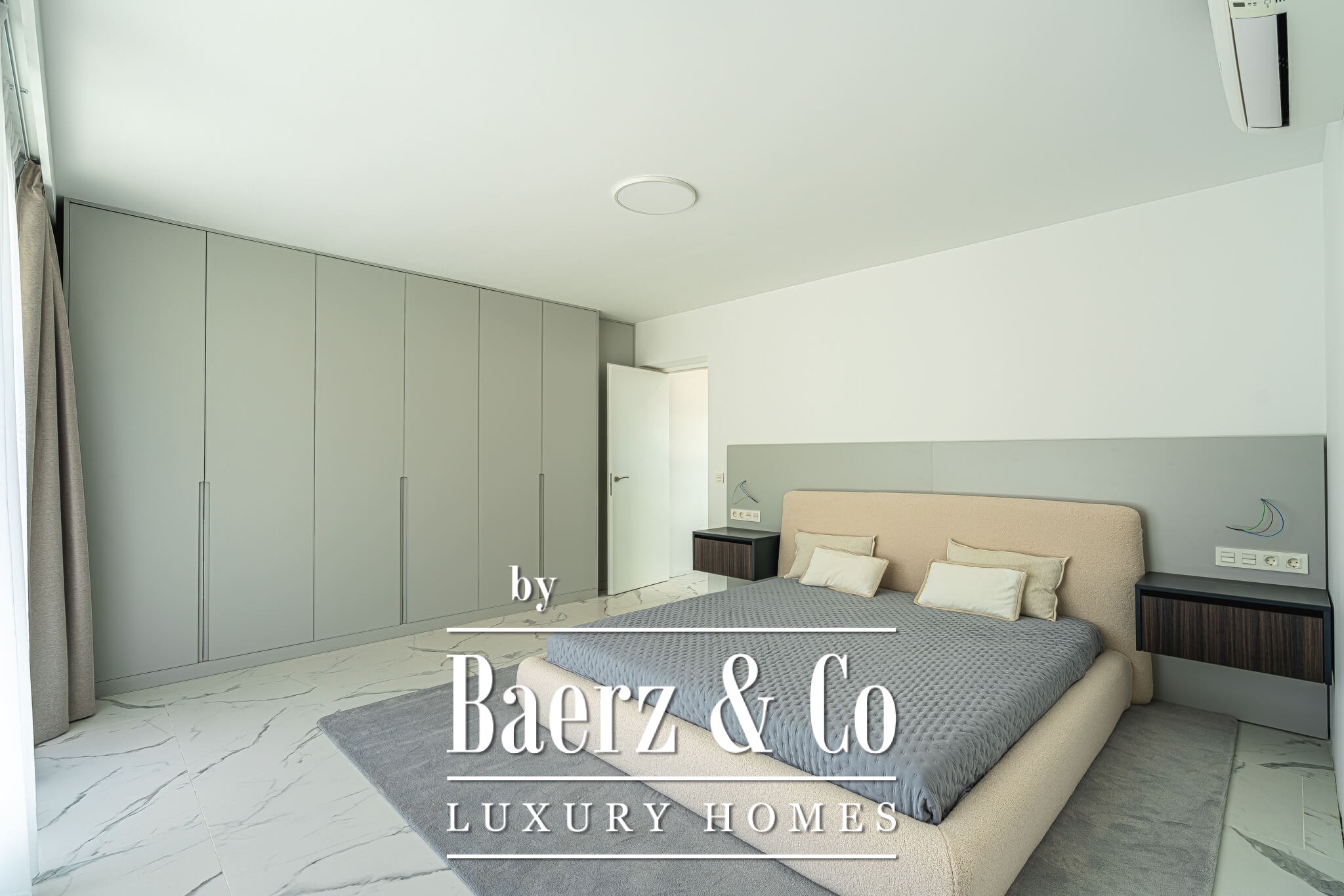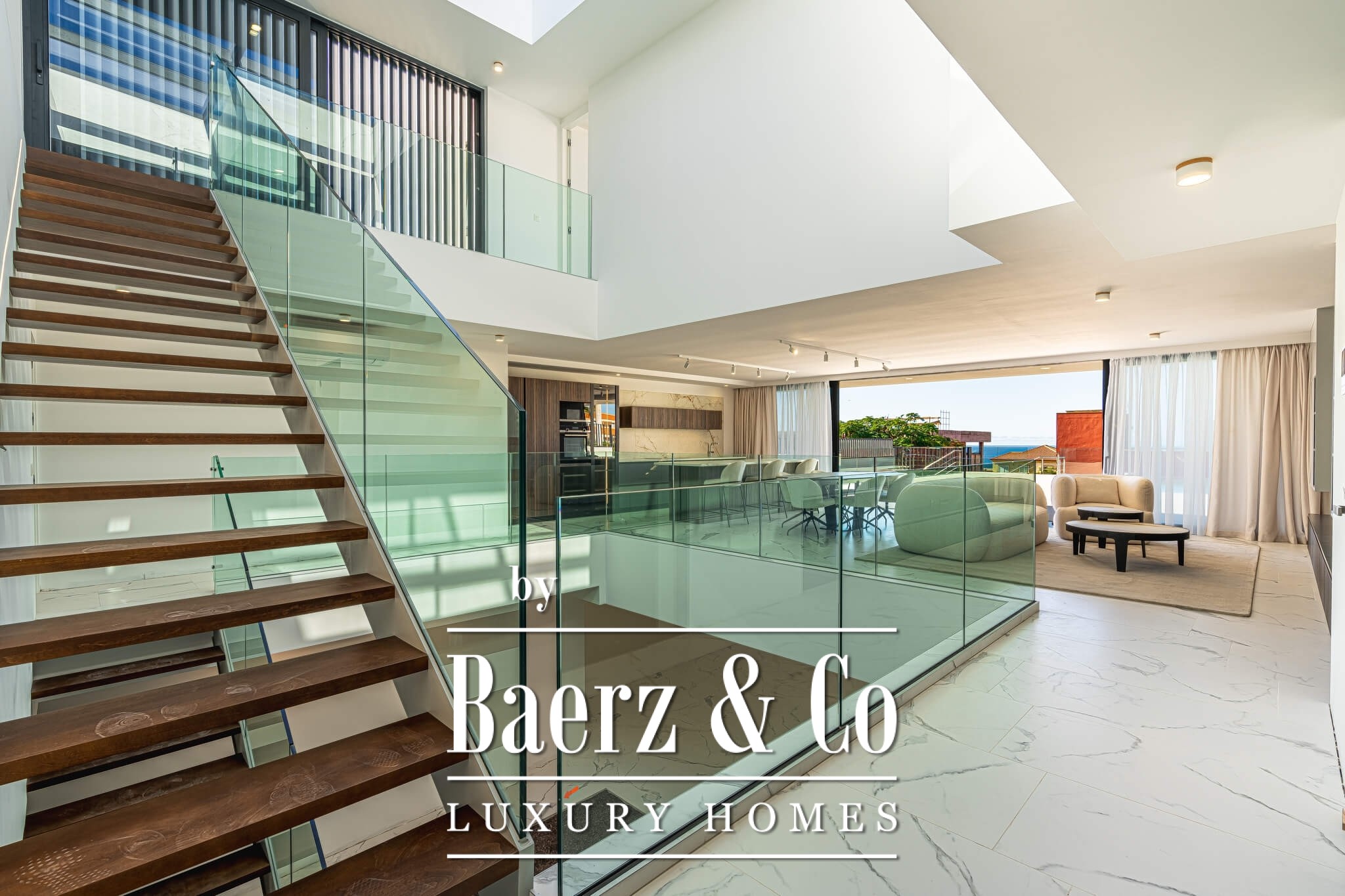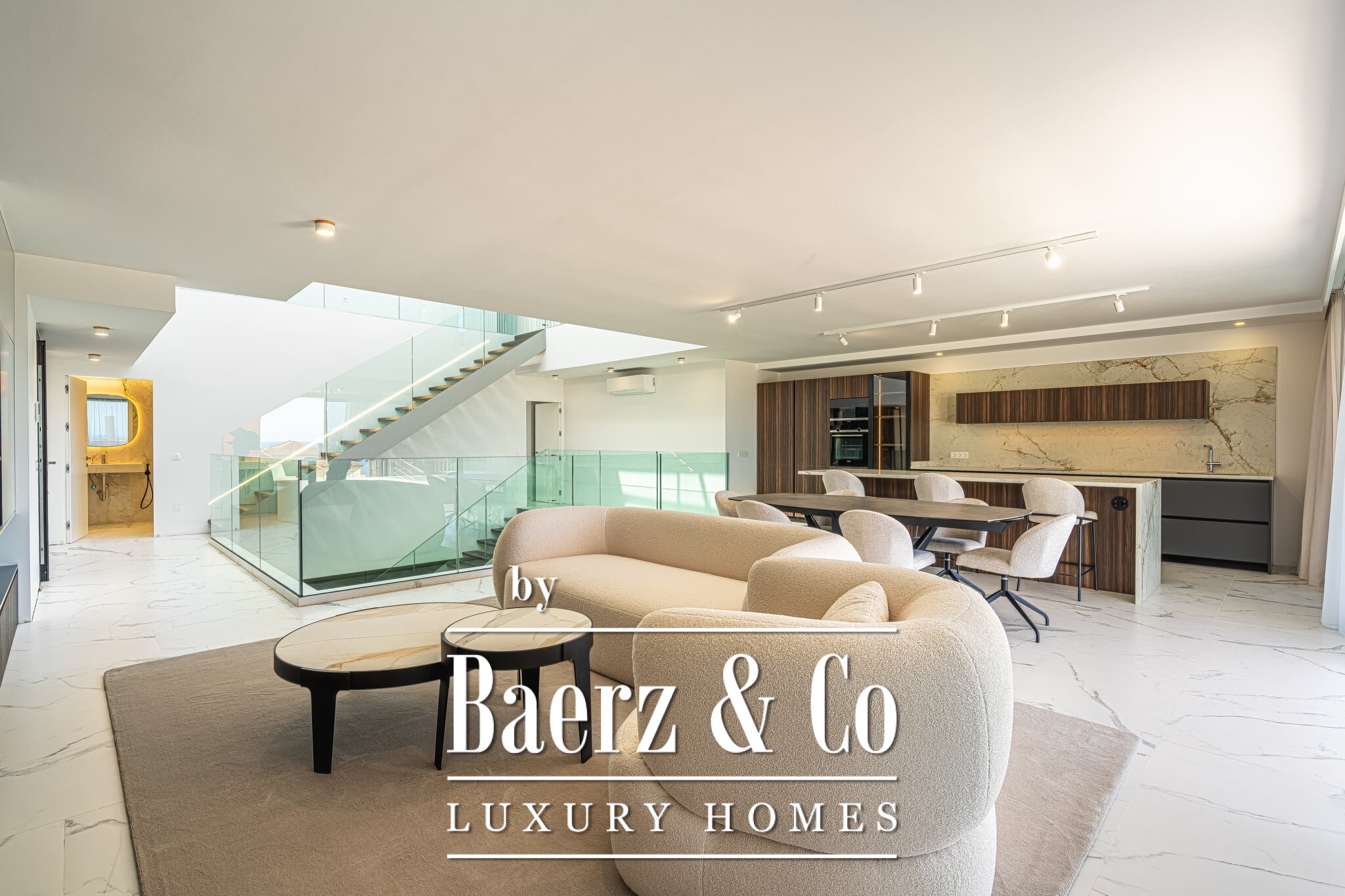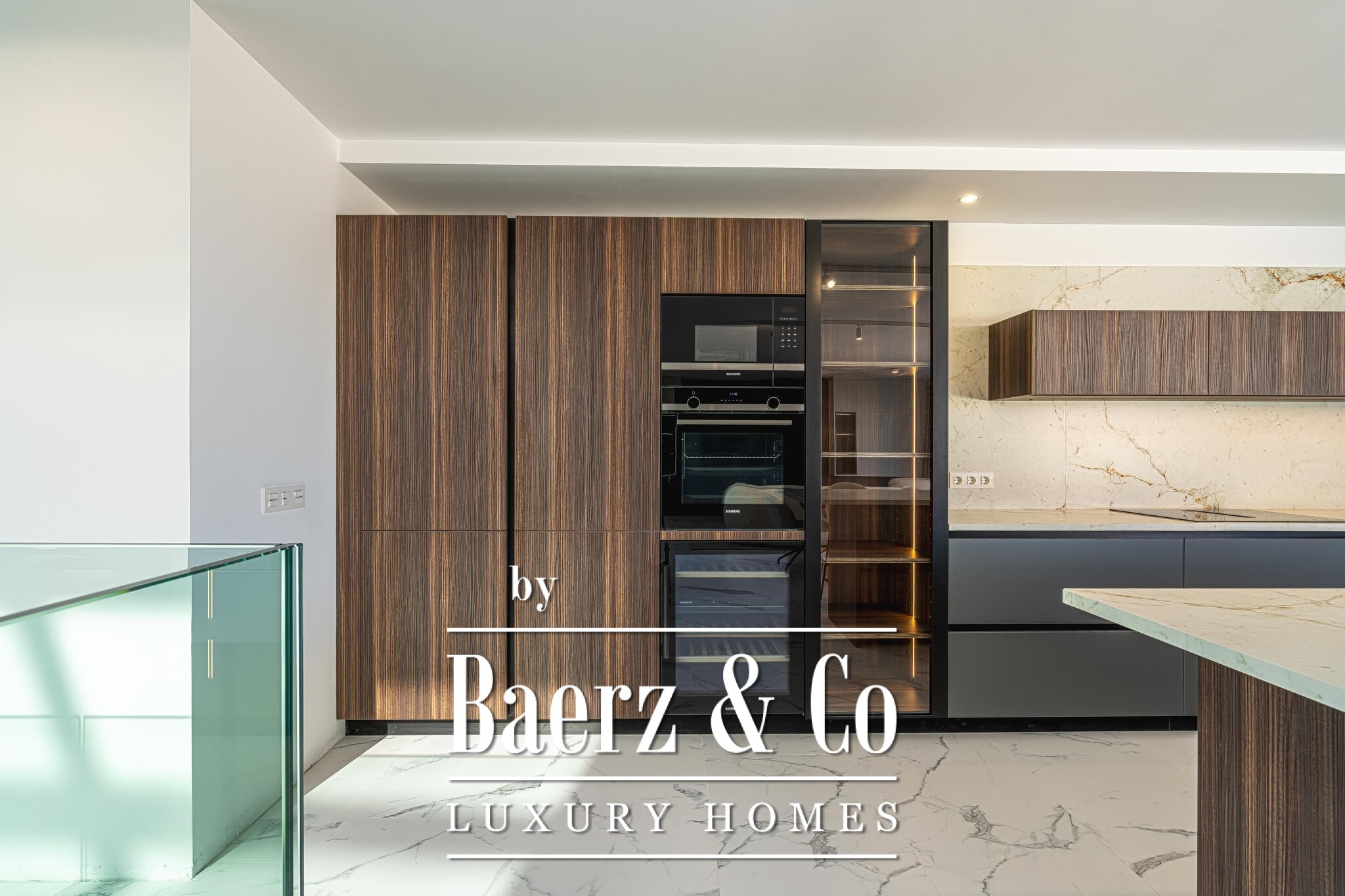 Deze prachtige villa van twee verdiepingen maakt indruk met zijn eigentijdse architectuur, rechte lijnen, duidelijke voorgevels en vertegenwoordigt modern wonen op een droomlocatie. Het comfort en het moderne, lichtdoorstroomde interieur geven een gevoel van luxe op het hoogste niveau. Dankzij de gunstige ligging en het landschap heeft het een adembenemend uitzicht.