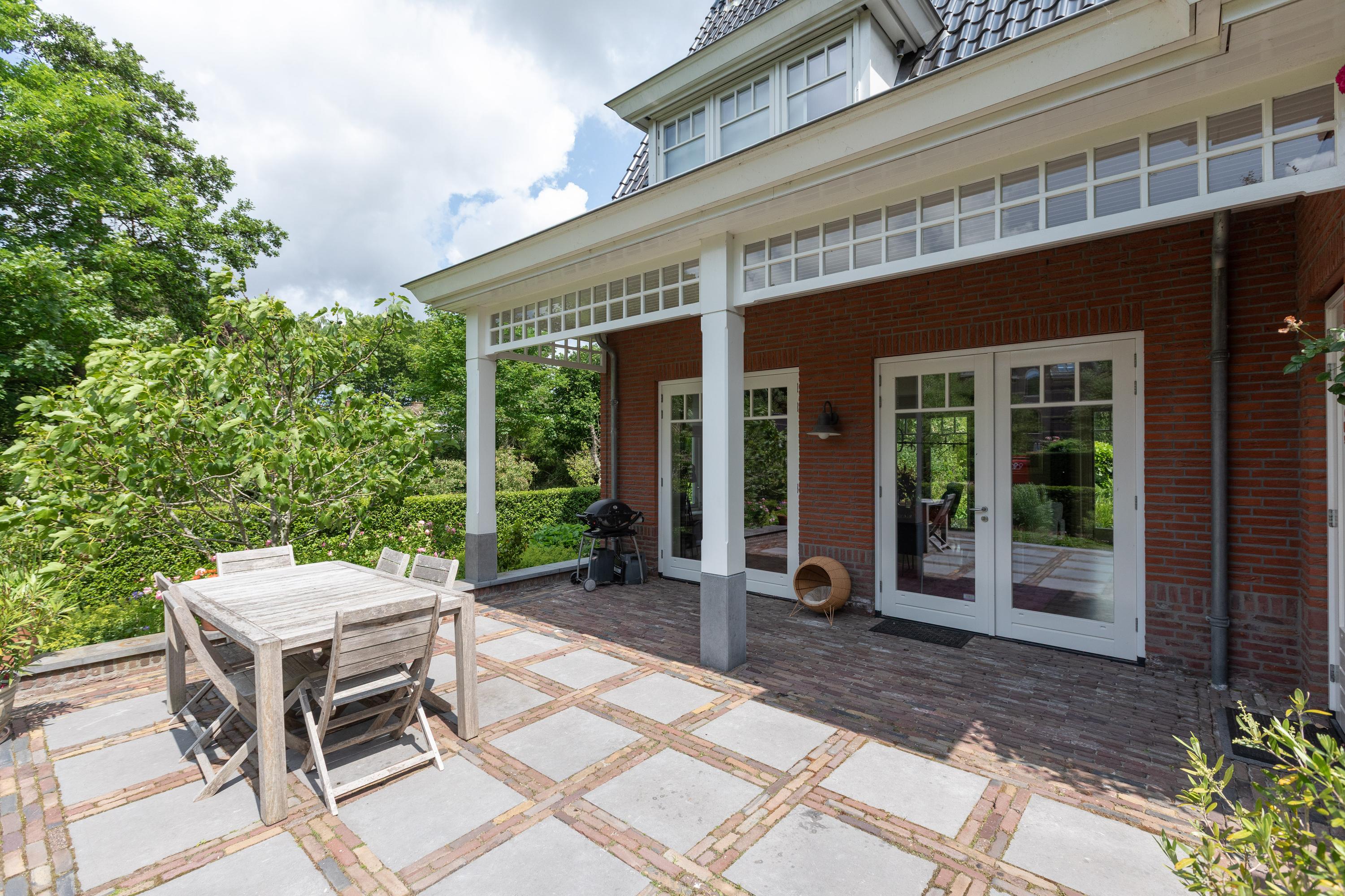 Entree, hal met garderoberuimte en meterkast. Ruime hal met aangrenzend de studeerkamer (3.80 x 3.40m). Toiletruimte. Woonkamer met fraaie visgraat-parketvloer en open haard. De woonkamer heeft meerdere openslaande deuren naar de omliggende tuin. Woonkeuken (Siematic, 4.18 x 5.30m) met Amerikaanse koel-/vrieskast, 6-pitsgaskookplaat met oven, afzuigkap, vaatwasser en aparte combi oven-/magnetron. Bijkeuken alwaar aansluitingen voor de wasmachine en droger. Zonnig, riant terras (6.05 x 6.22m).