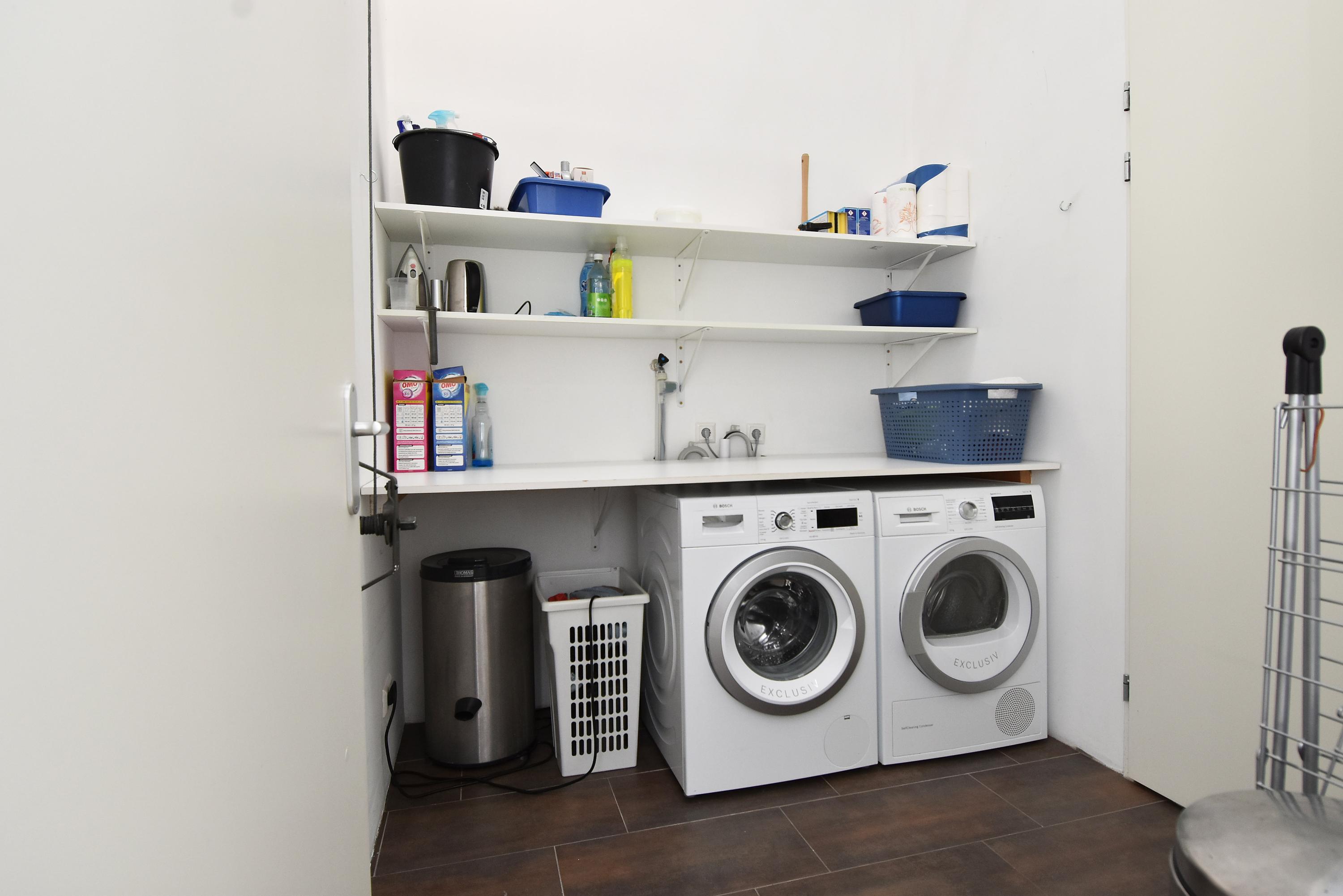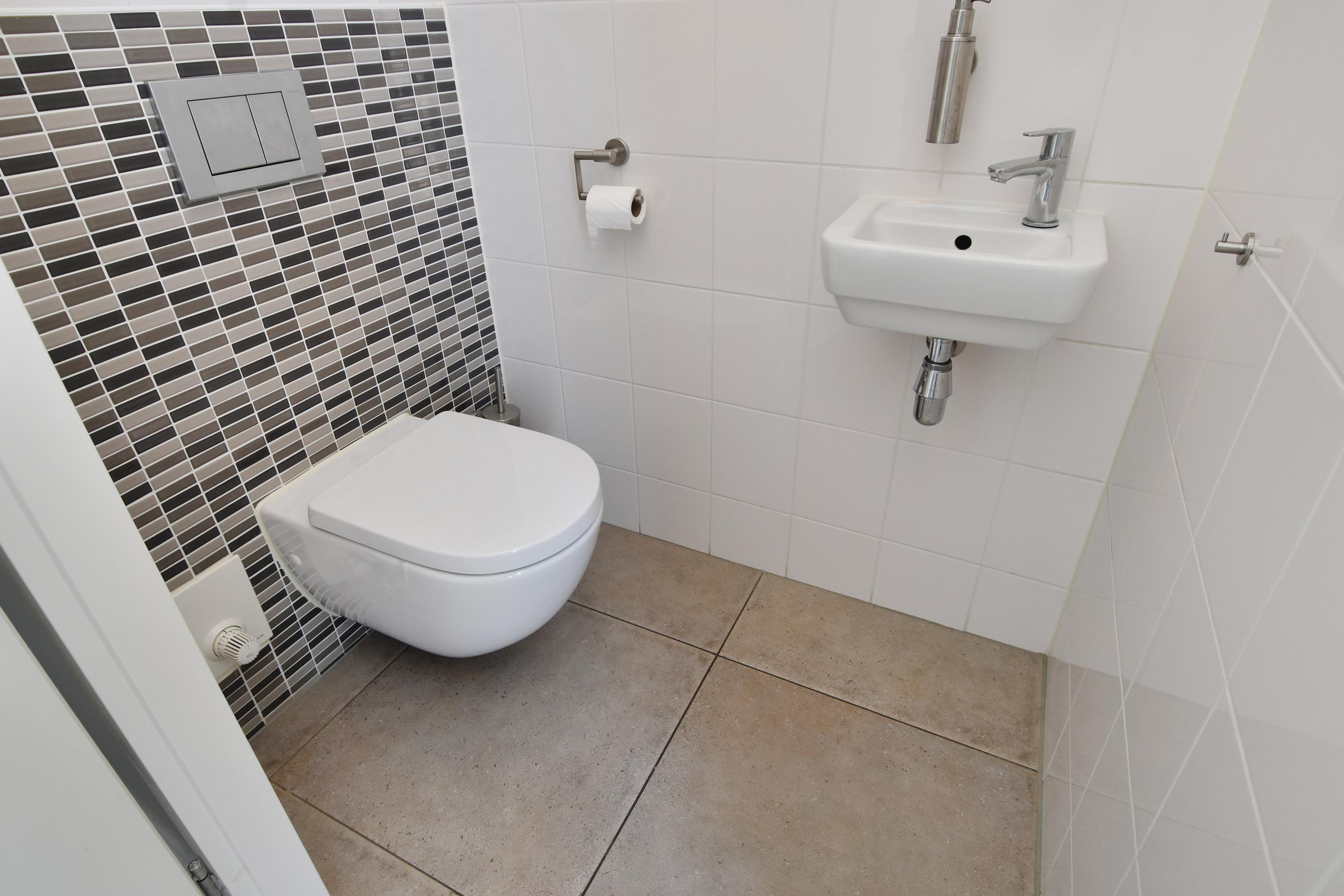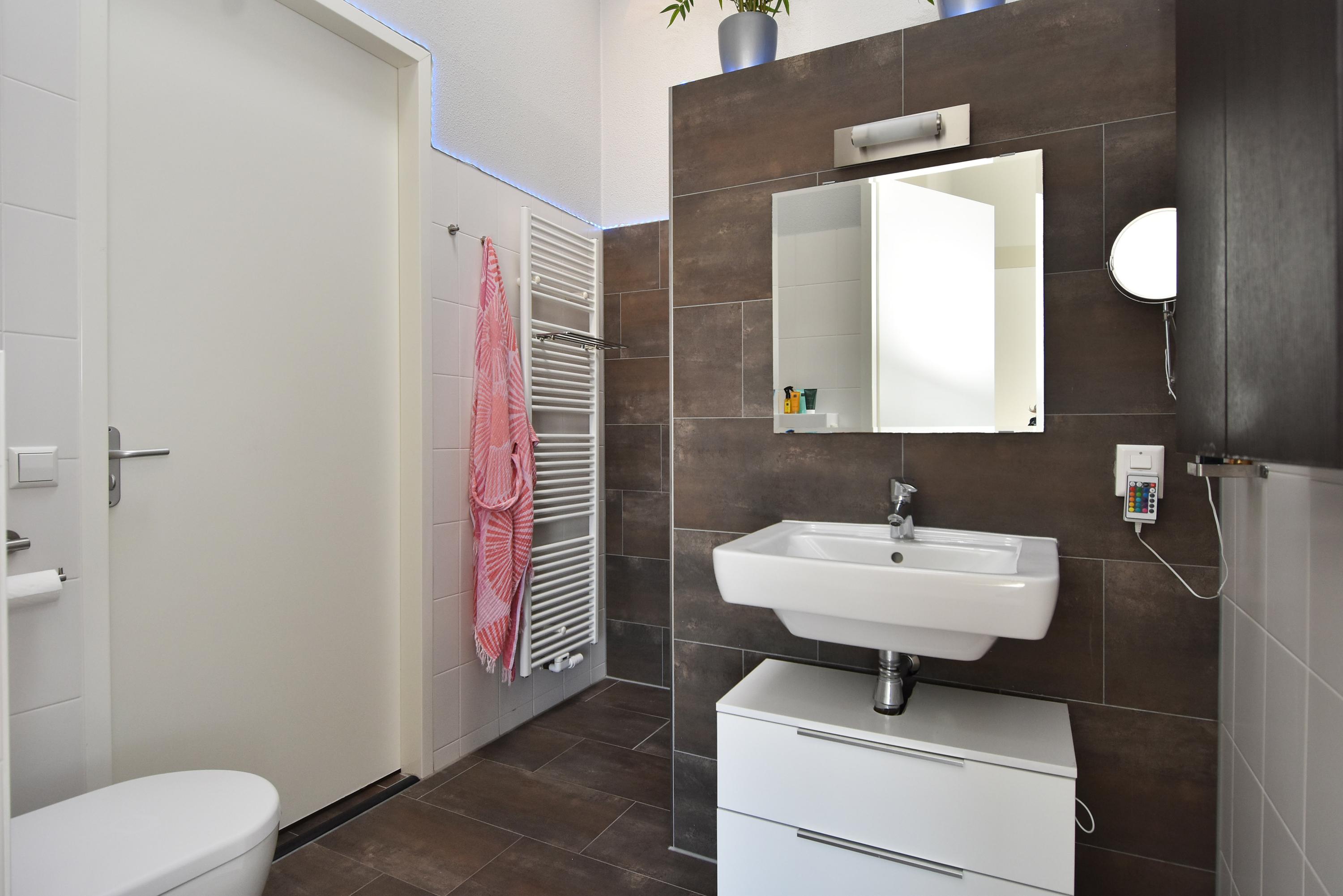 De tweede badkamer is modern en beschikt over een wastafel, een ruime inloopdouche en een derde toilet.