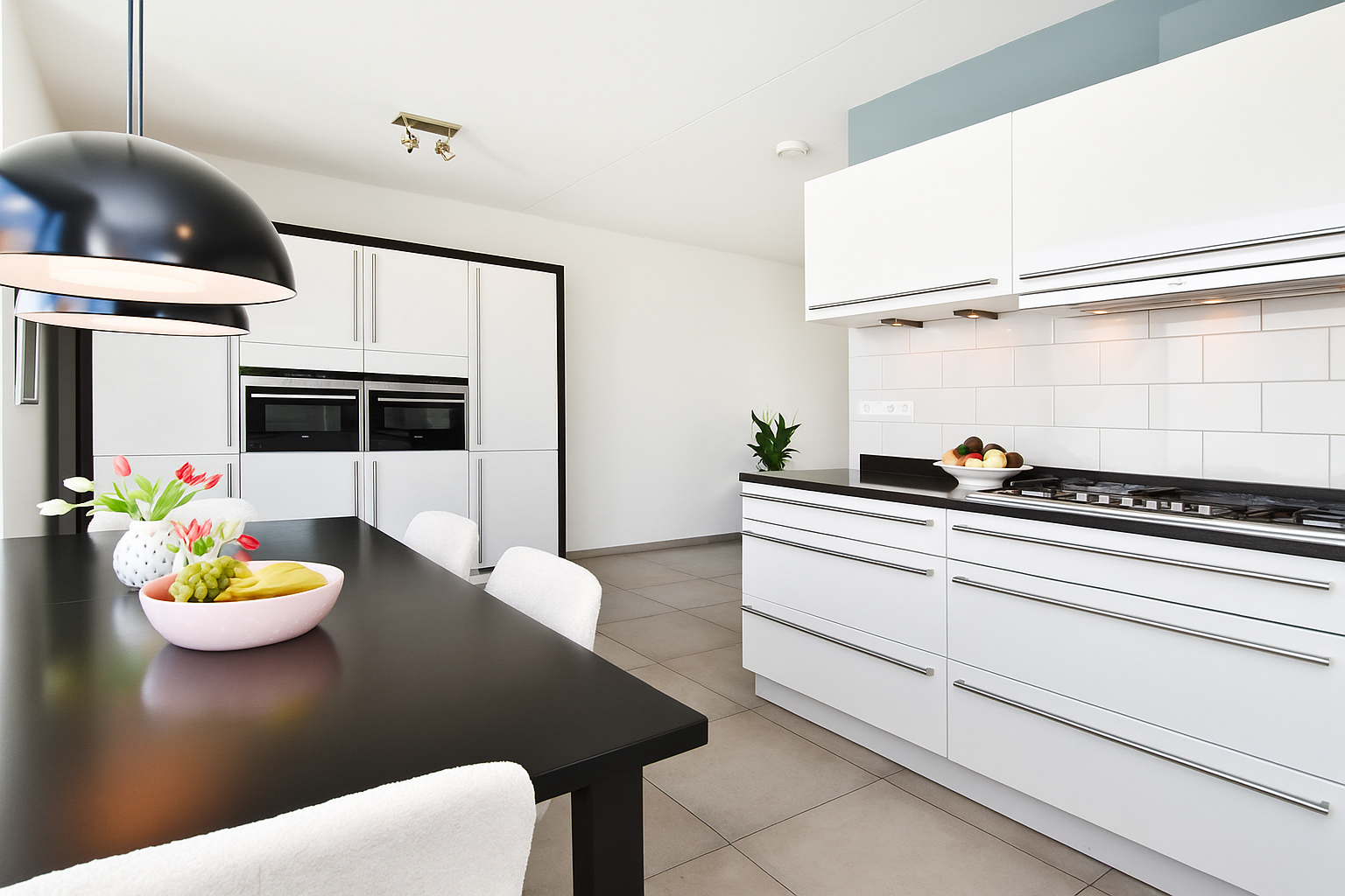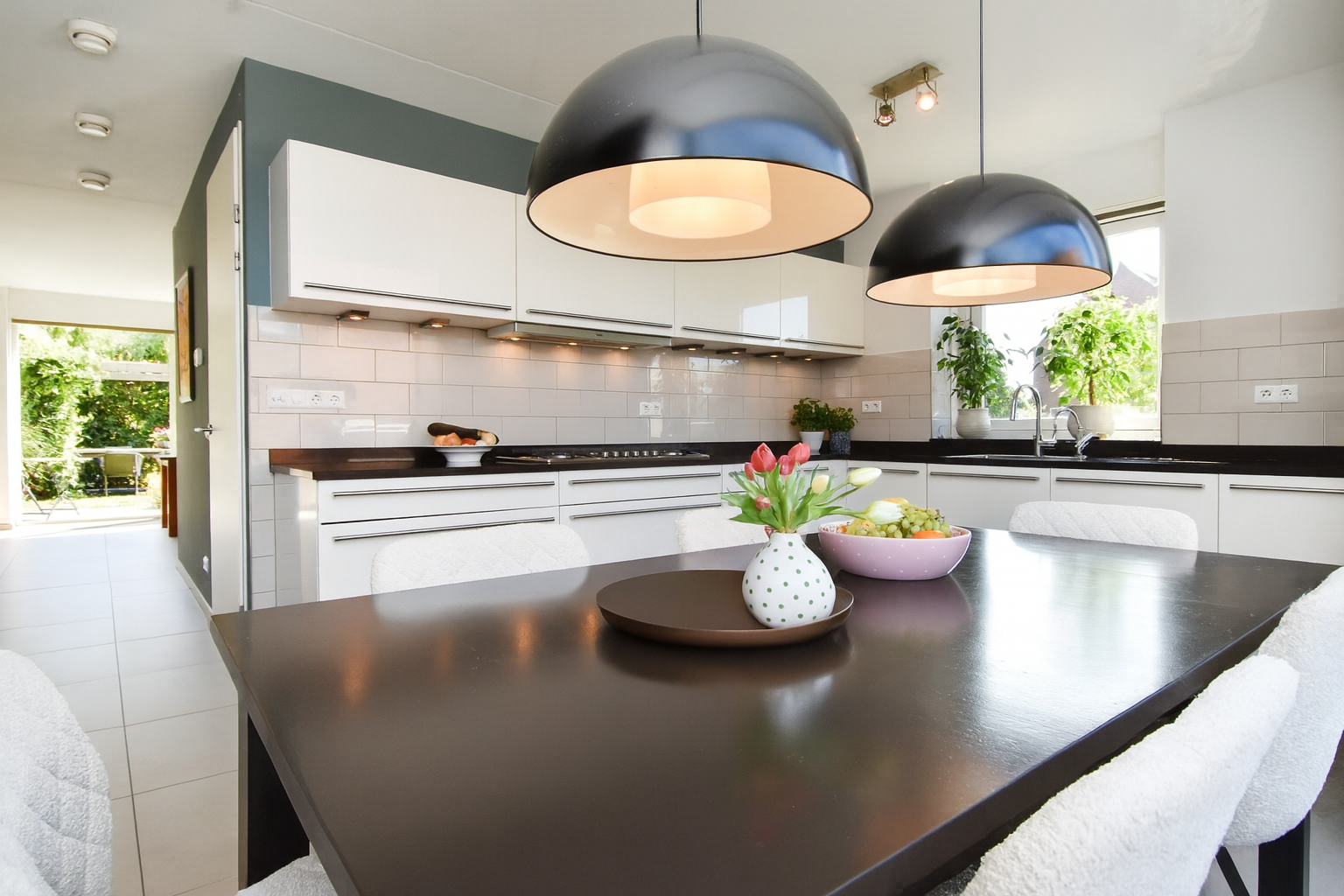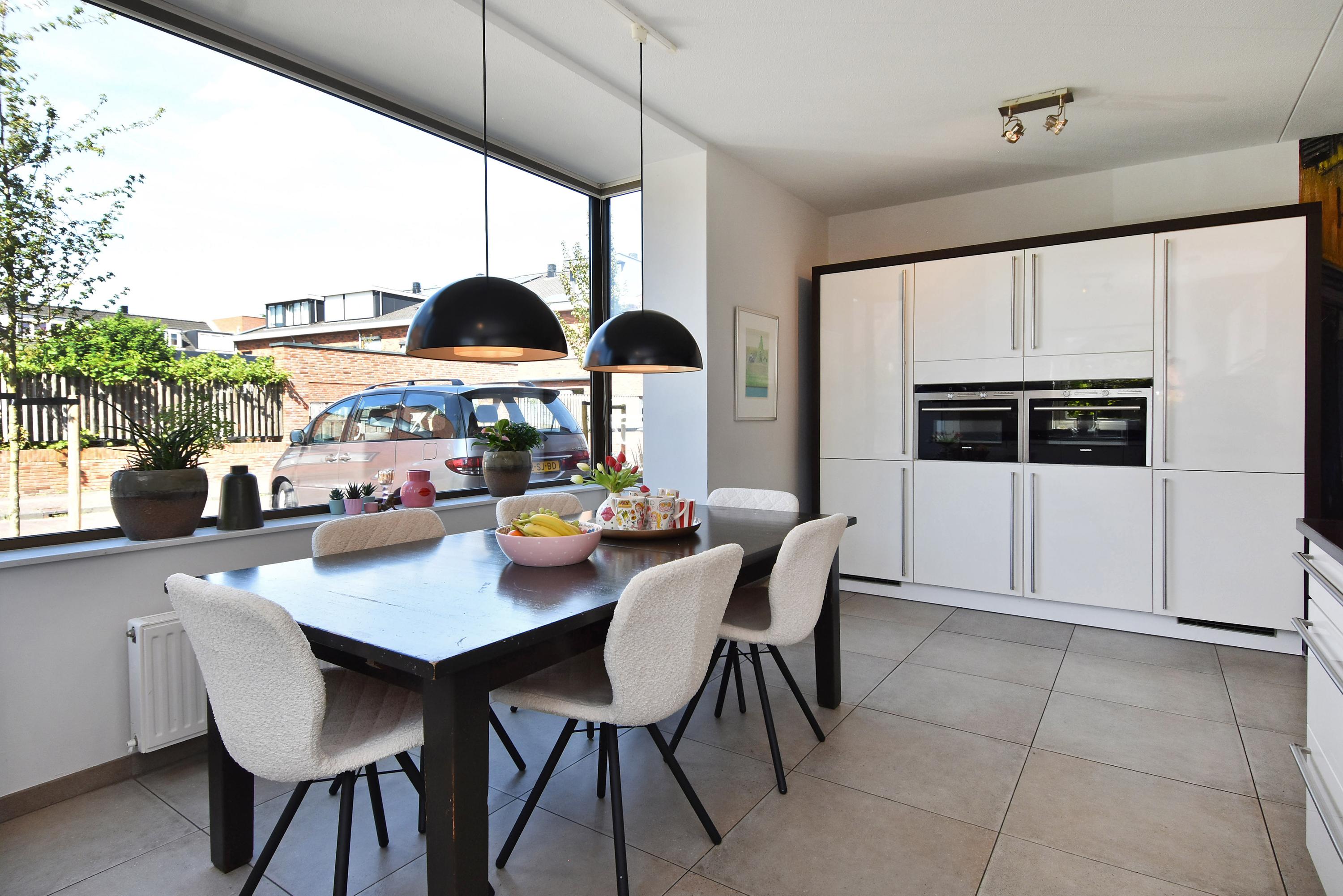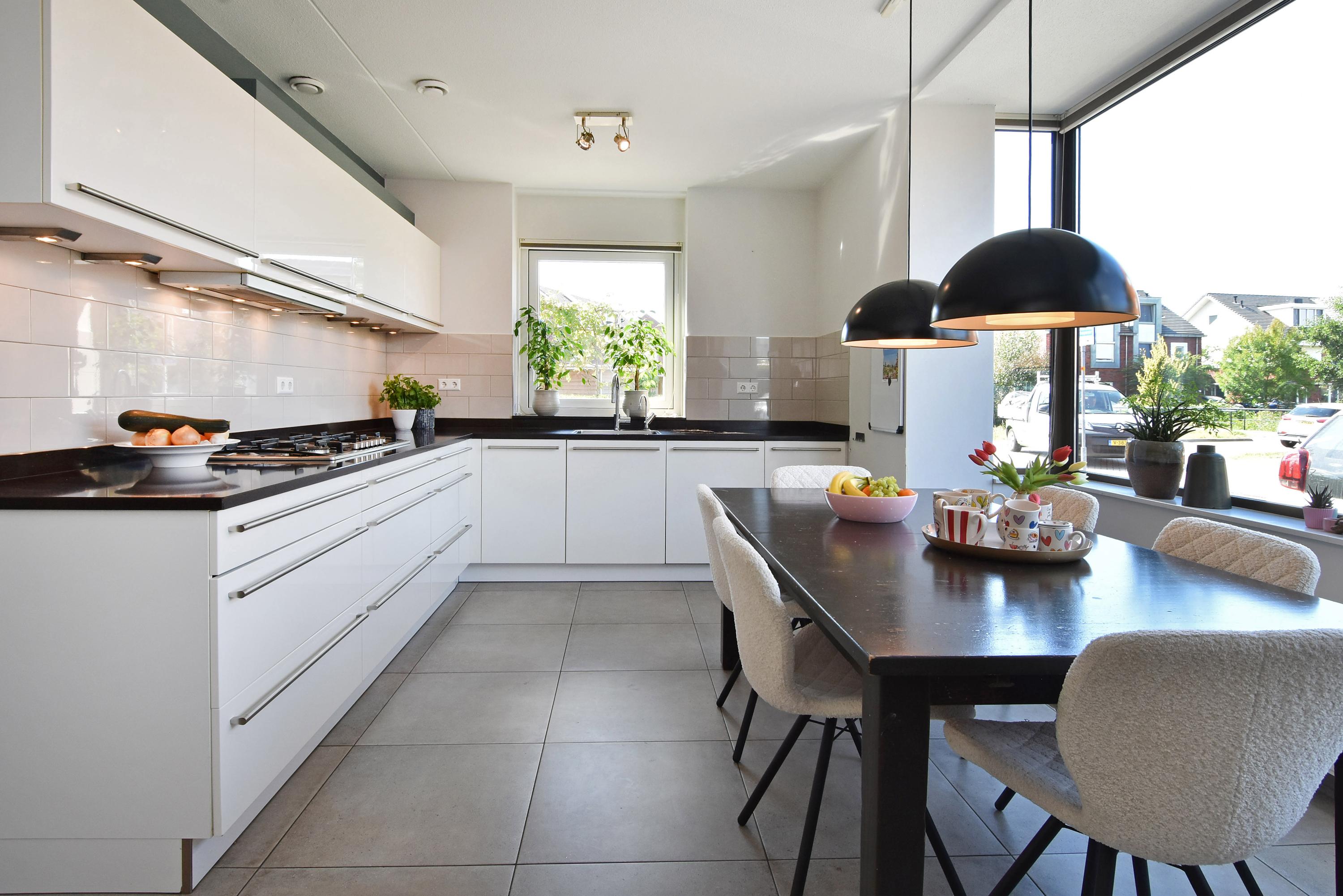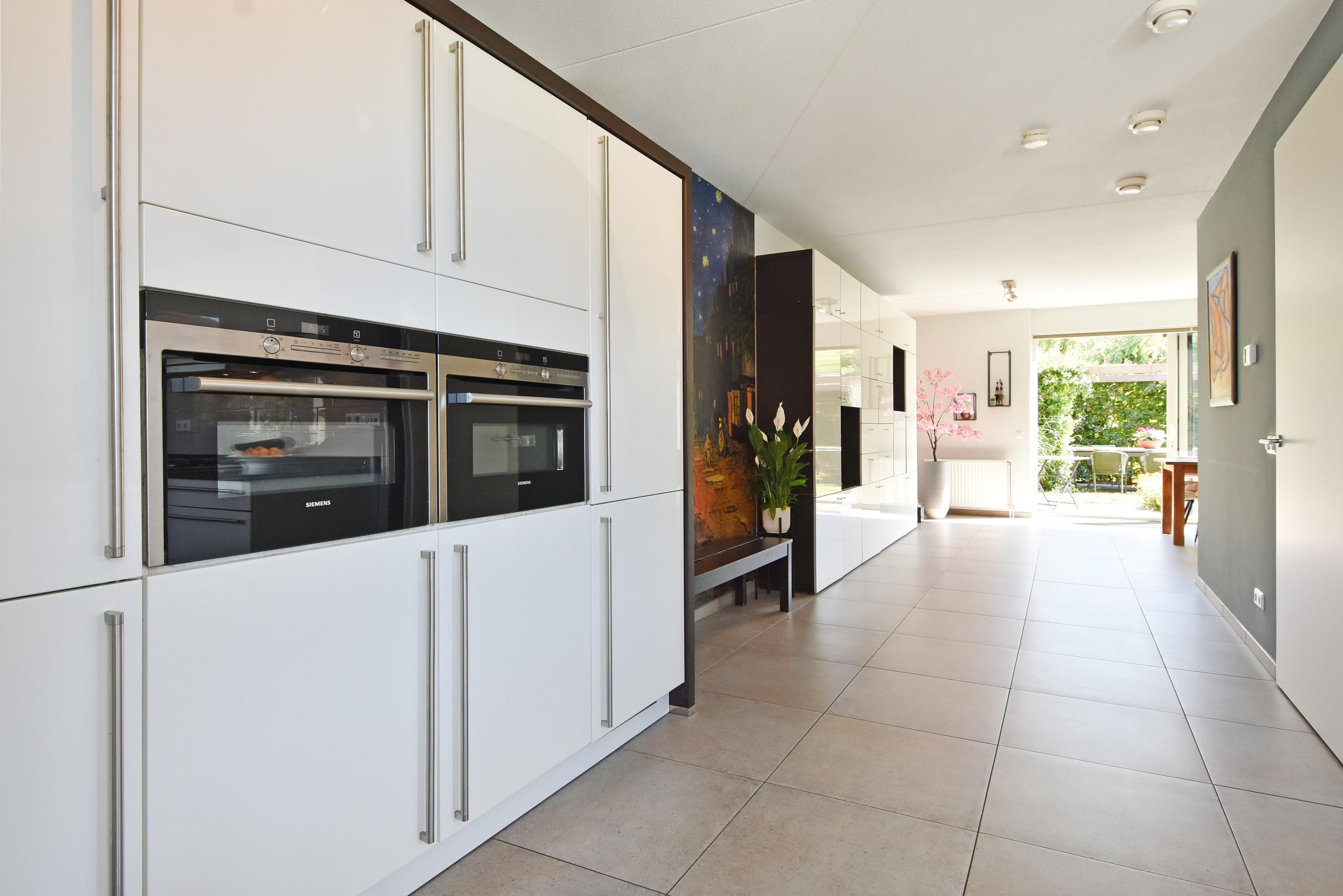 Aan de voorzijde is er een moderne eetkeuken, deze is geplaatst in een praktische U-vorm. Dankzij de grote ramen is de keuken opvallend licht en bovendien van alle gemakken voorzien met hoogwaardige inbouwapparatuur. Er is ruim plaats voor een royale eettafel, waardoor de keuken het kloppend hart van het huis vormt.