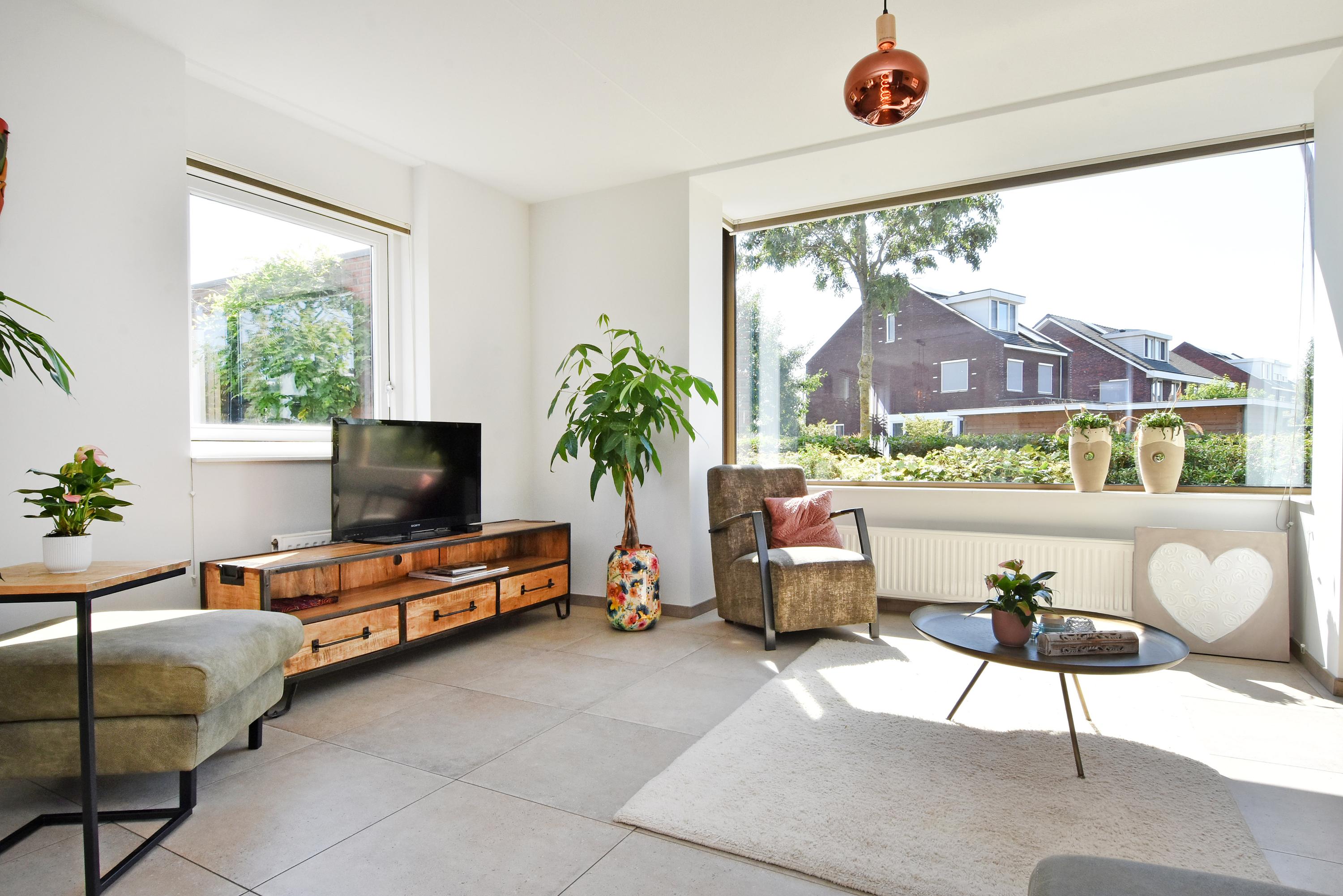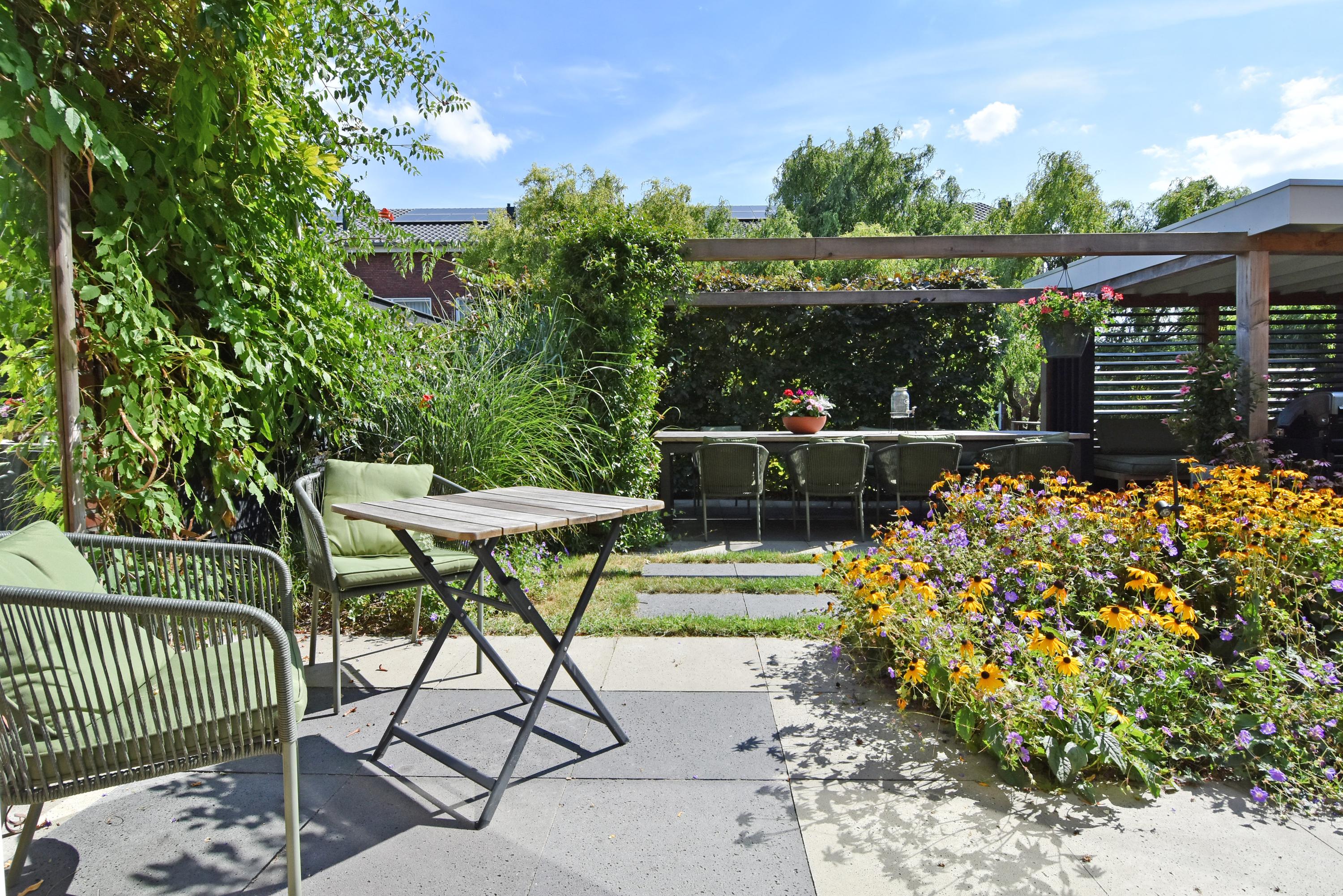 Vanuit de ruime hal kom je de sfeervolle, lichte living binnen. Deze vormt door de grote schuifpui een prachtige verbinding met de zonnige tuin. De tuin is recent fraai aangelegd en voorzien van veel groen, een gazon een zonnig terras, een veranda en overkapping: een heerlijke plek om het hele jaar door te genieten en relaxen. De tuin grenst aan het water.