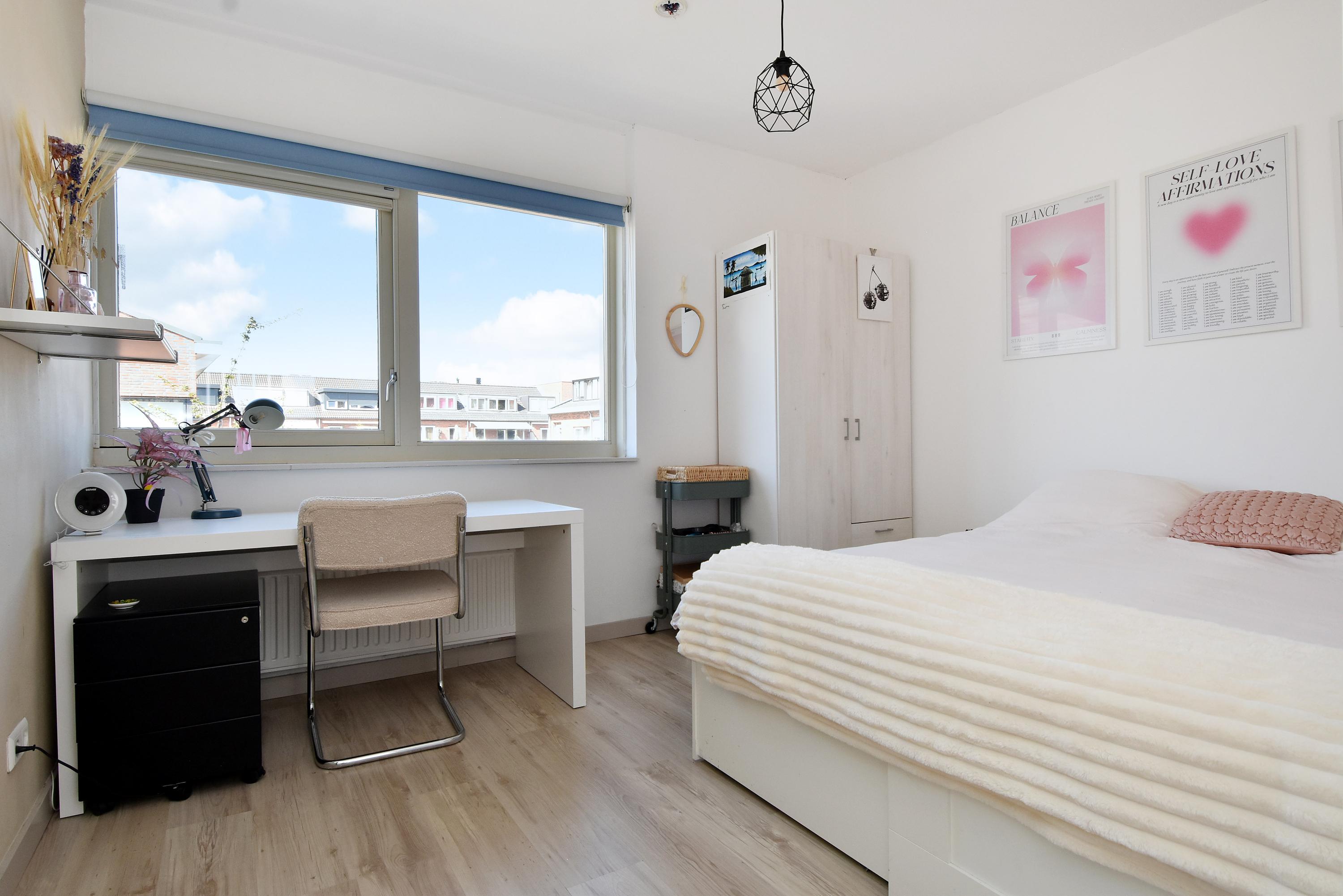 De derde slaapkamer/studio (thans ouderslaapkamer) die toegang biedt tot het terras heeft een speelse indeling met een bijzonder fraaie plafondhoogte van meer dan 4 meter (!) met een entresol en vide.
