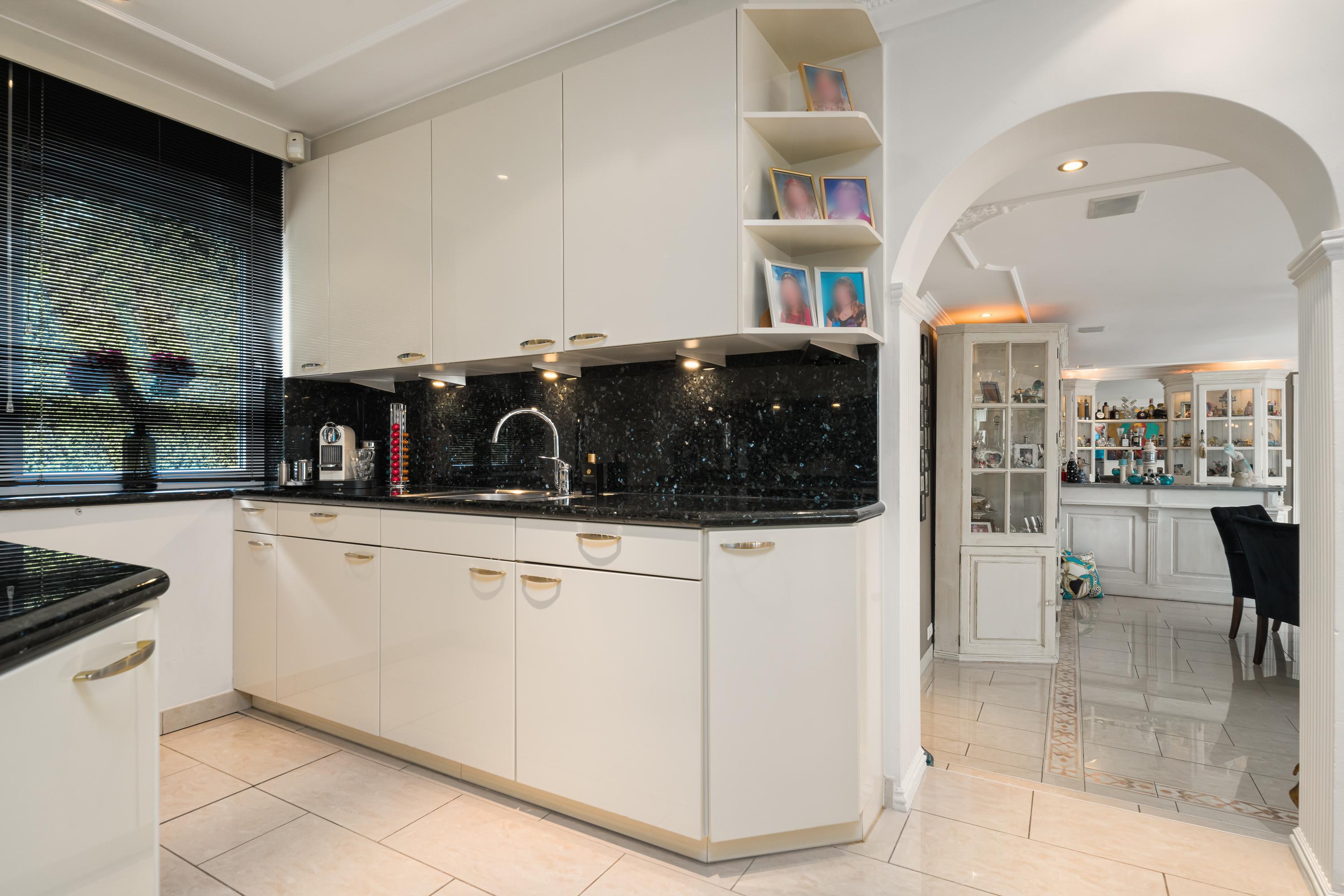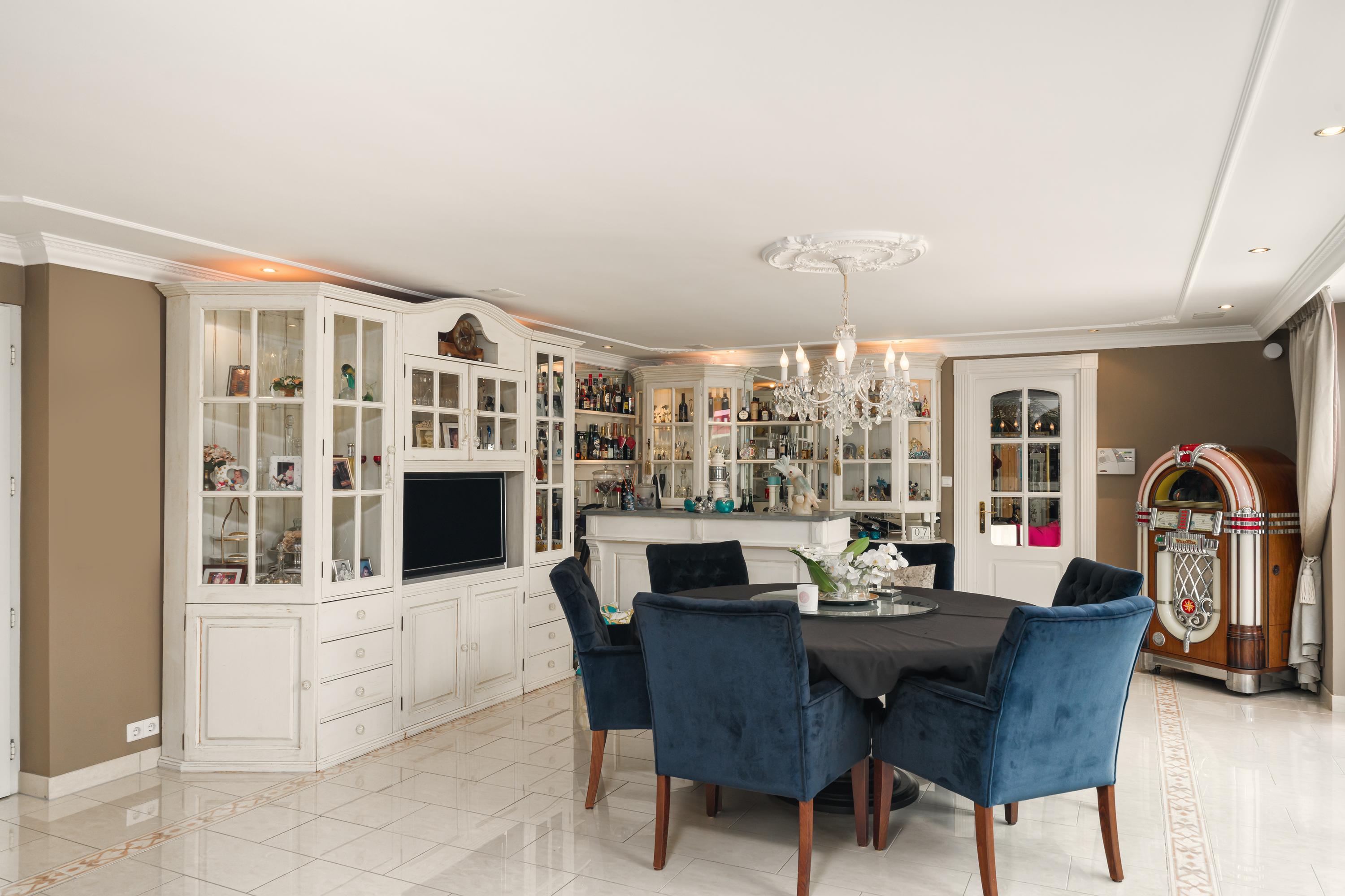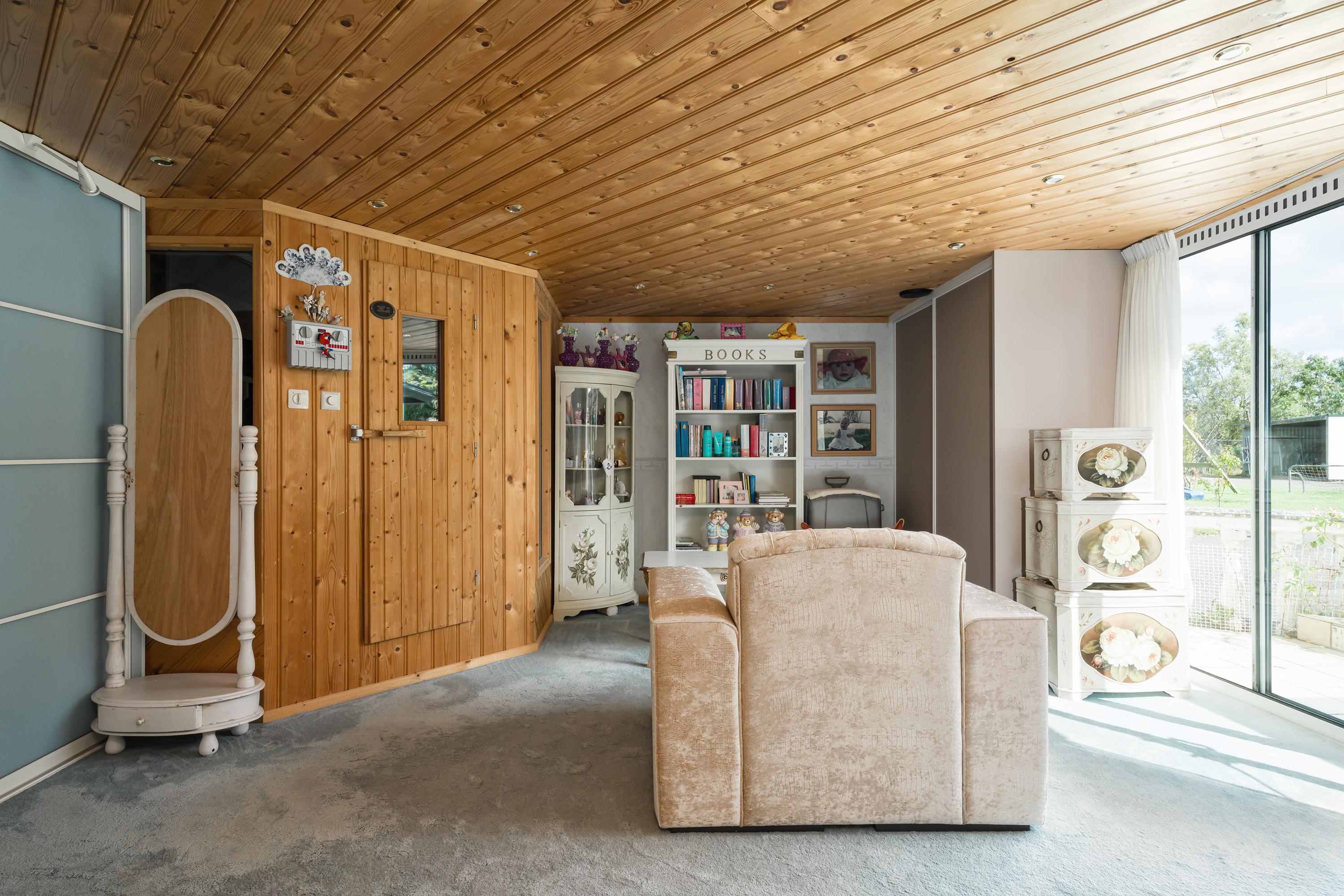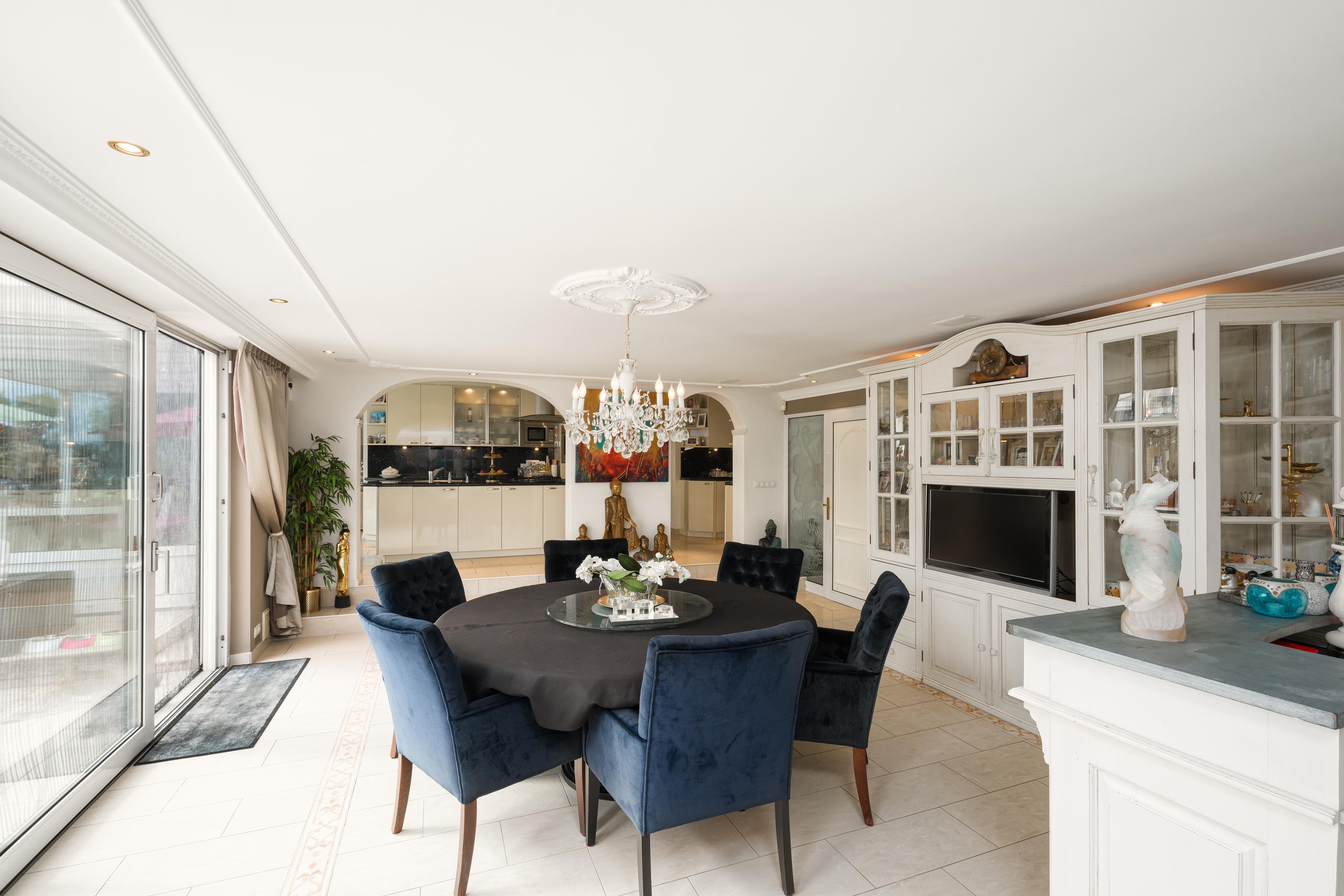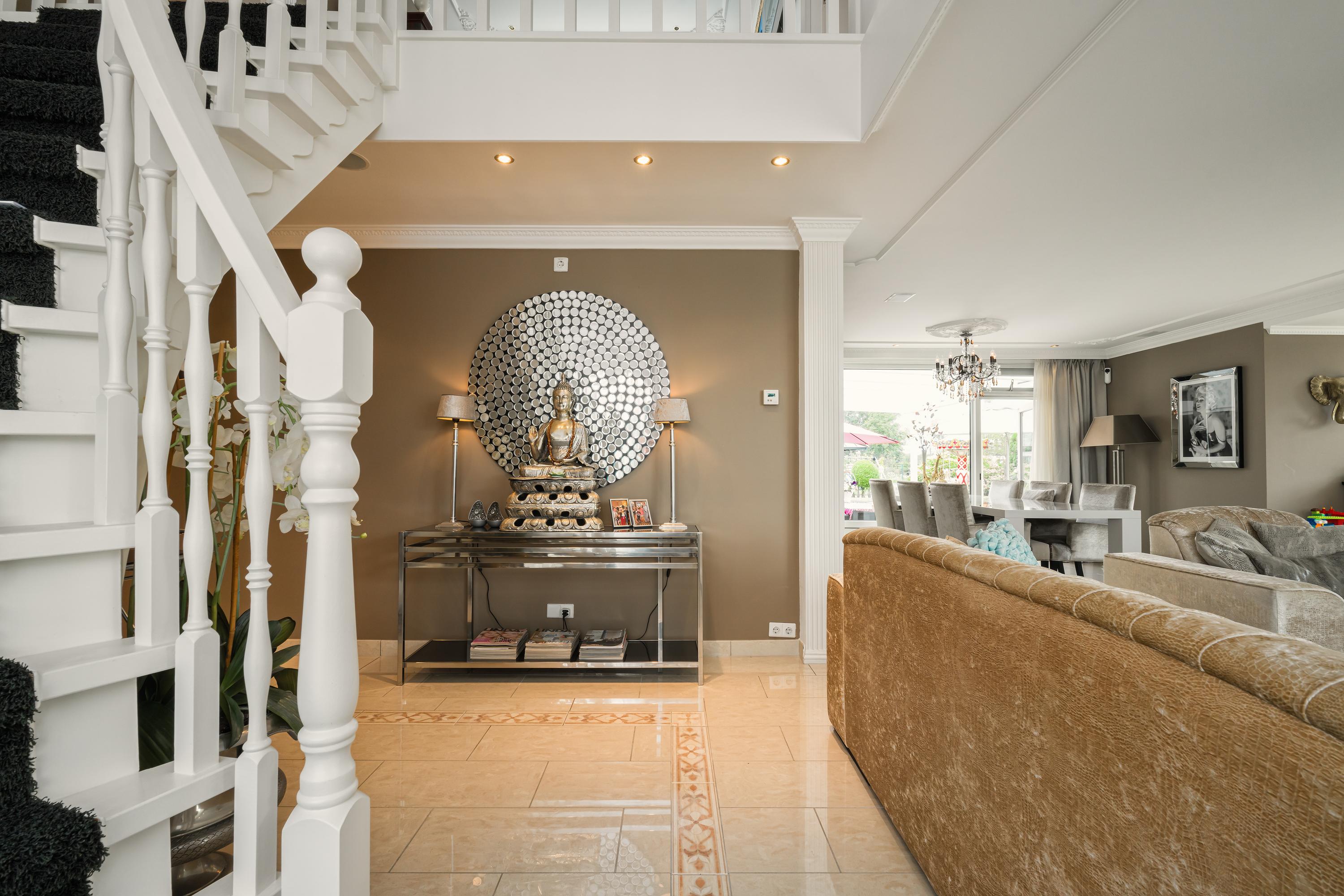 Zij-entree, hal, eetkamer, grenzend aan de tuin / het terras, open keuken met eiland, living met erker en open haard, bijkeuken, badkamer 1, trapopgang naar de verdieping. Masterbedroom met open 2e badkamer, doorgang naar de ruime wellness ruimte met sauna en kledingkasten. Ook vanuit de masterbedroom en de wellness ruimte heb je toegang tot de tuin via de ruime puien.