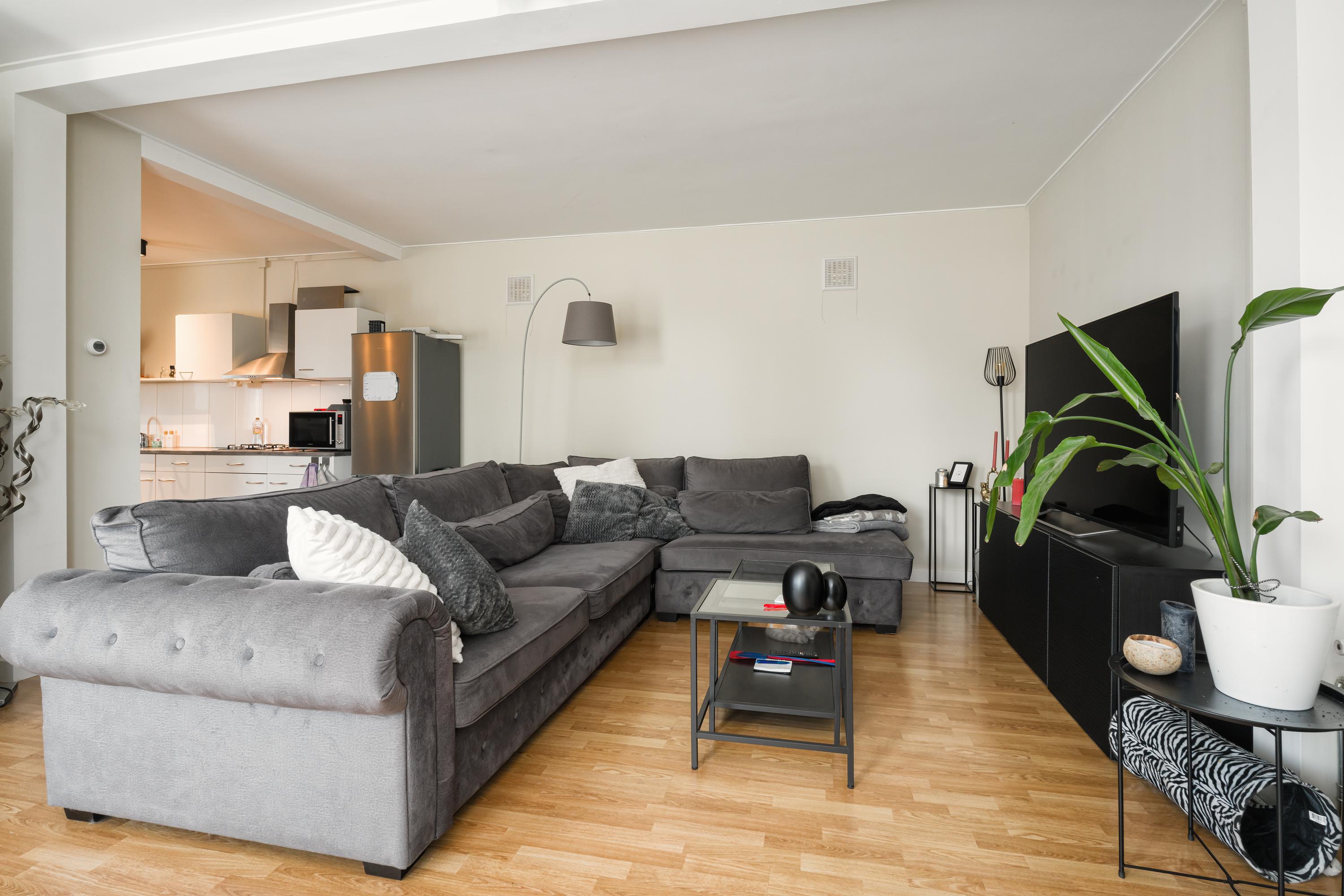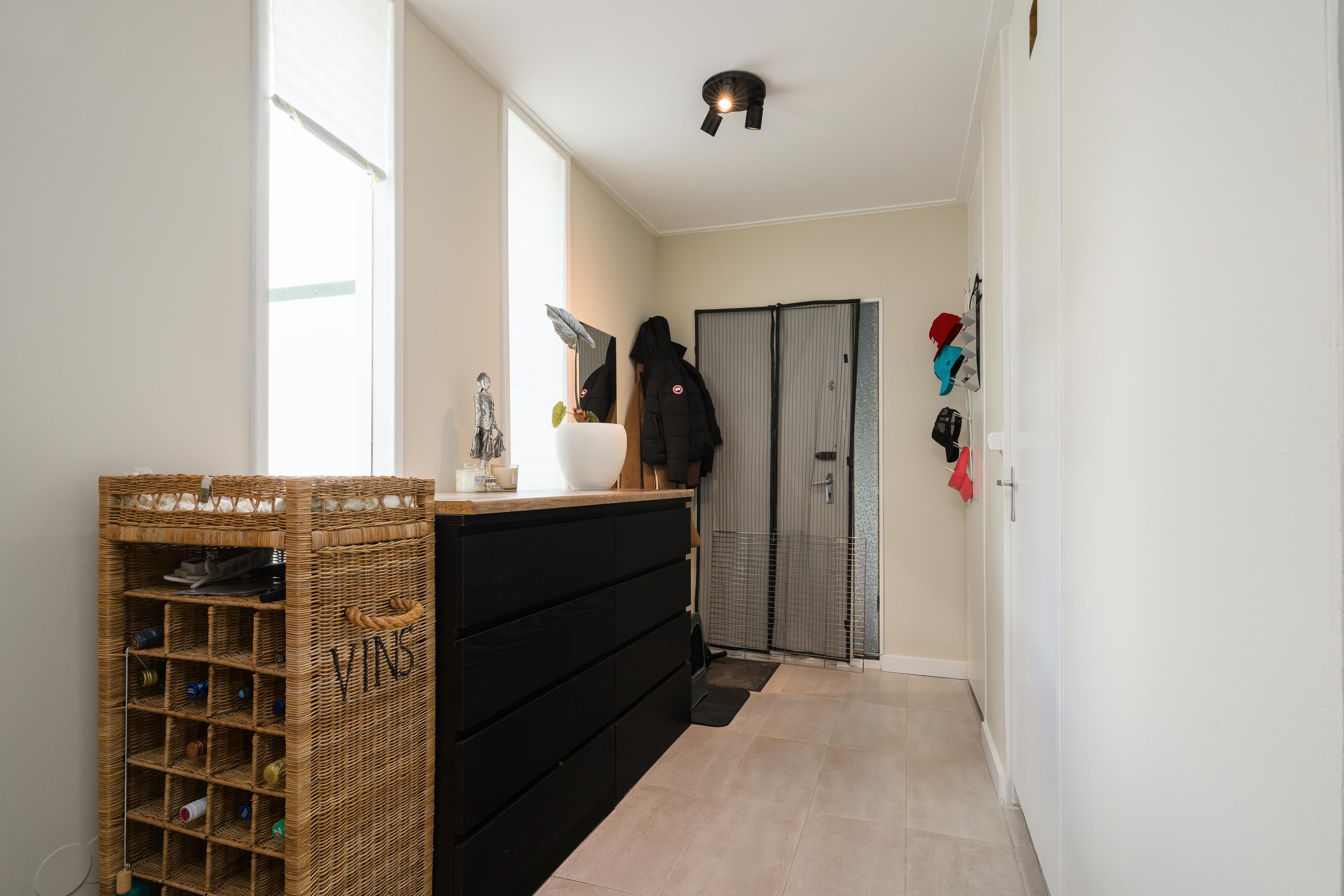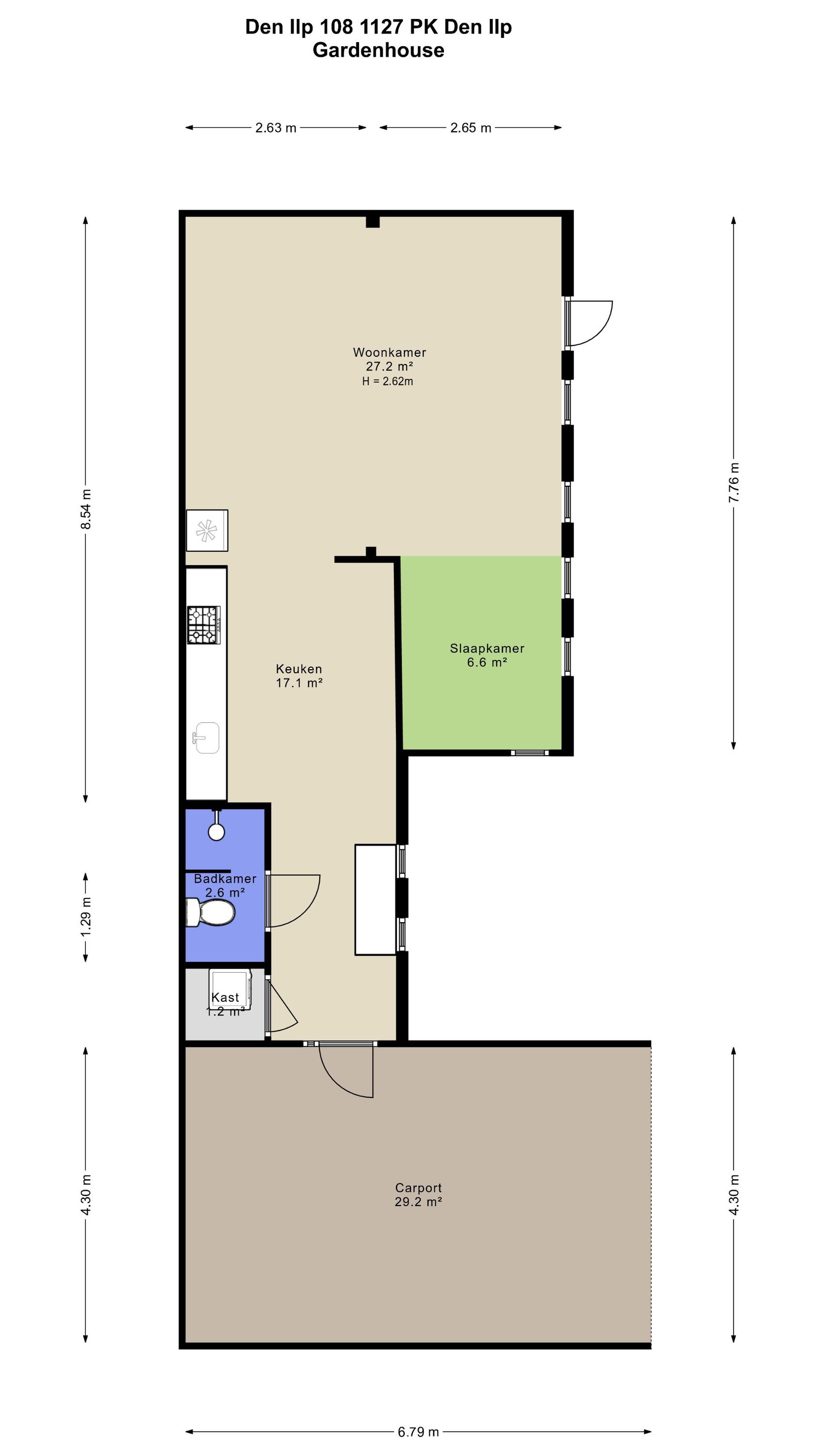 Zij entree, onder de dubbele carport, open keuken, douche, living, slaapkamer.