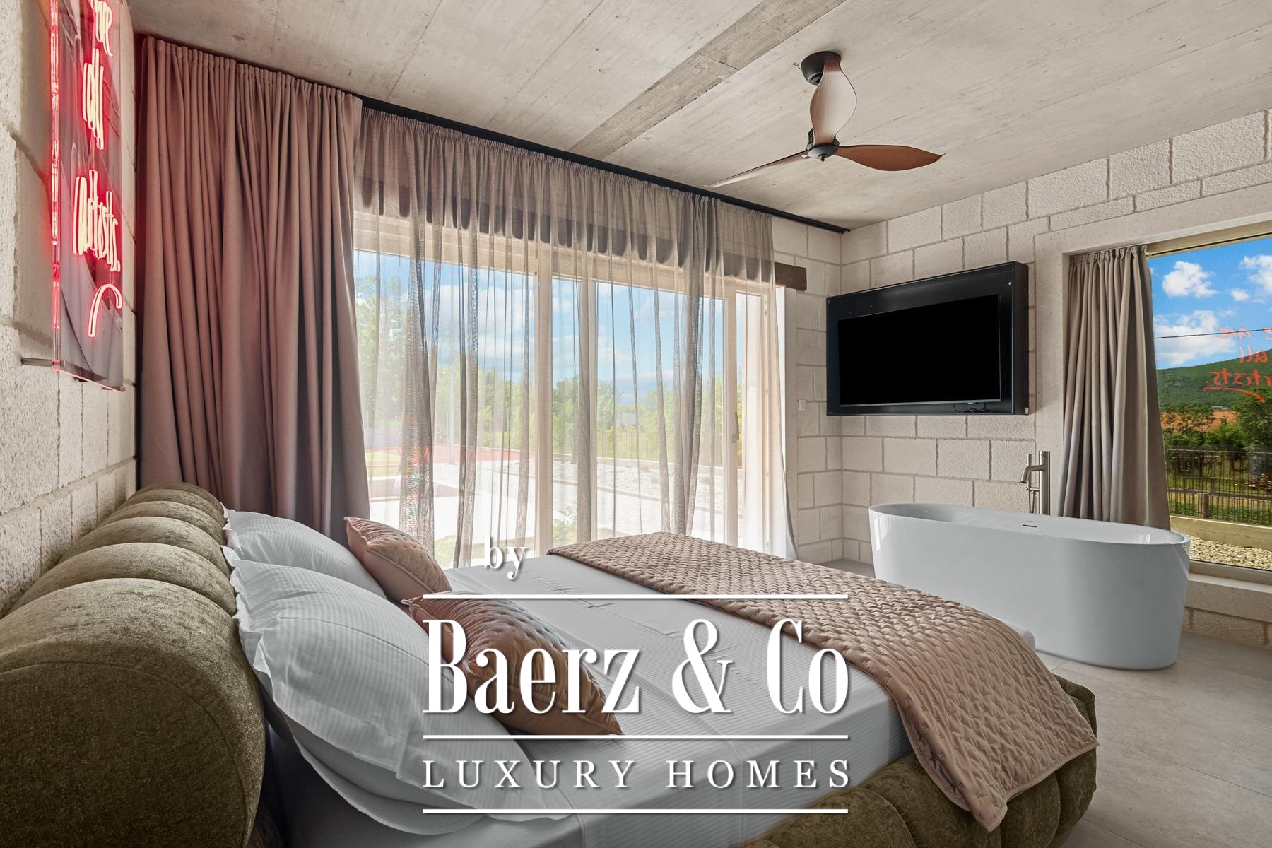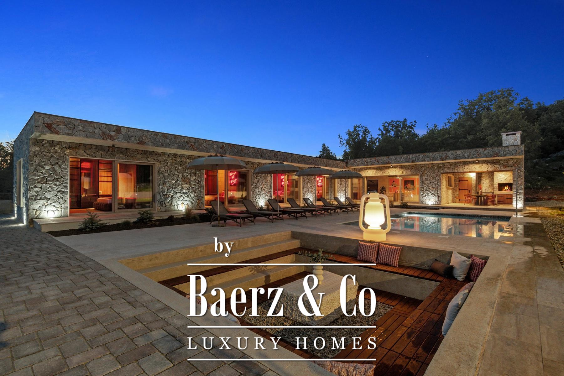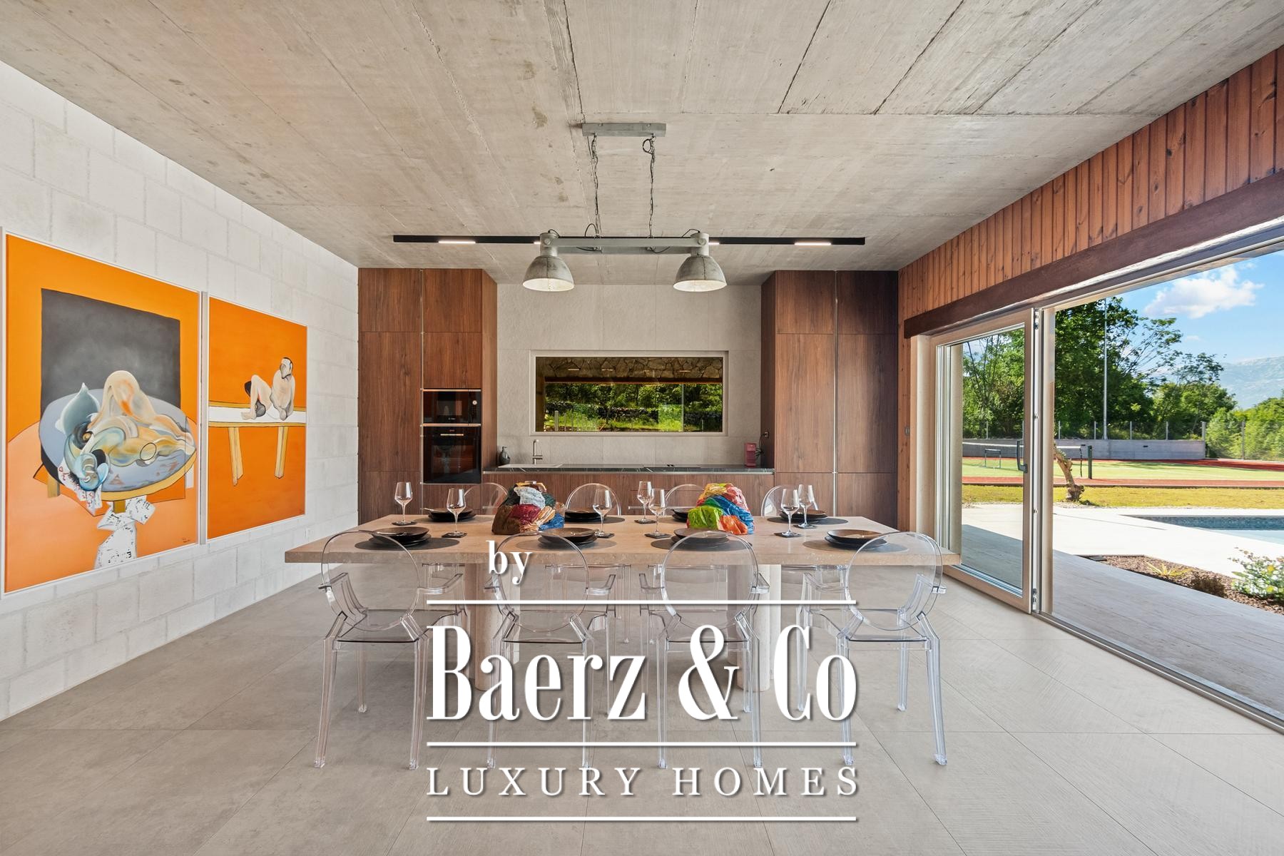 In the vicinity of Split, there is this completely different newly built villa with a swimming pool and tennis court. It is located on a plot of 2130 m2, on the very edge of the green zone, surrounded by peace and beautiful nature.It is a single-storey house with an excellently designed living space, which extends to 240 m2.The living area (living room, kitchen, dining room) of 70 m2 is maximally opened with excellent sliding walls (Gelan), and has a view of the summer kitchen, tennis court and swimming pool.The furniture throughout the building is custom-made with designer pieces (armchairs, paintings, ...).The walls are decorated with natural materials (stone, wooden panels), while the dining table is entirely