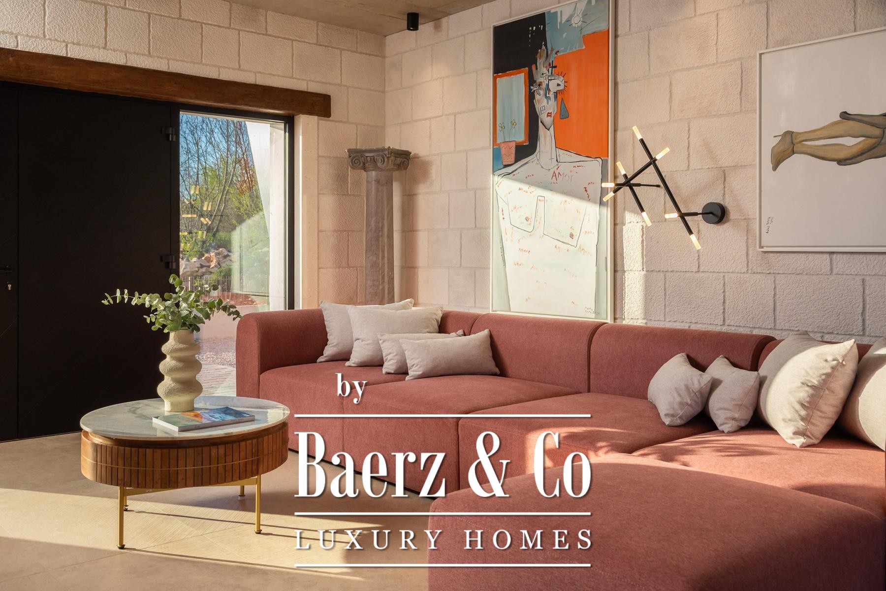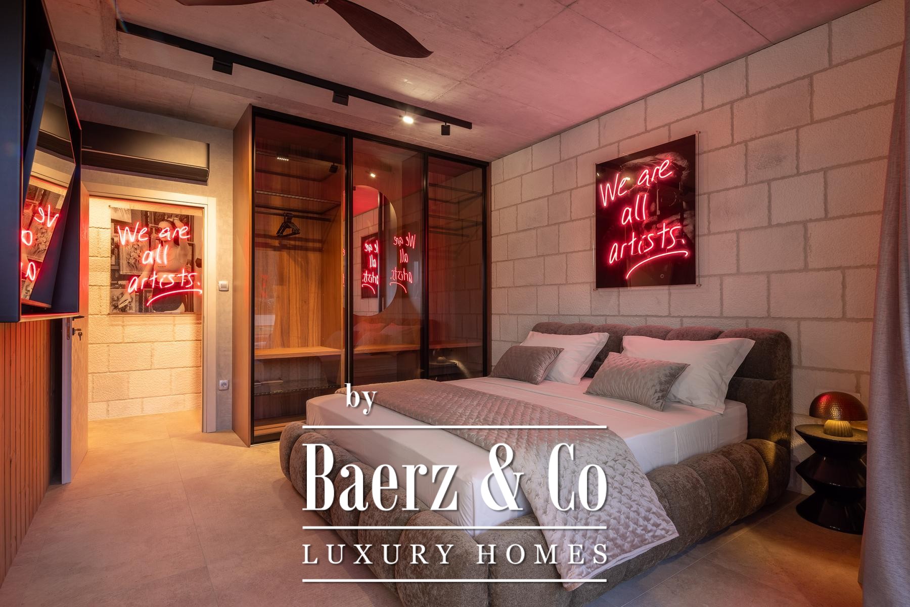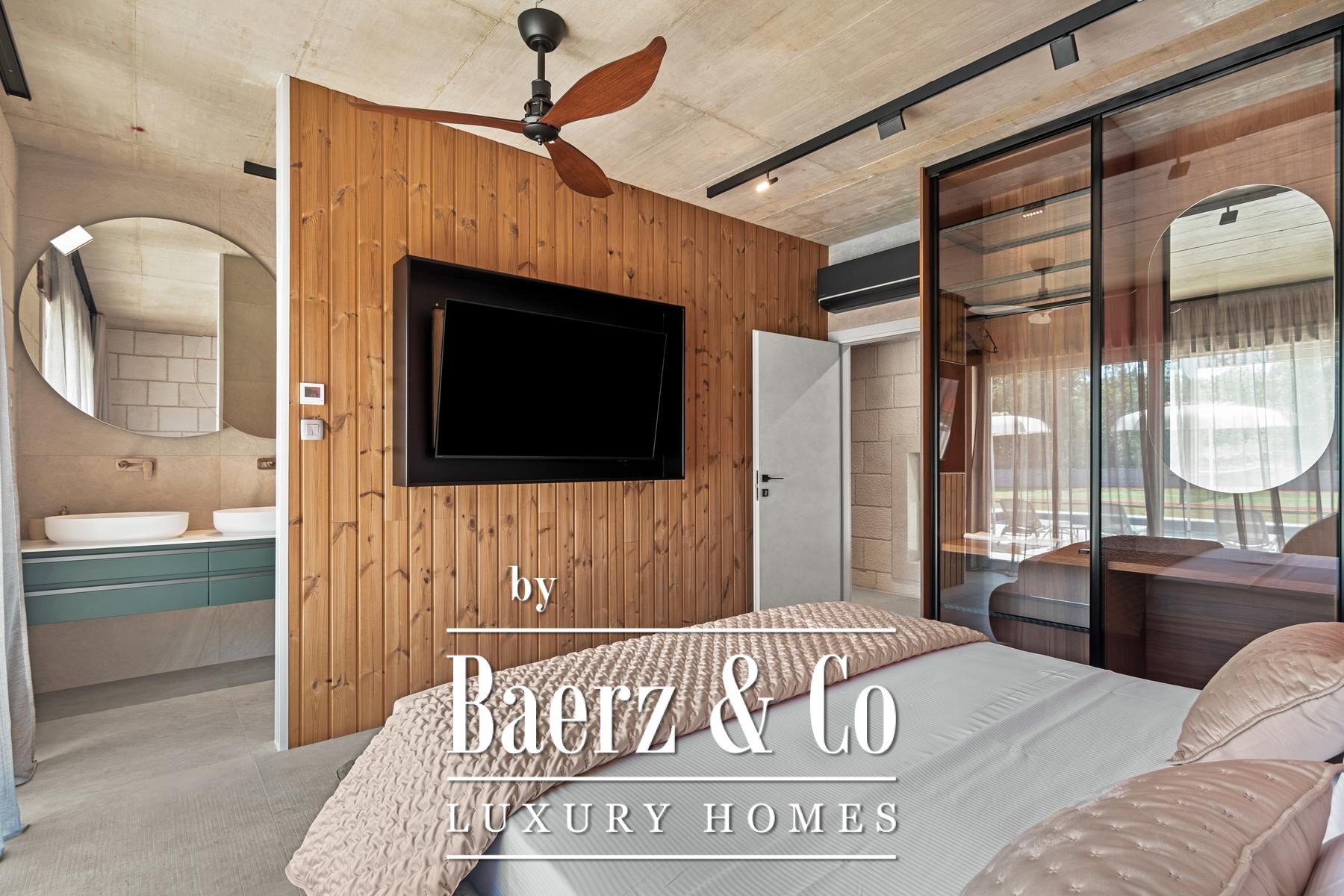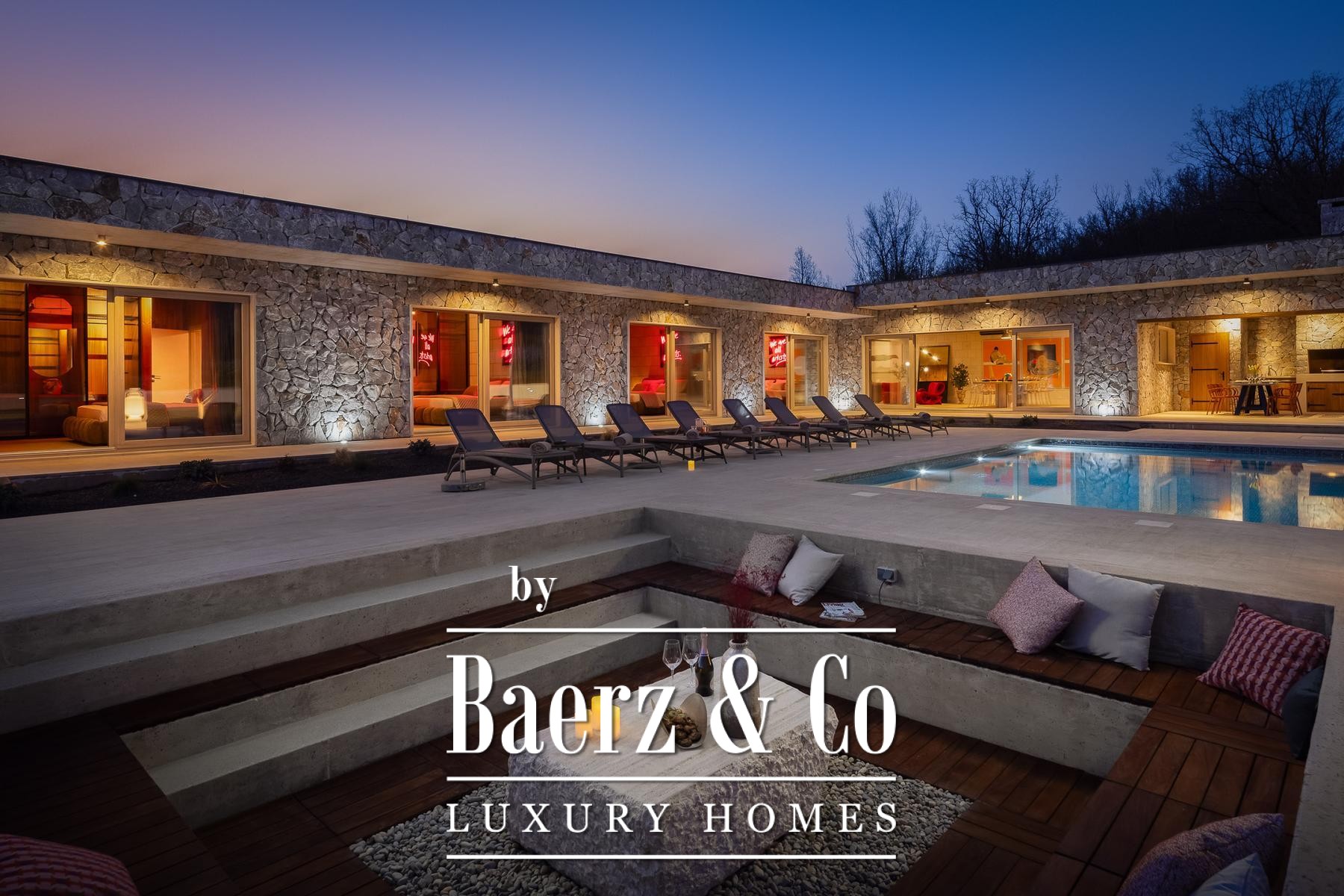 In the vicinity of Split, there is this completely different newly built villa with a swimming pool and tennis court. It is located on a plot of 2130 m2, on the very edge of the green zone, surrounded by peace and beautiful nature.It is a single-storey house with an excellently designed living space, which extends to 240 m2.The living area (living room, kitchen, dining room) of 70 m2 is maximally opened with excellent sliding walls (Gelan), and has a view of the summer kitchen, tennis court and swimming pool.The furniture throughout the building is custom-made with designer pieces (armchairs, paintings, ...).The walls are decorated with natural materials (stone, wooden panels), while the dining table is entirely