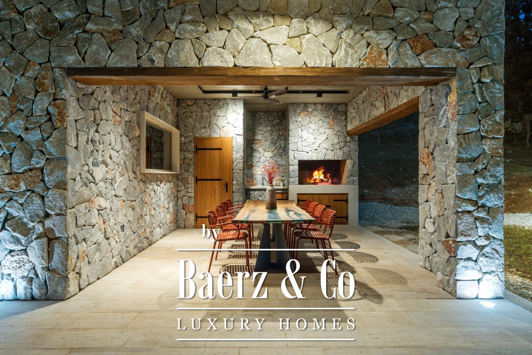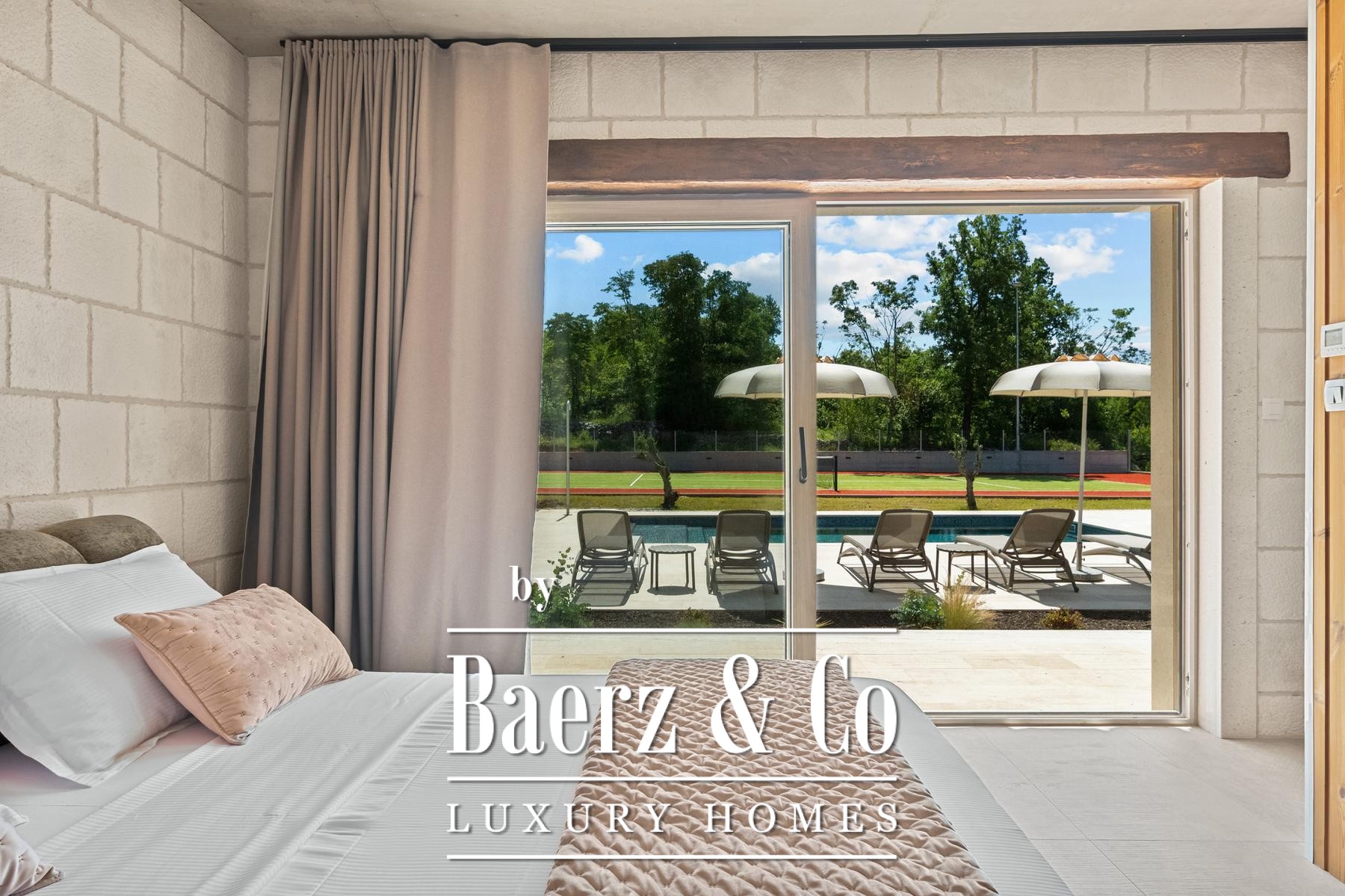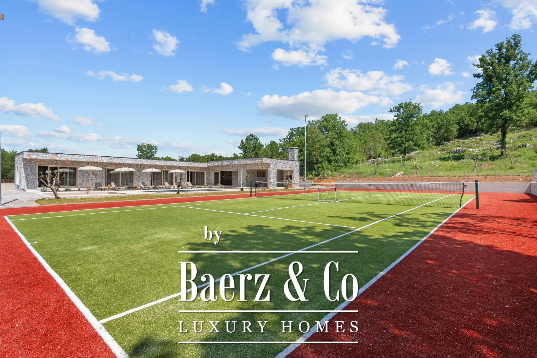 made of natural stone (travertine 300 x 120).The hallway leads us to four comfortable bedrooms with their own bathrooms.The garden is cultivated (20 old olive trees), and hides a summer kitchen with a fireplace, a stone-lined sundeck, a heated swimming pool (45 m2) and a tennis court (17 x 34).The owner paid great attention to the details during the decoration that ultimately make this property exceptional, so the entire property is covered in stone, 4 m high aluminum entrance doors, water-based underfloor heating throughout the building, each room has an air conditioning unit and fan, ambient lighting (100 LED lamps), special ceramics in the pool, etc.For any additional information, we are at your disposal.