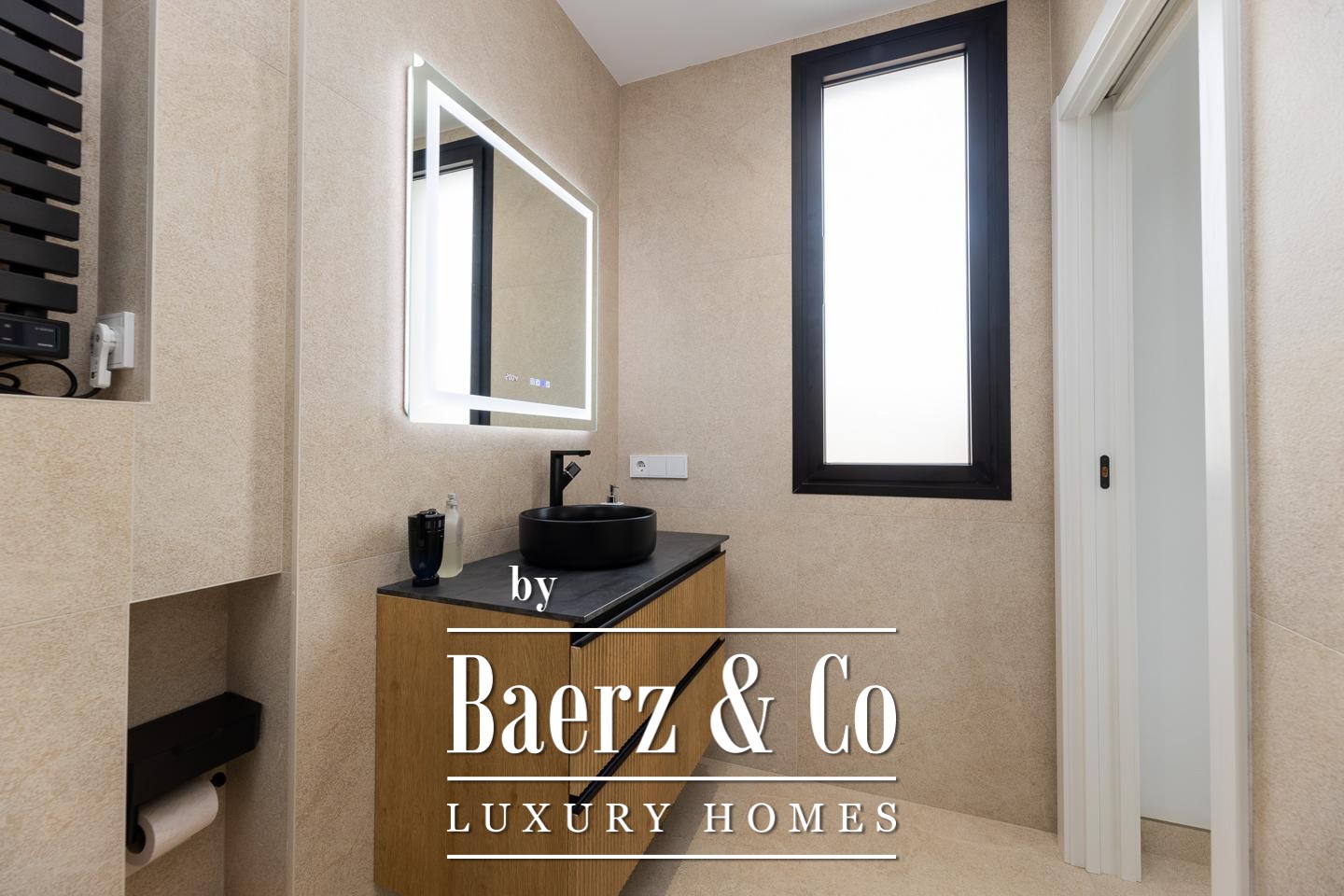 Upper floor: Three double bedrooms with luxurious en-suite bathrooms. The main suite features a fireplace, walk-in closet, private terrace, and an impressive spa-style bathroom. There is also a fully equipped laundry room.