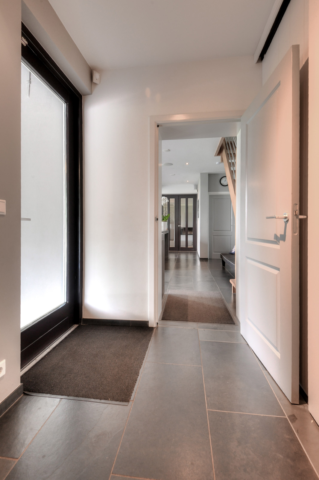 De entree bevindt zich aan de achterzijde, ter plaatse van de carport. Via deze (voor)deur toegang tot: