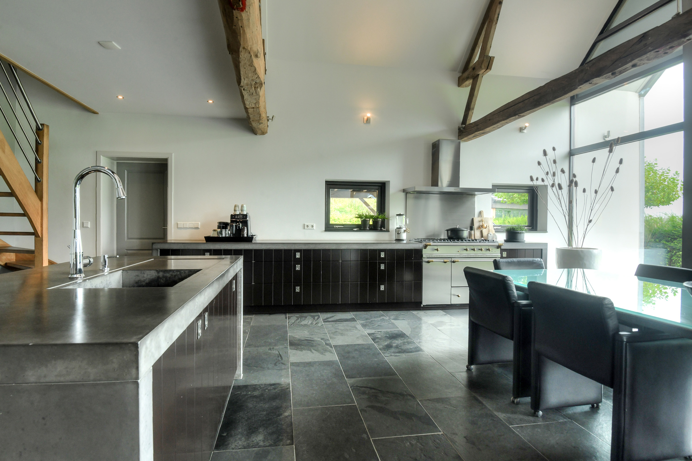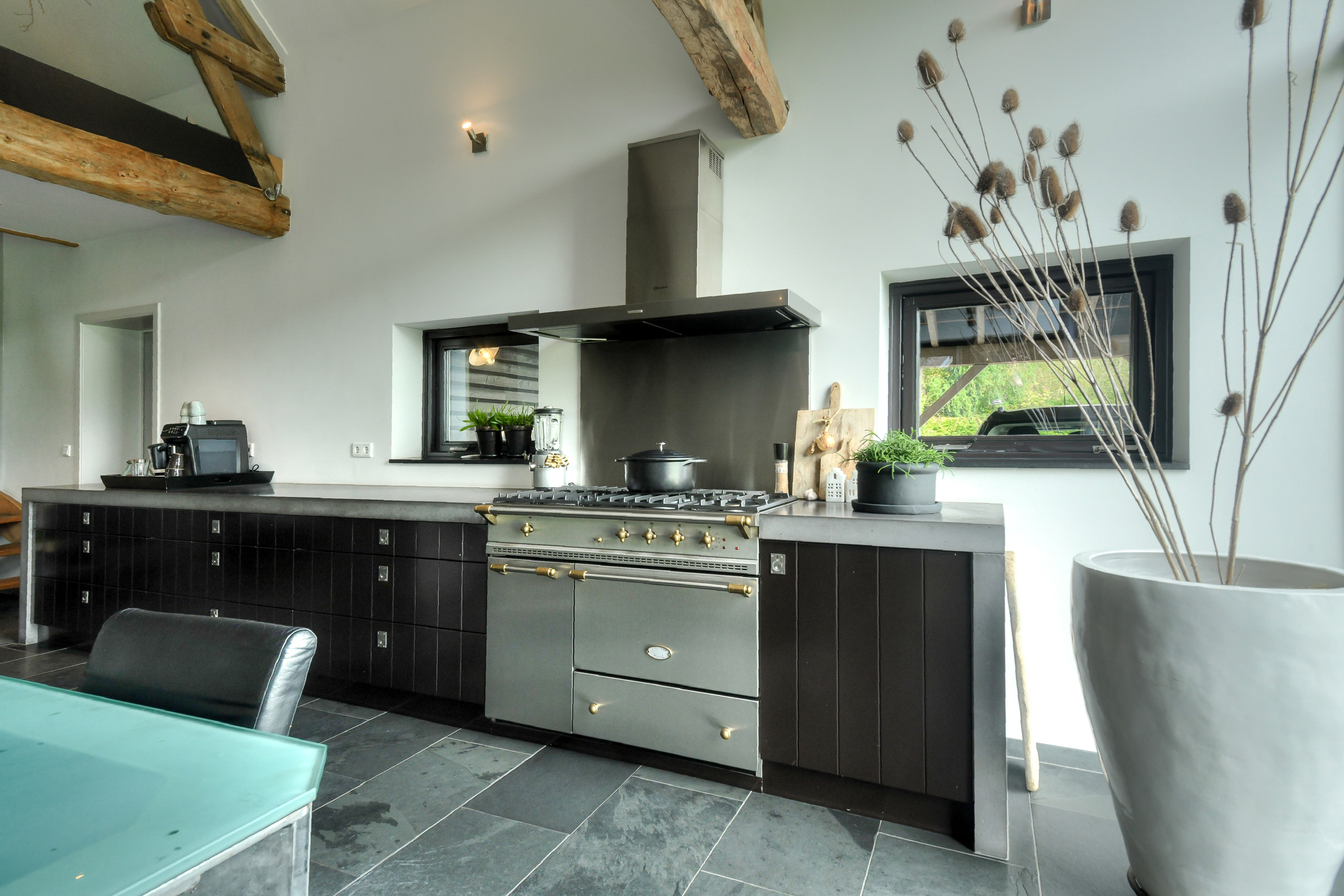 De prachtige woon-/eetkeuken (ca. 51 m²) vormt het middelpunt van de woning. Deze lichte en zeer ruimtelijke keuken is voorzien van een moderne en luxe keukeninrichting, bestaand uit een betonnen blad, een breed gasfornuis (Lacanche) met diverse ovens, een afzuigkap en zeer veel bergruimte. Daarnaast treft u een spoeleiland (eveneens met een betonnen blad) met spoelbak, design-mengkraan, vaatwasser en veel kastruimte.