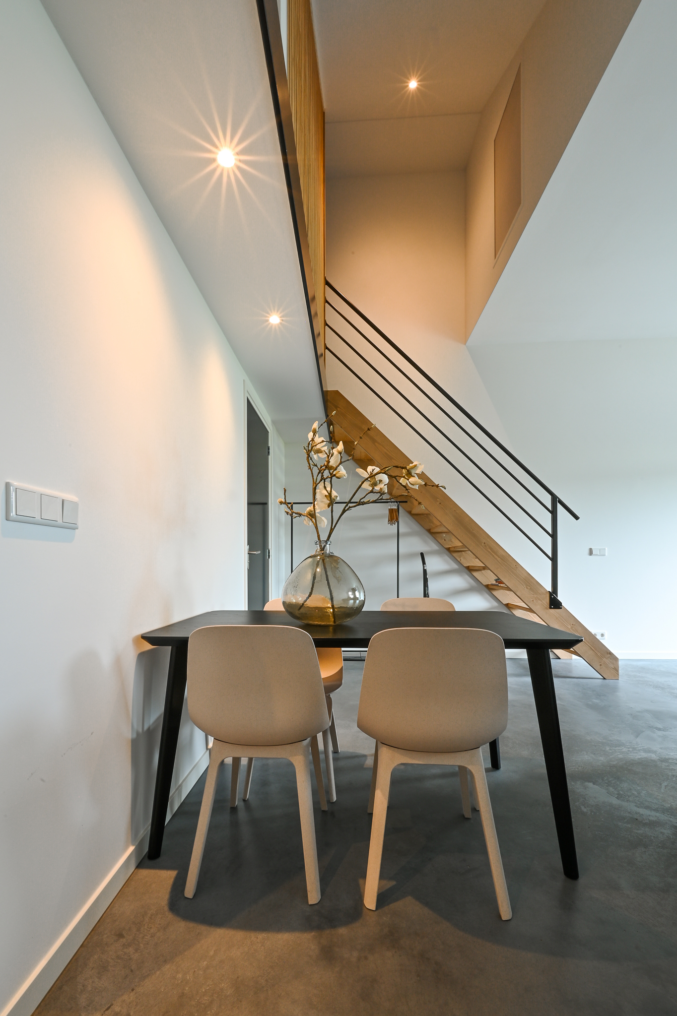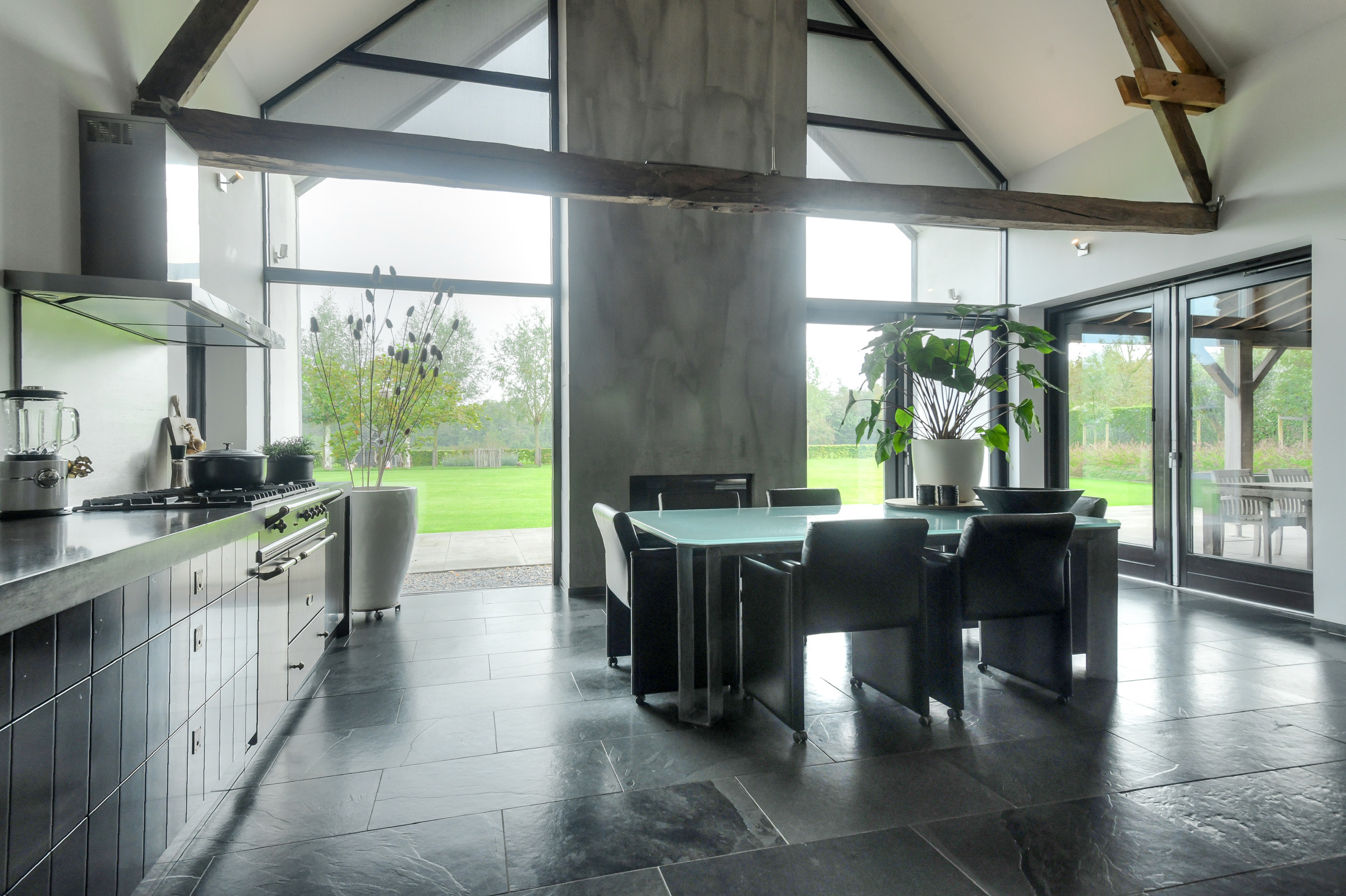 Een extra ruimtelijk effect wordt verkregen door de hoge kapconstructie die in het zicht gebleven is.