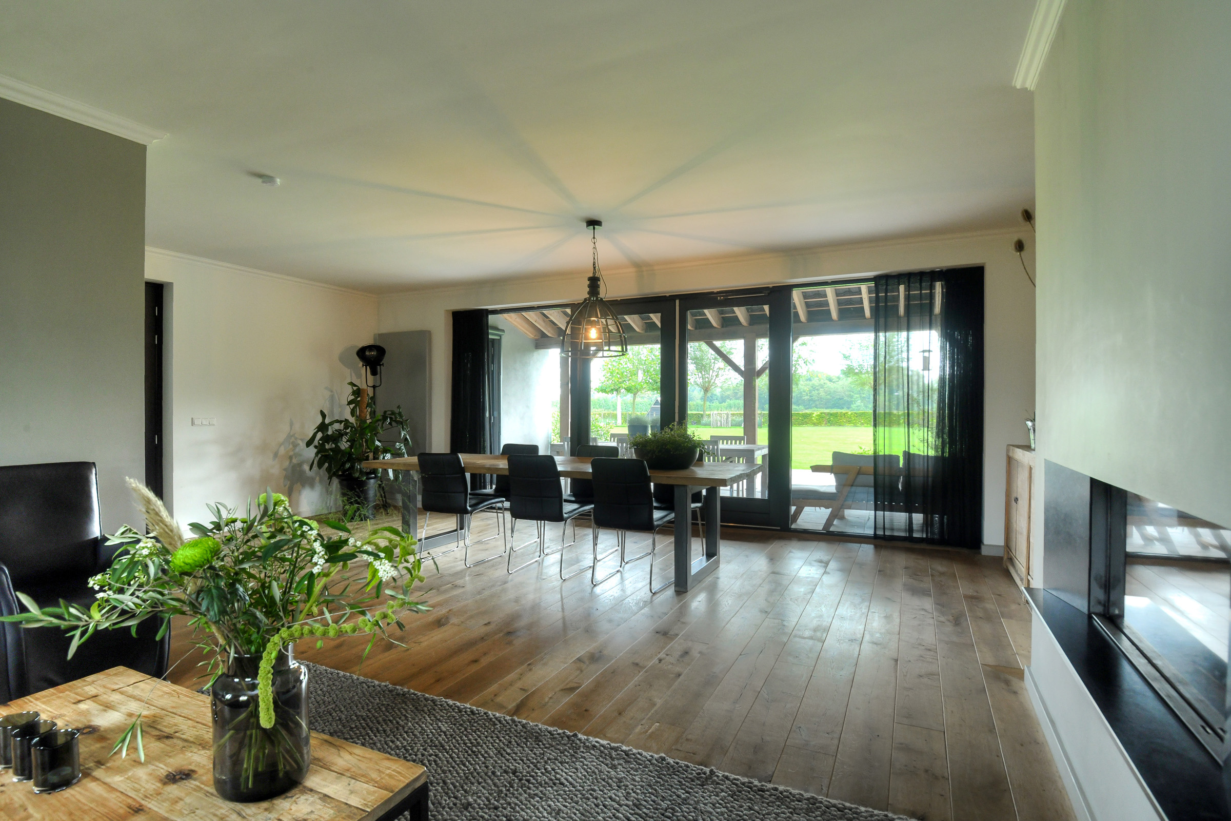 Aan de tuinzijde bevinden zich twee dubbele tuindeuren én een grote glaspartij waardoor u prachtig zicht heeft op de tuin en het achtergelegen weiland/natuurgebied. In de tussenliggende wand is een moderne gashaard geplaatst.