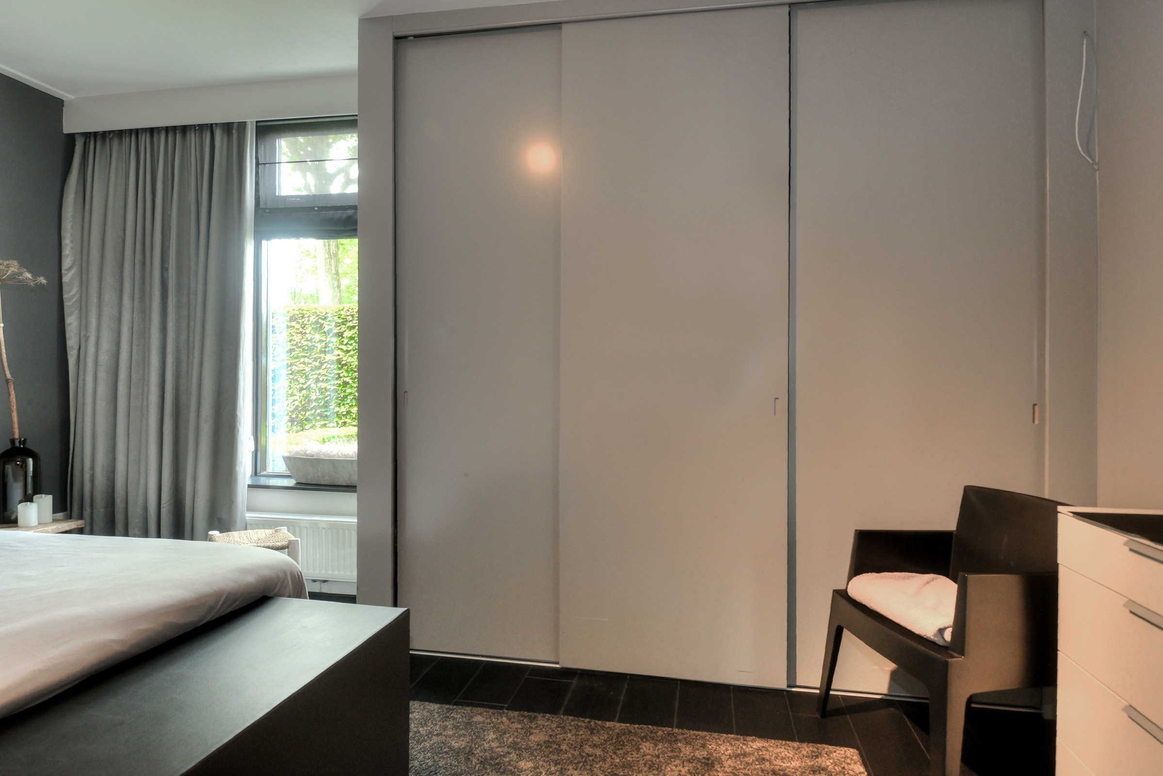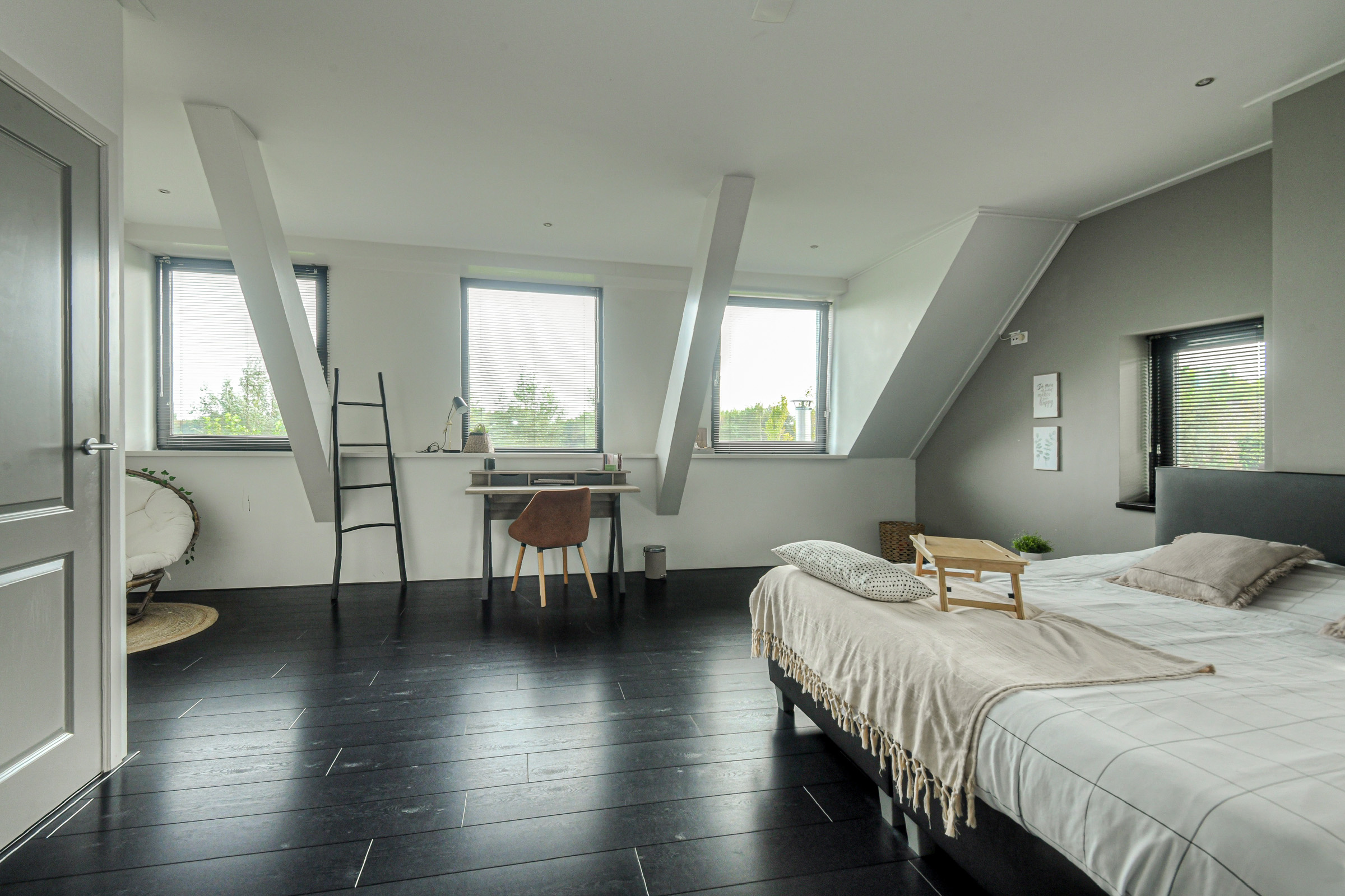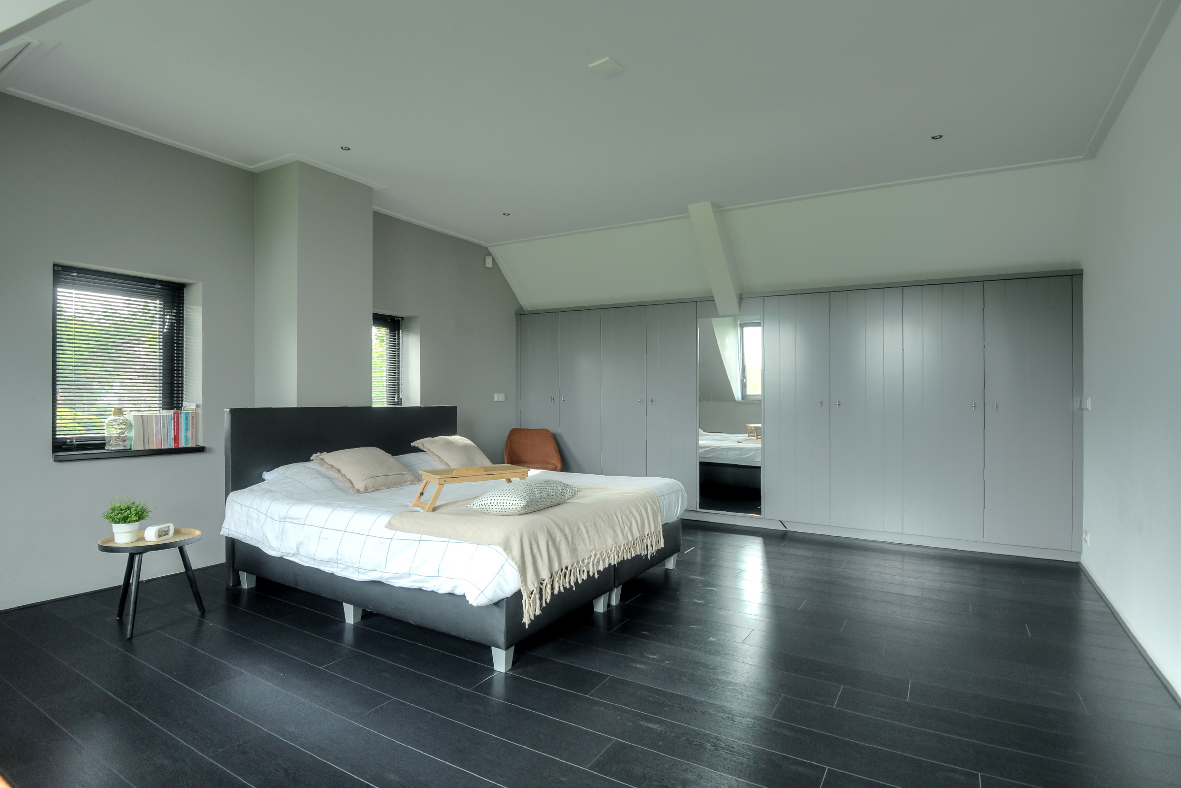 Ouderslaapkamer (ca. 4.55 x 3.00 m) met grote garderobekast, in deze ruimte bevindt zich ook de meterkast (8 groepen + krachtstroom + aardlekschakelaar). De vloer is voorzien van sfeervol donker laminaat.