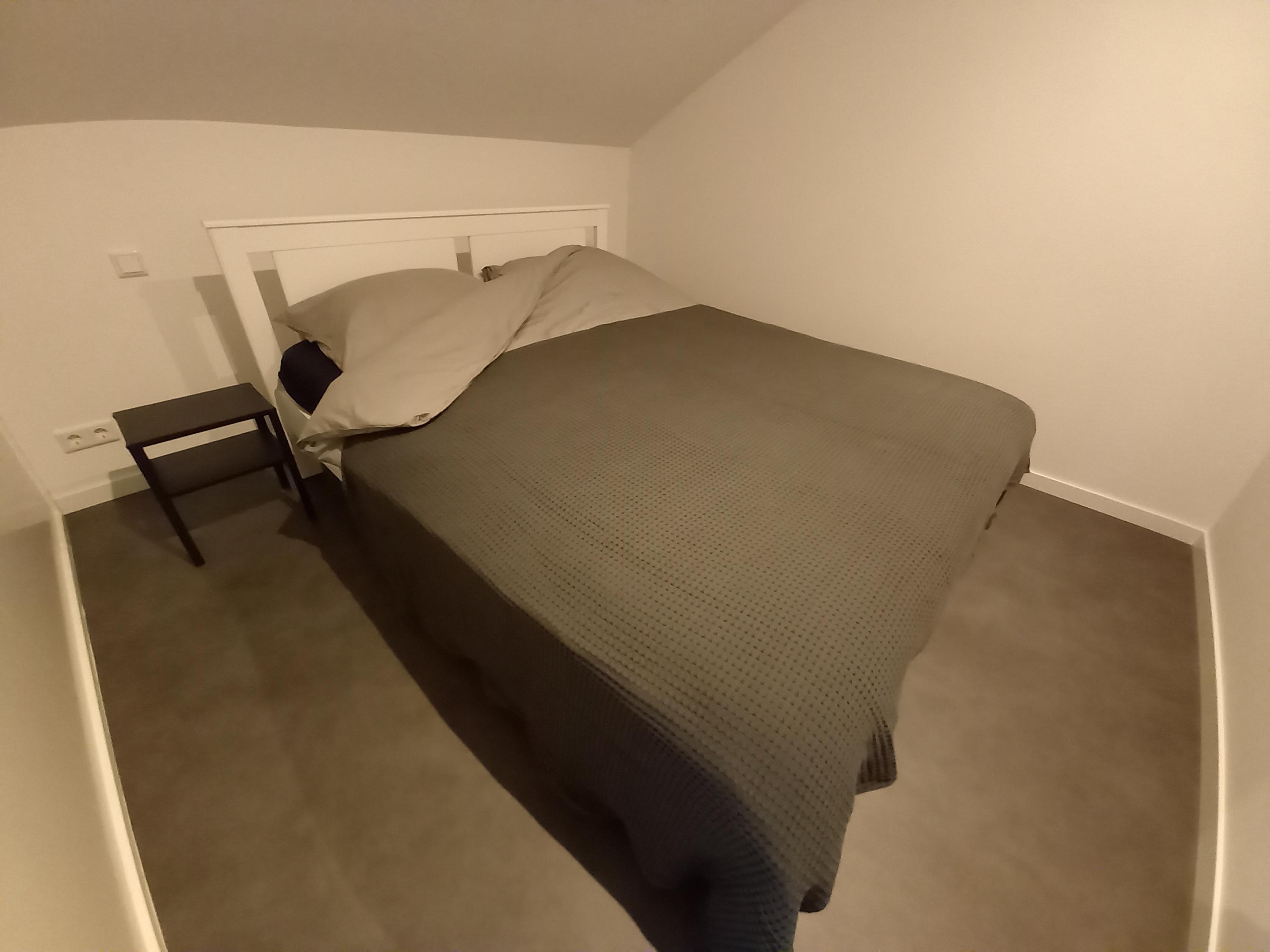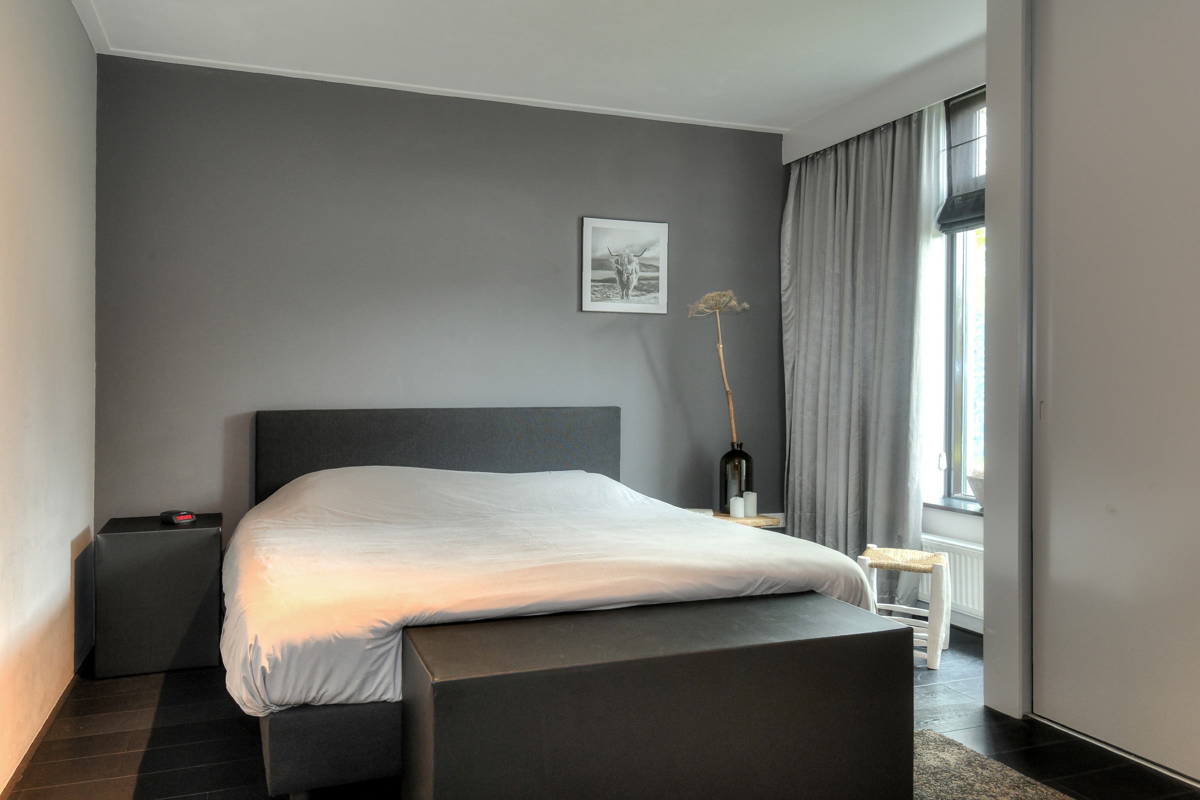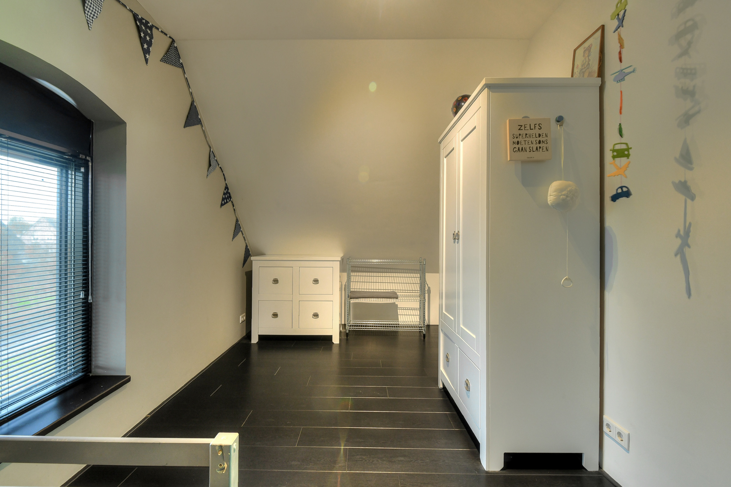 Ouderslaapkamer (ca. 4.55 x 3.00 m) met grote garderobekast, in deze ruimte bevindt zich ook de meterkast (8 groepen + krachtstroom + aardlekschakelaar). De vloer is voorzien van sfeervol donker laminaat.