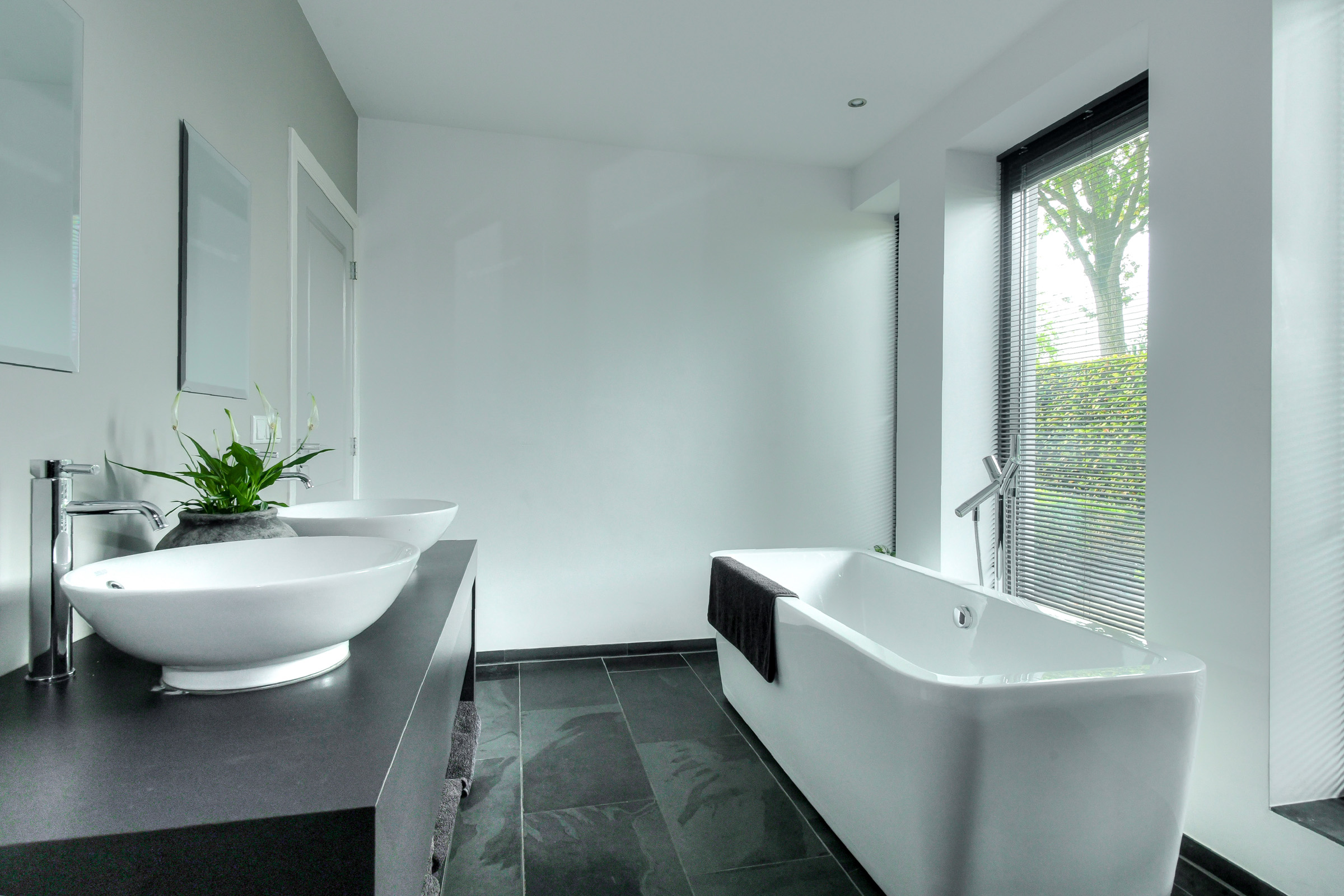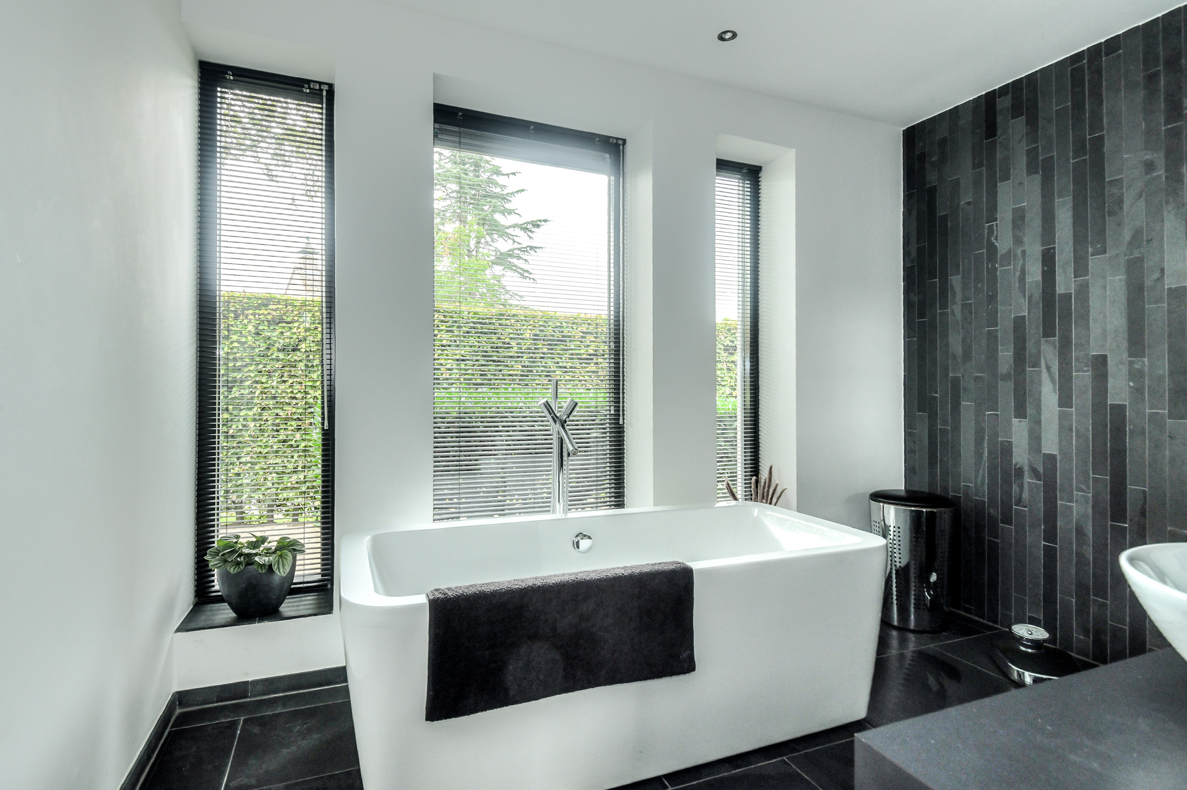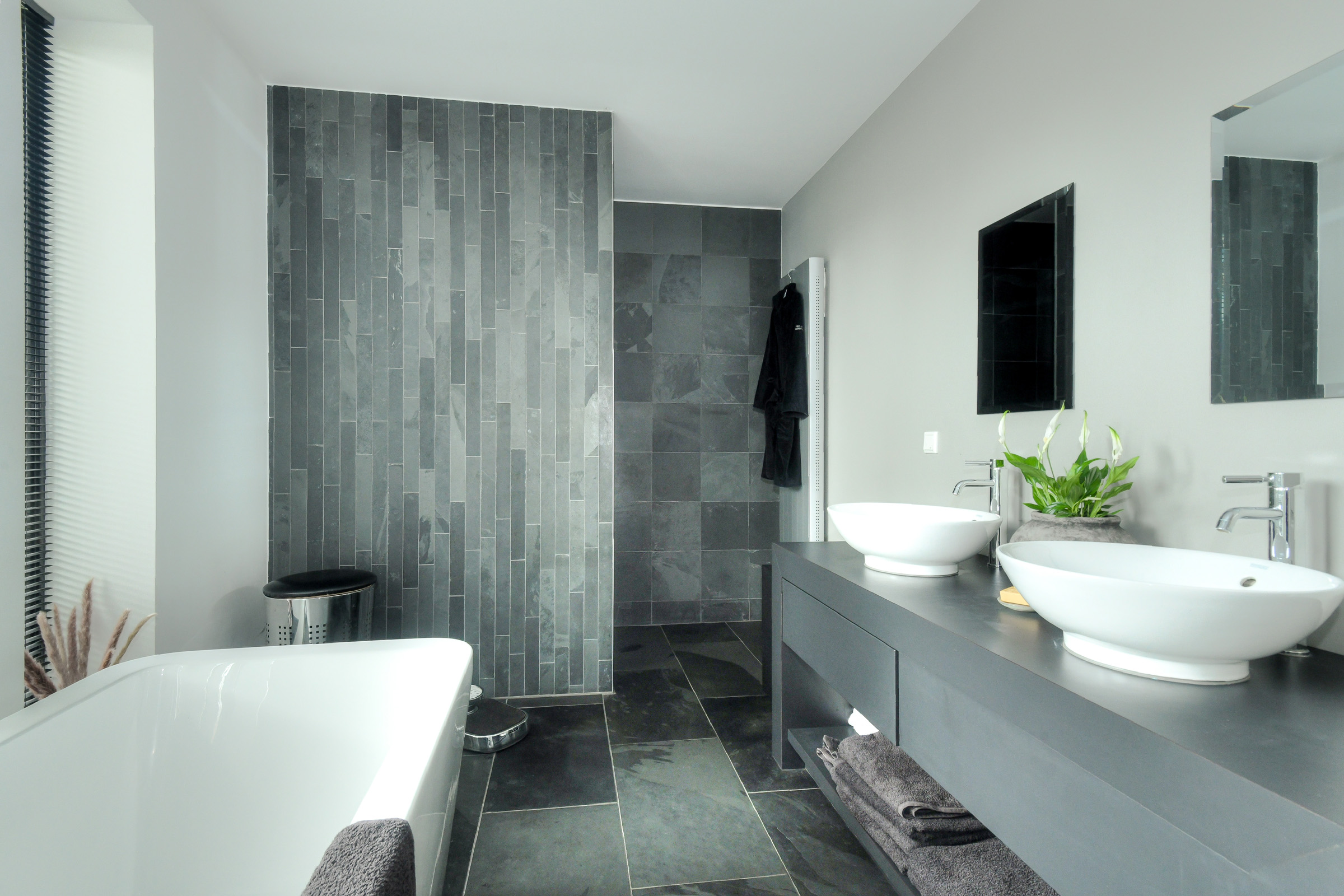 Badkamer (ca. 4.40 x 2.45 m) aan de voorzijde van de woning gesitueerd. Deze badkamer is uitgevoerd met een breed meubel met twee opzetwastafels, een design-ligbad en een inloopdouche met thermostaatkraan met hand- en regendouche.