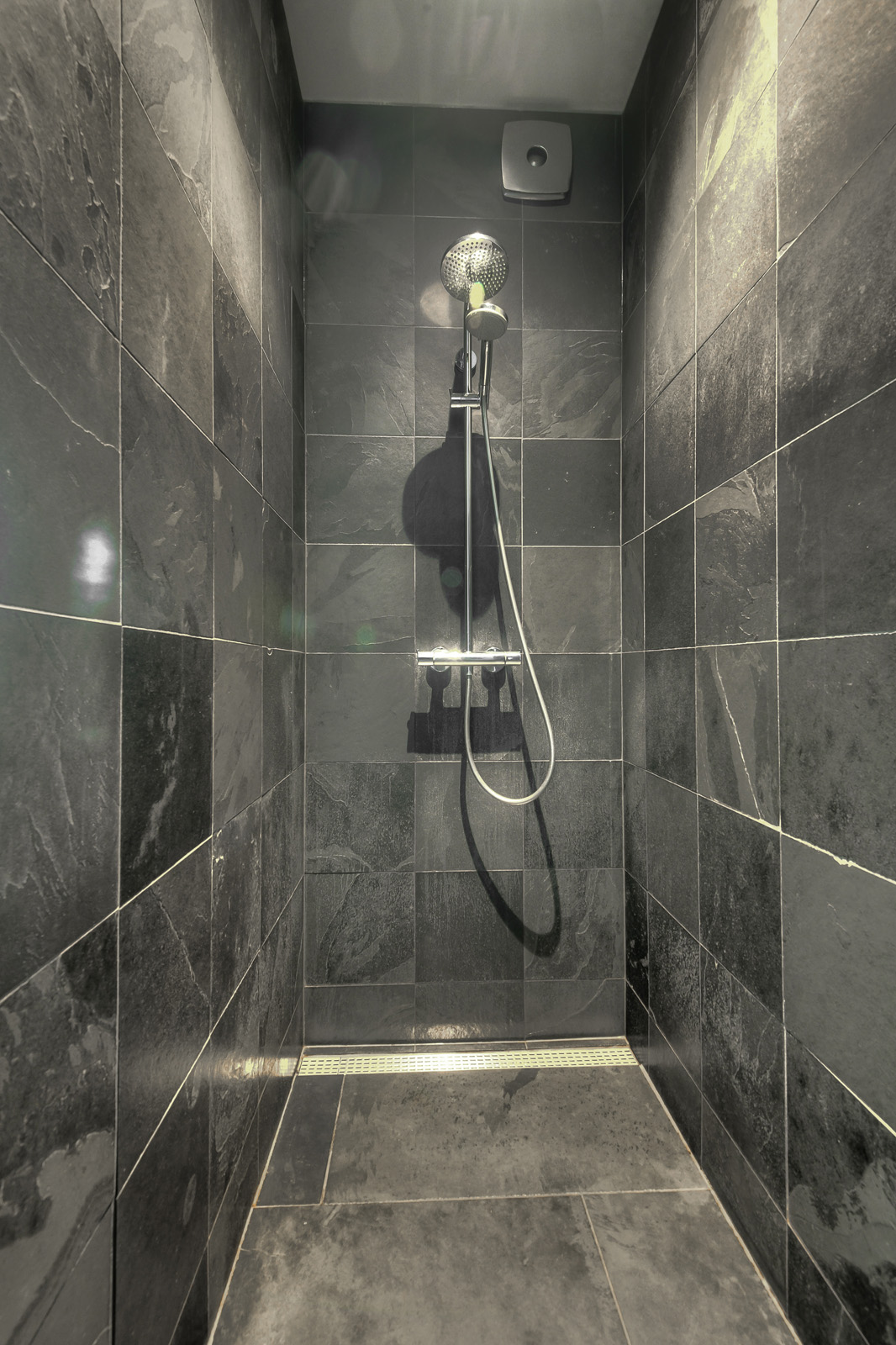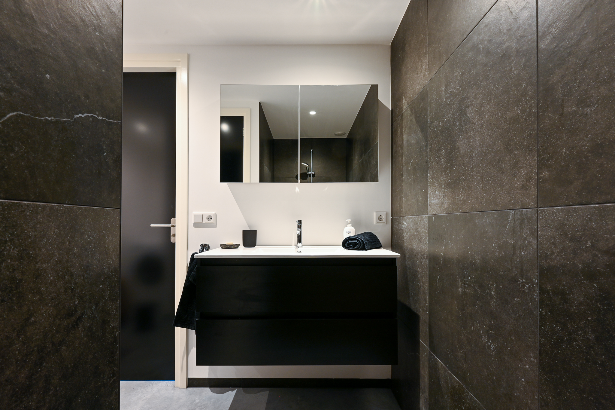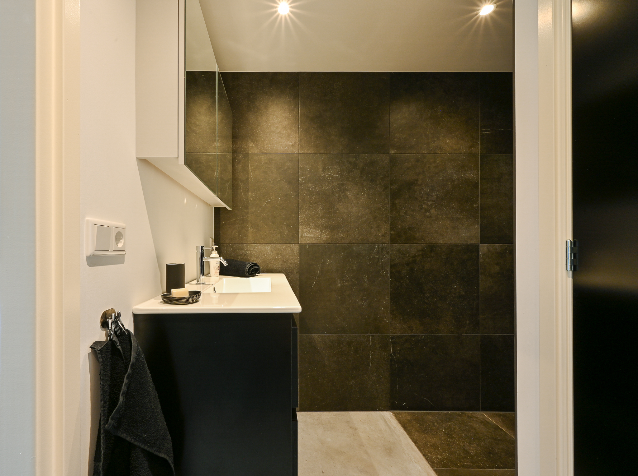 Badkamer (ca. 2.40 x 3.15 m) met inloopdouche met thermostaatkraan, wastafelmeubel en toiletruimte. Voorts bevinden zich hier de aansluitpunten ten behoeve van de wasapparatuur.