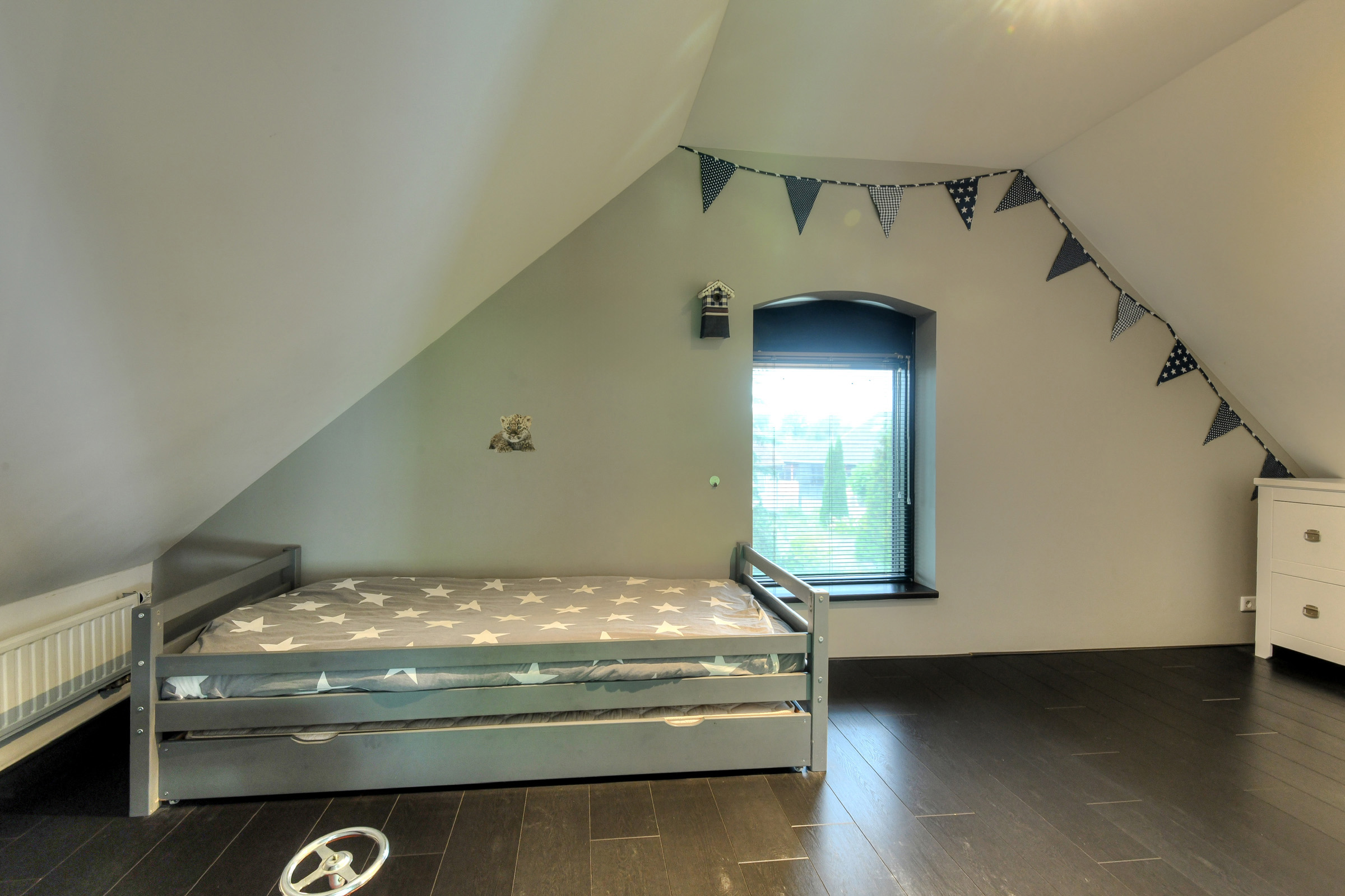 Voorslaapkamer (ca. 6.25 x 2.60/3.50 m), ook in deze kamer is de kapconstructie deels in het zicht gebleven.