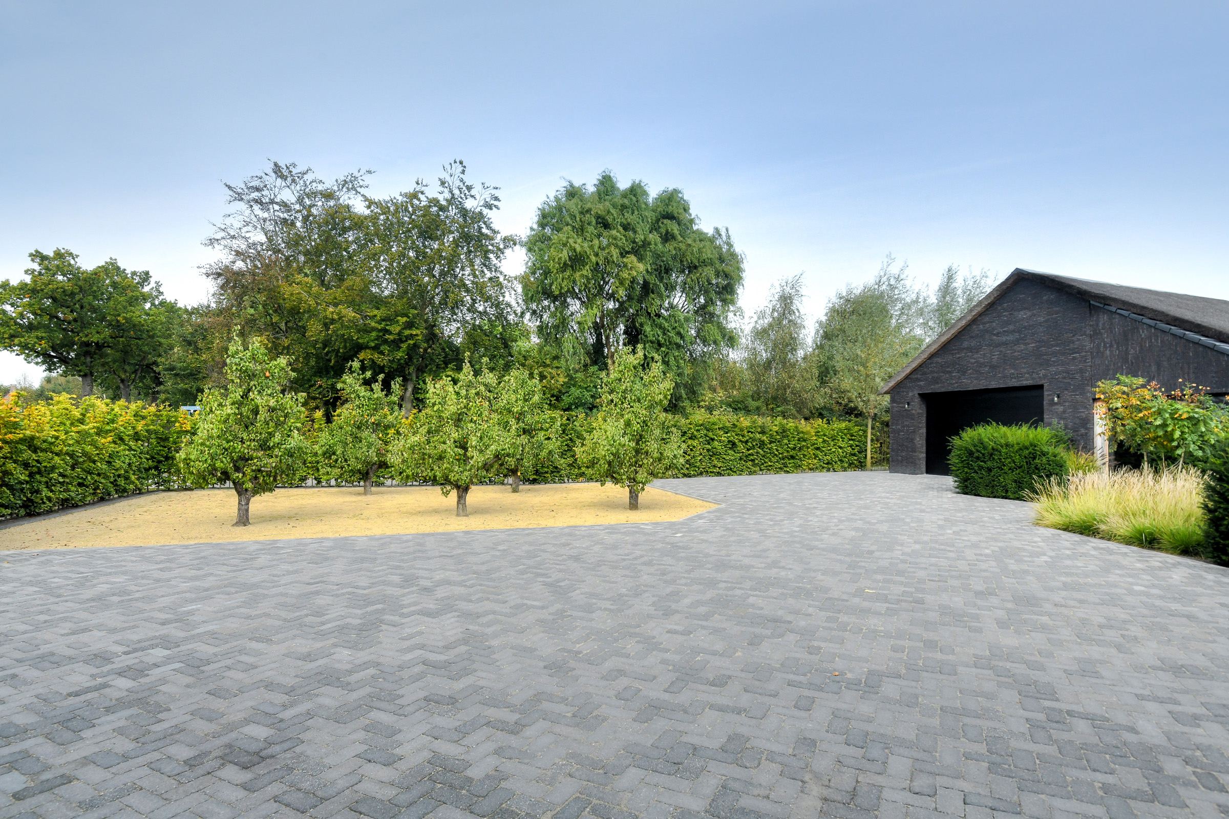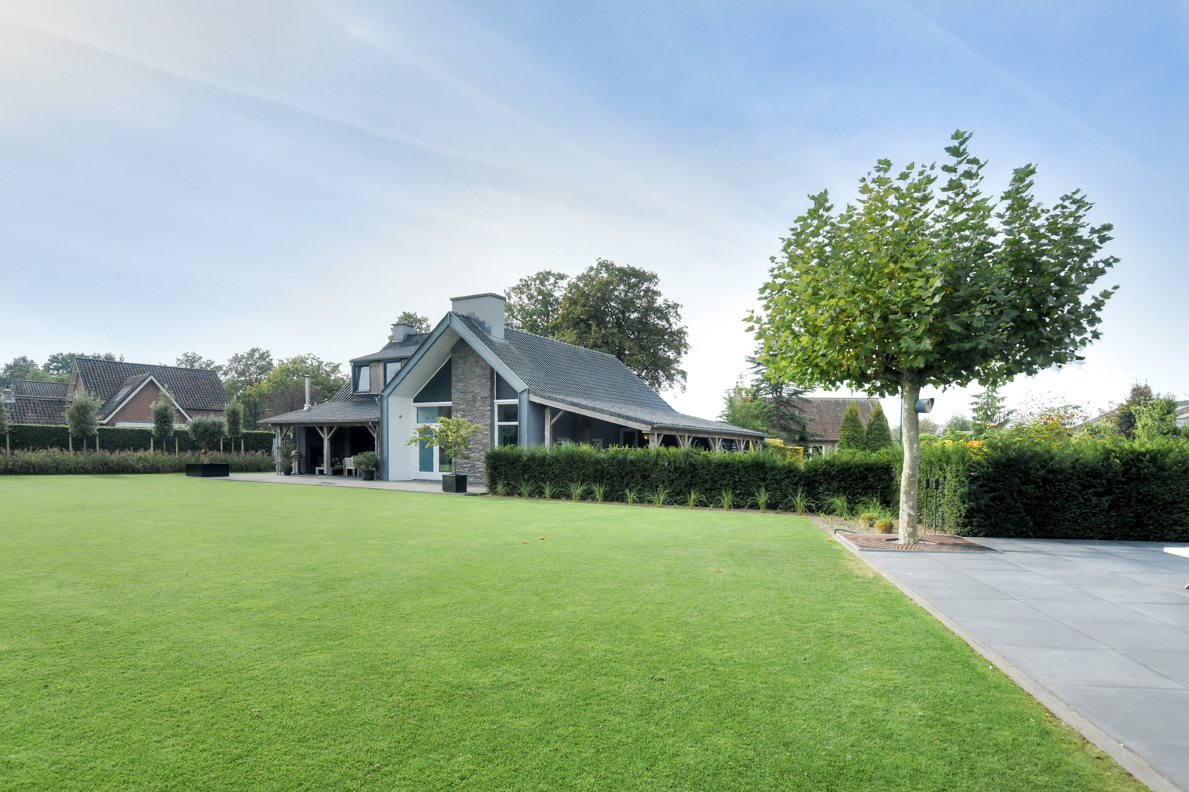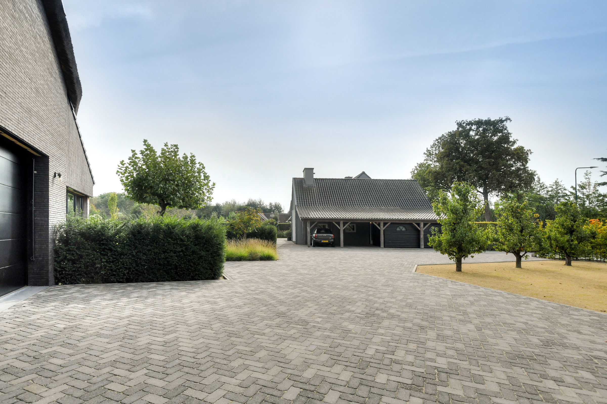 De veranda en het terras zijn uitgevoerd met grote betontegels. De oprit is aan de zijkant gelegen en biedt toegang tot het erf met parkeergelegenheid voor meerdere auto’s én toegang tot de garage. Tegen de woning is een carport ten behoeve van twee auto’s geplaatst.