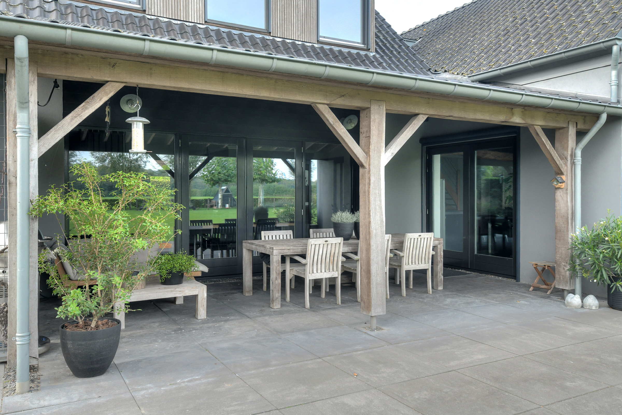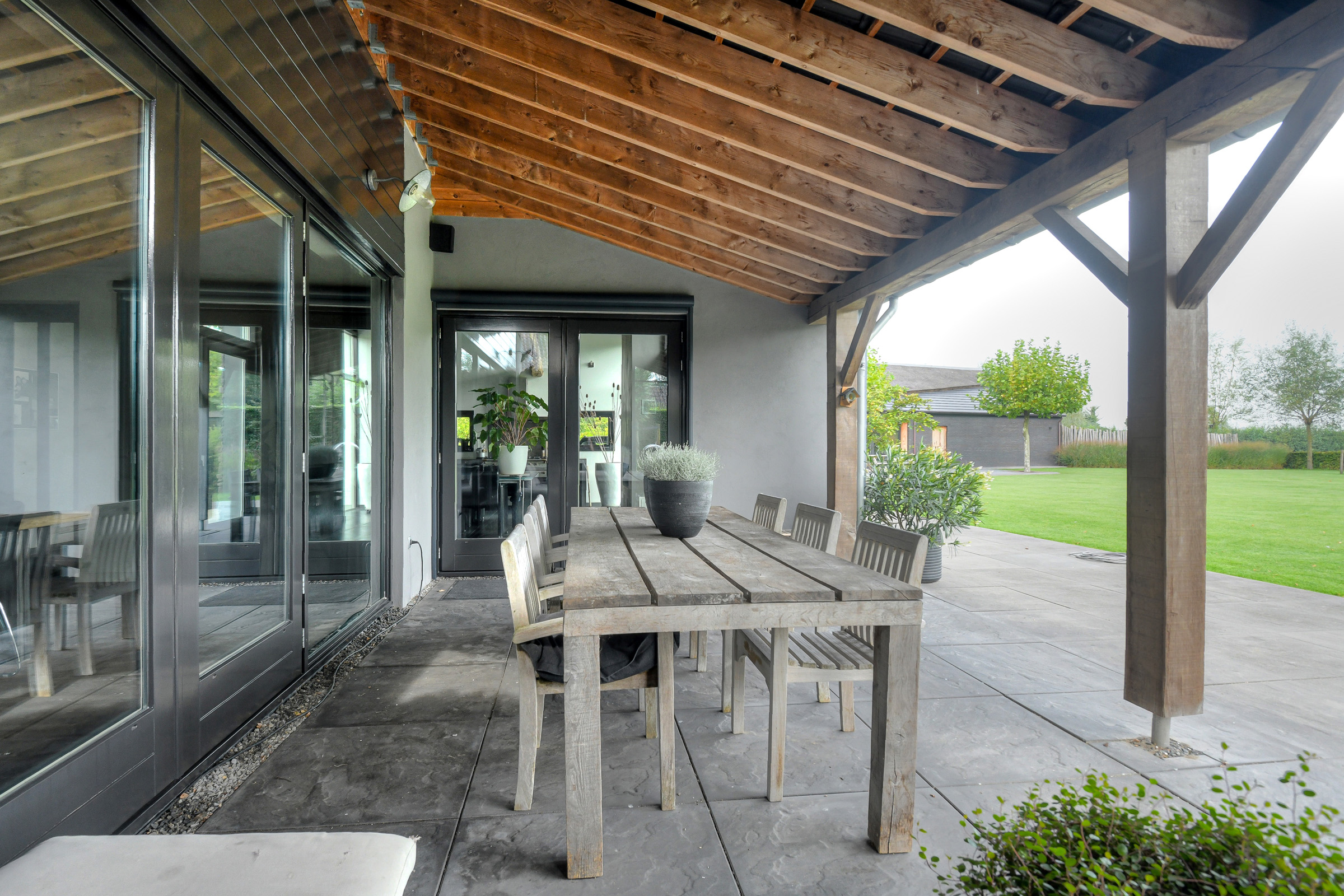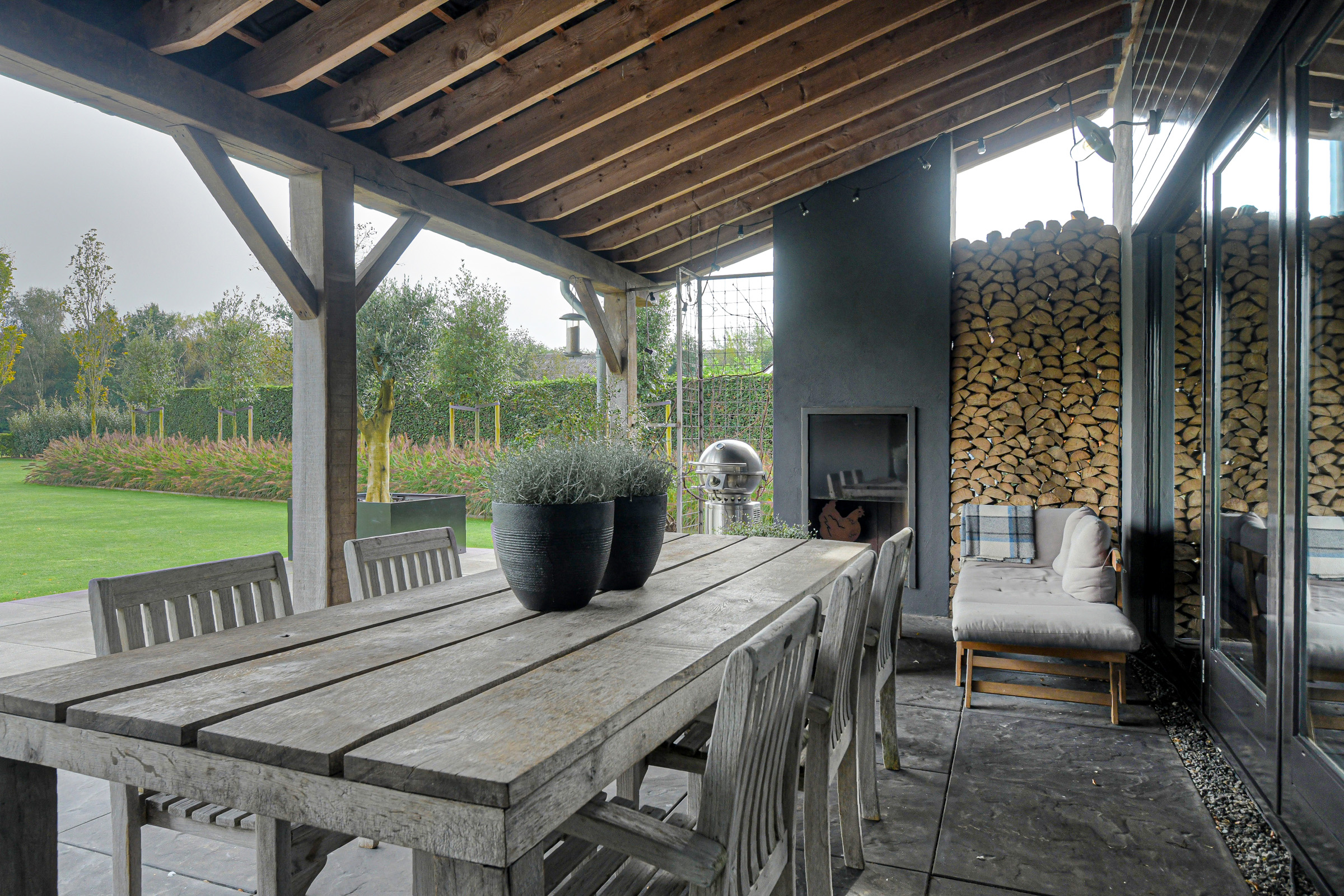 Openslaande deuren bieden toegang tot de veranda. Ook vanuit deze veranda, waar een buitenhaard geplaatst is, heeft u prachtig zicht op de tuin en het achterliggend gebied.