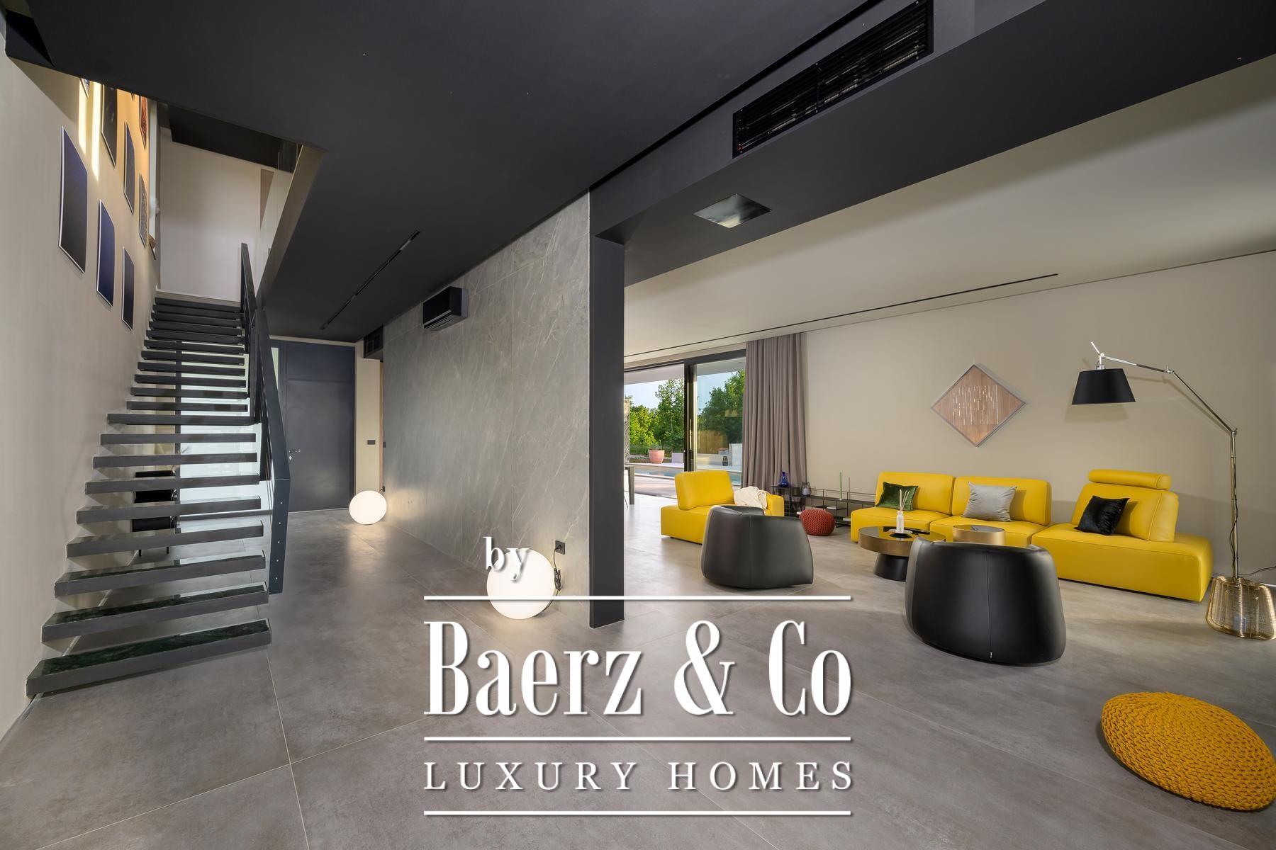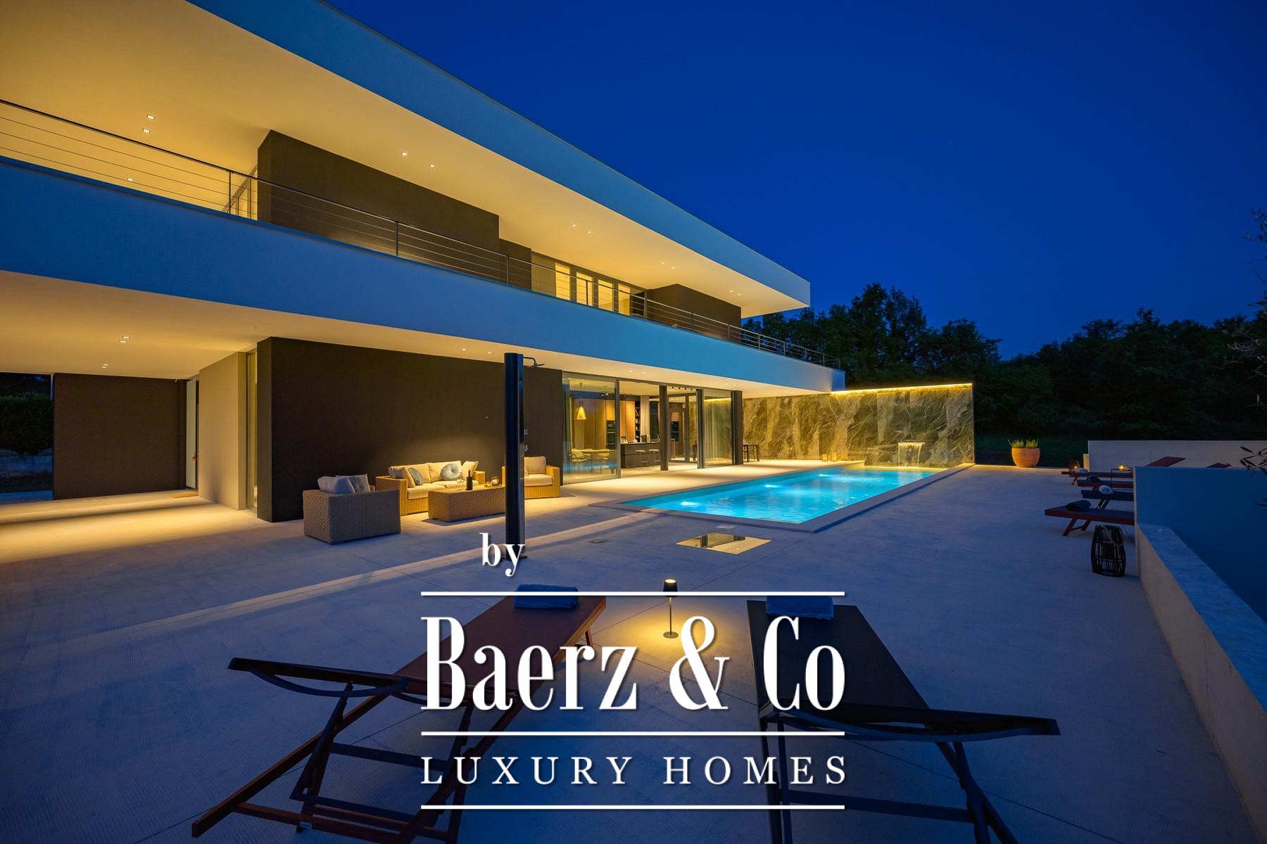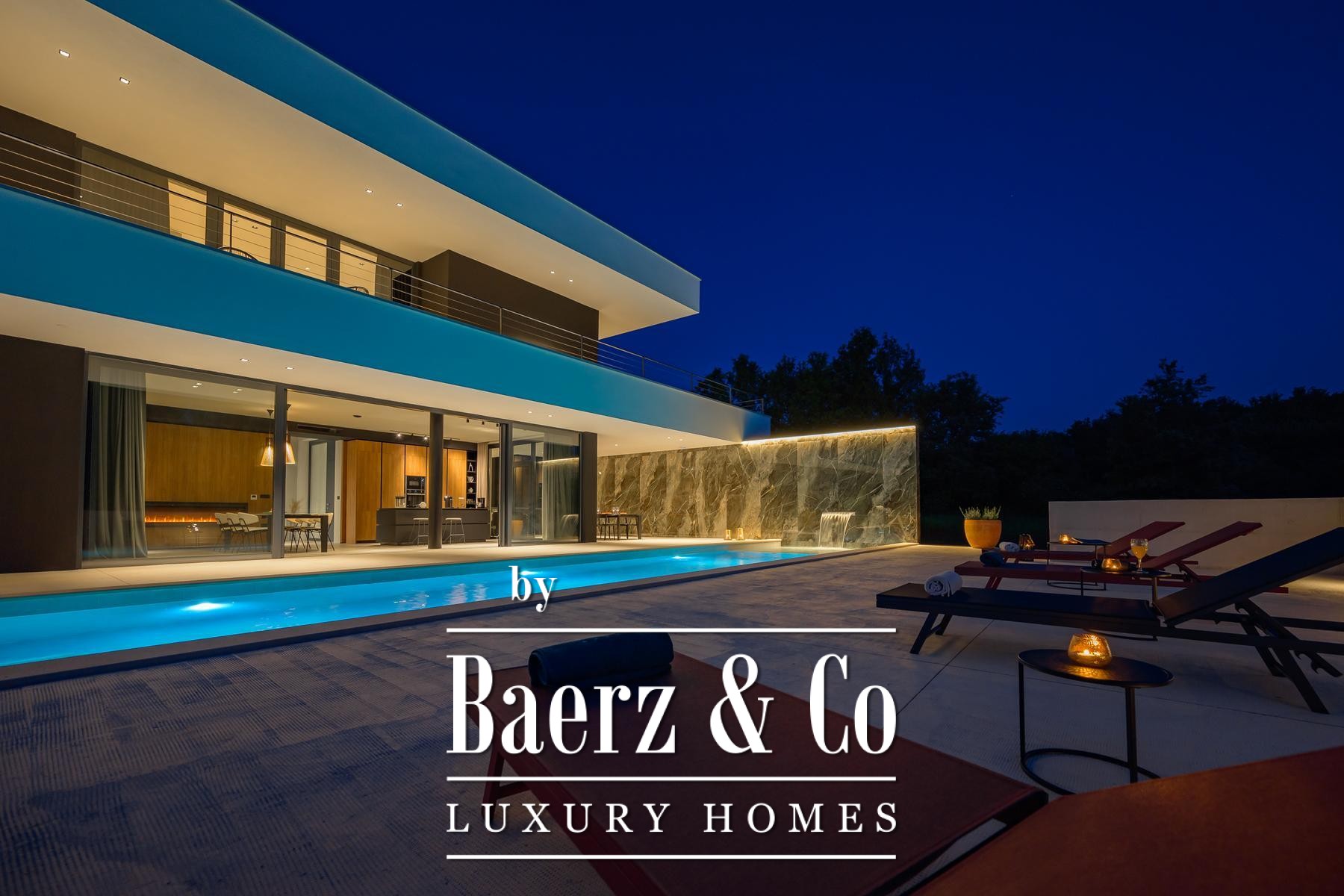 Istria, Grožnjan - Designer newly built villa, a combination of top design, luxury equipment and privacy.The villa is located on a plot of land with a surface area of 2150m2. The villa covers an area of 300m2, which is divided into the ground floor and one floor. On the ground floor of the house there is a living room equipped with luxurious Italian furniture made of genuine leather, a high-quality Italian-made kitchen with Nef built-in appliances, and a dining area. The area of the kitchen and living room is designed according to the principle of open space, from which there is access to a covered terrace of 222m2 and a beach with a total area of 160m2, a 15-meter long pool (61m2) with salt water and a space for socializing. There is also a fully equipped outdoor kitchen by the edge of the pool. On the ground floor of the house there is a toilet, space for a washing machine and ironing.