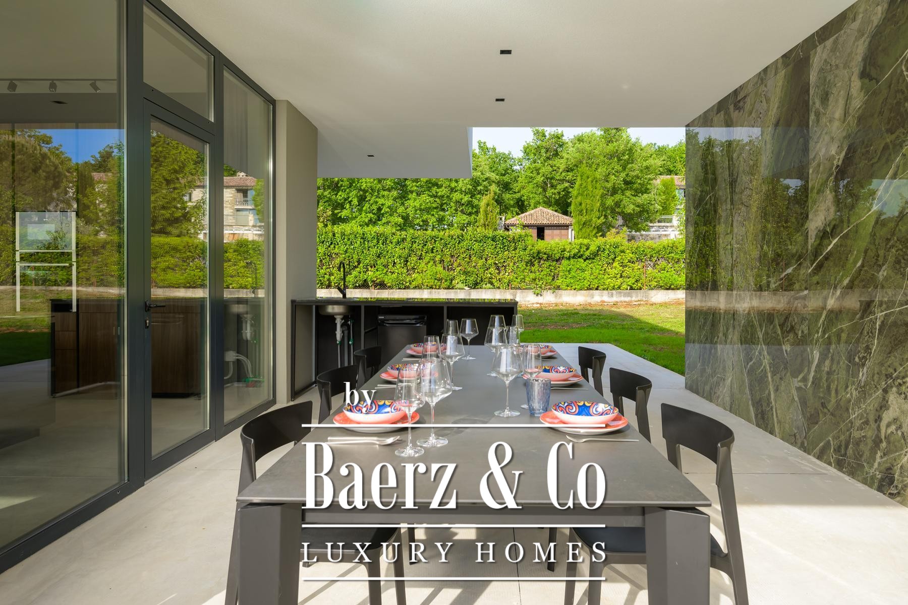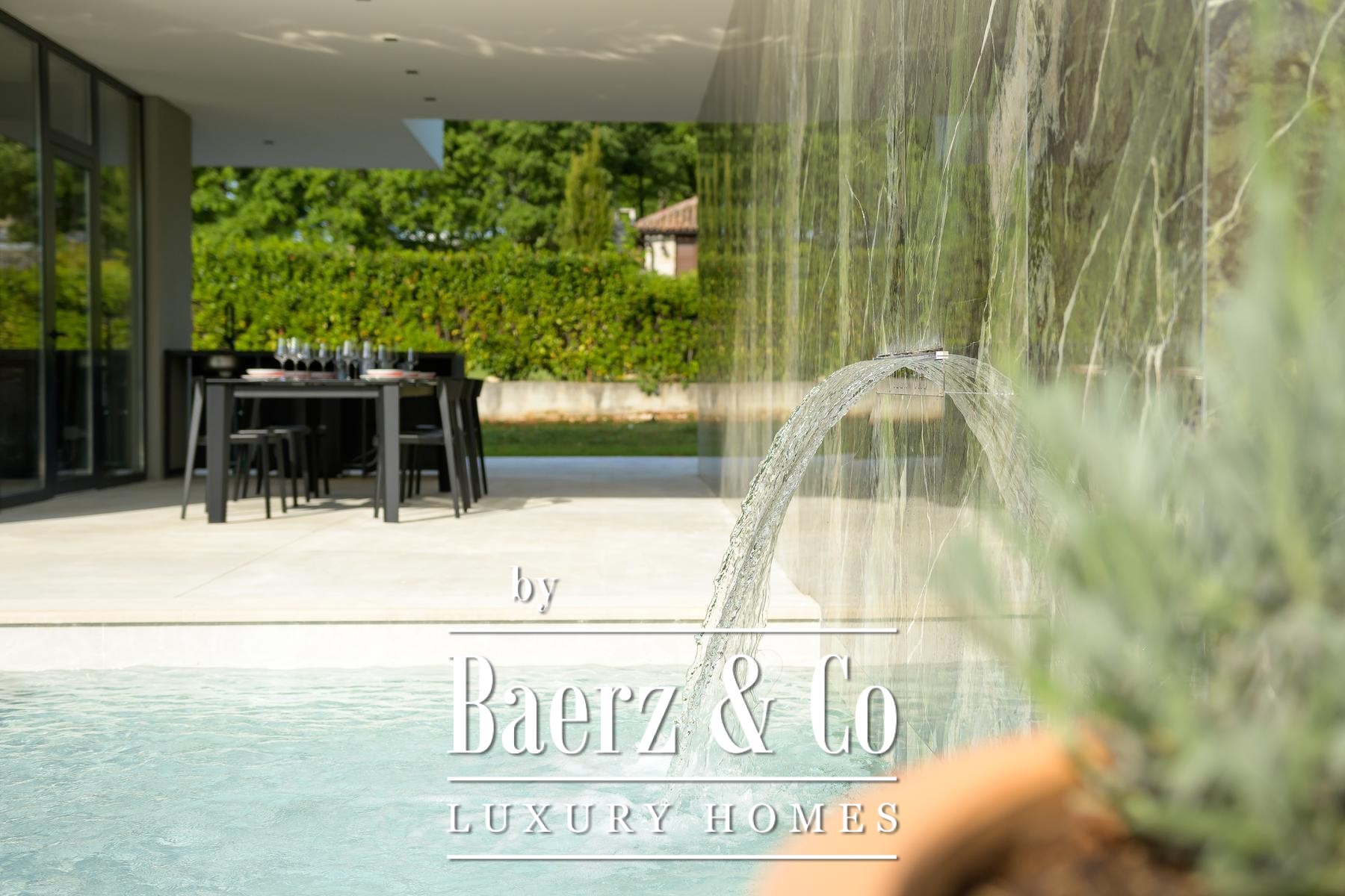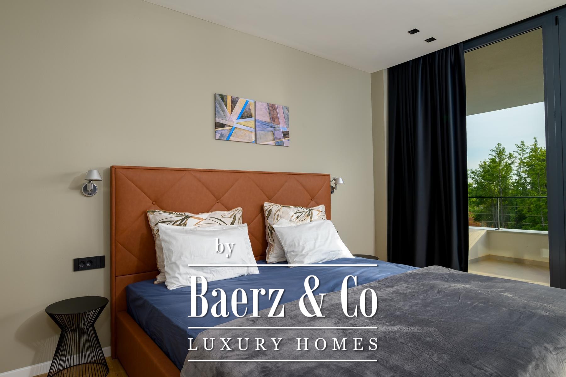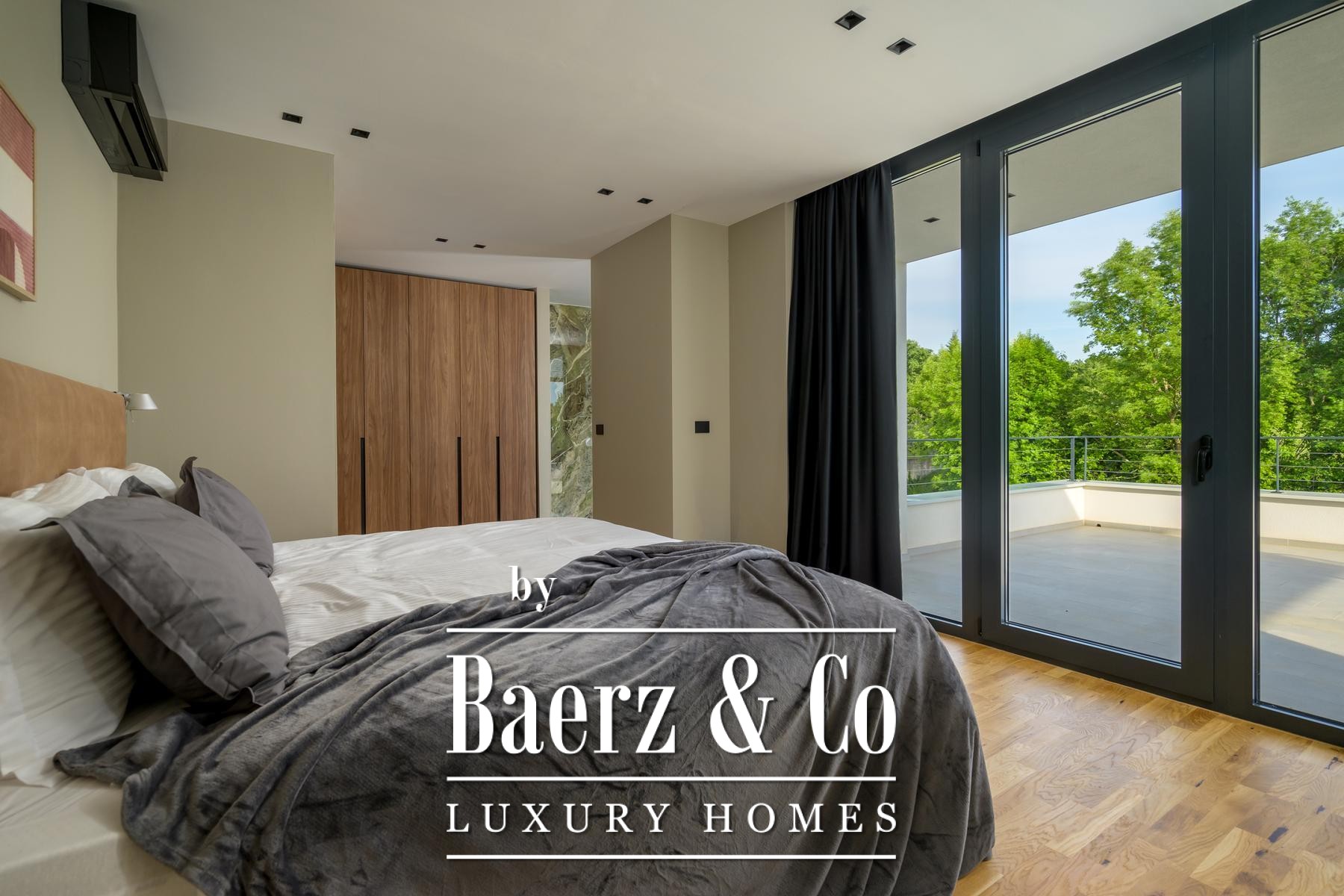 Istria, Grožnjan - Designer newly built villa, a combination of top design, luxury equipment and privacy.The villa is located on a plot of land with a surface area of 2150m2. The villa covers an area of 300m2, which is divided into the ground floor and one floor. On the ground floor of the house there is a living room equipped with luxurious Italian furniture made of genuine leather, a high-quality Italian-made kitchen with Nef built-in appliances, and a dining area. The area of the kitchen and living room is designed according to the principle of open space, from which there is access to a covered terrace of 222m2 and a beach with a total area of 160m2, a 15-meter long pool (61m2) with salt water and a space for socializing. There is also a fully equipped outdoor kitchen by the edge of the pool. On the ground floor of the house there is a toilet, space for a washing machine and ironing.
