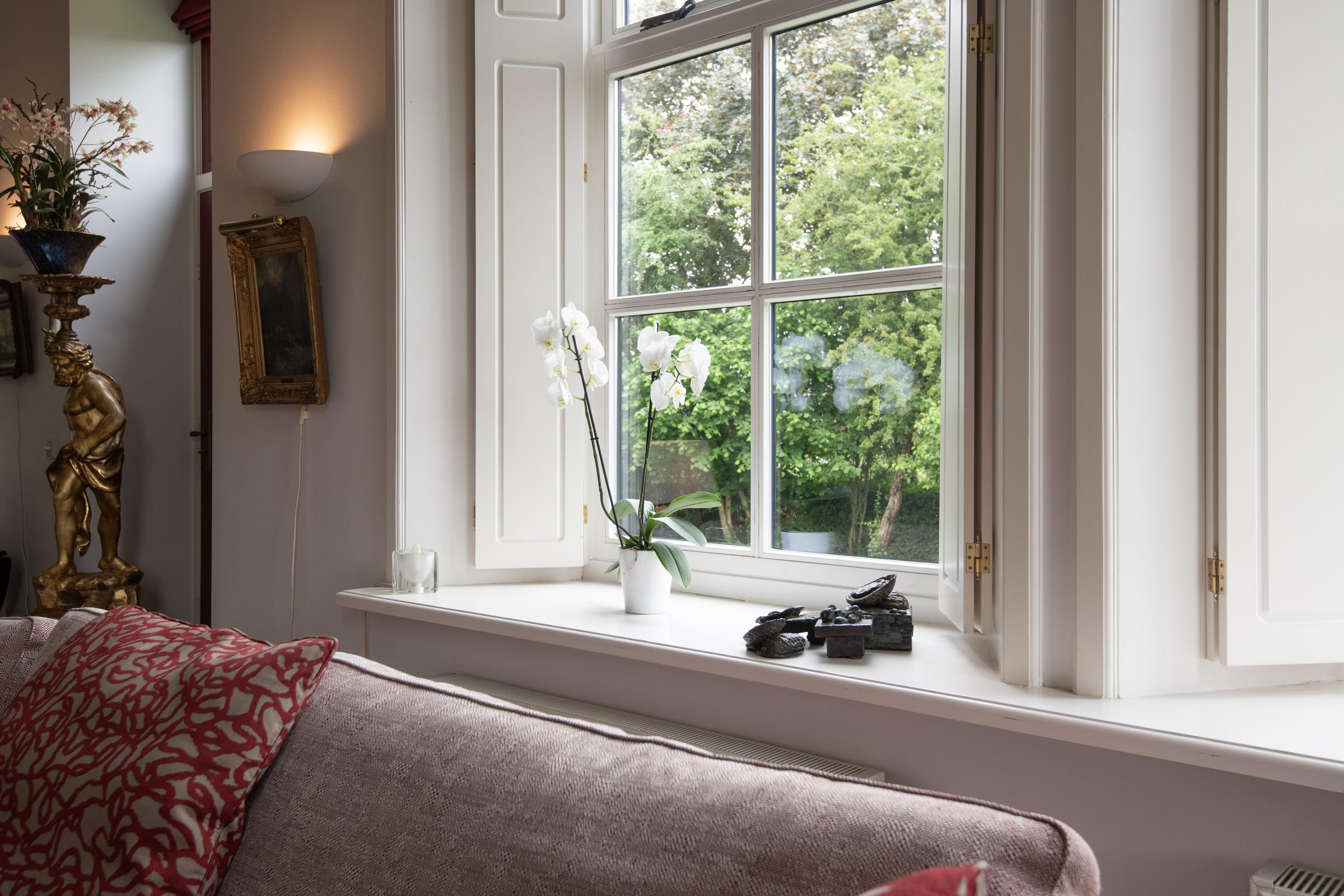 Een 2e woonkamer annex atelierruimte, bibliotheekkamer en een slaapkamer met aangrenzende 3e badkamer in het voorhuis en twee slaapkamers in het achterhuis op de eerste verdieping.
